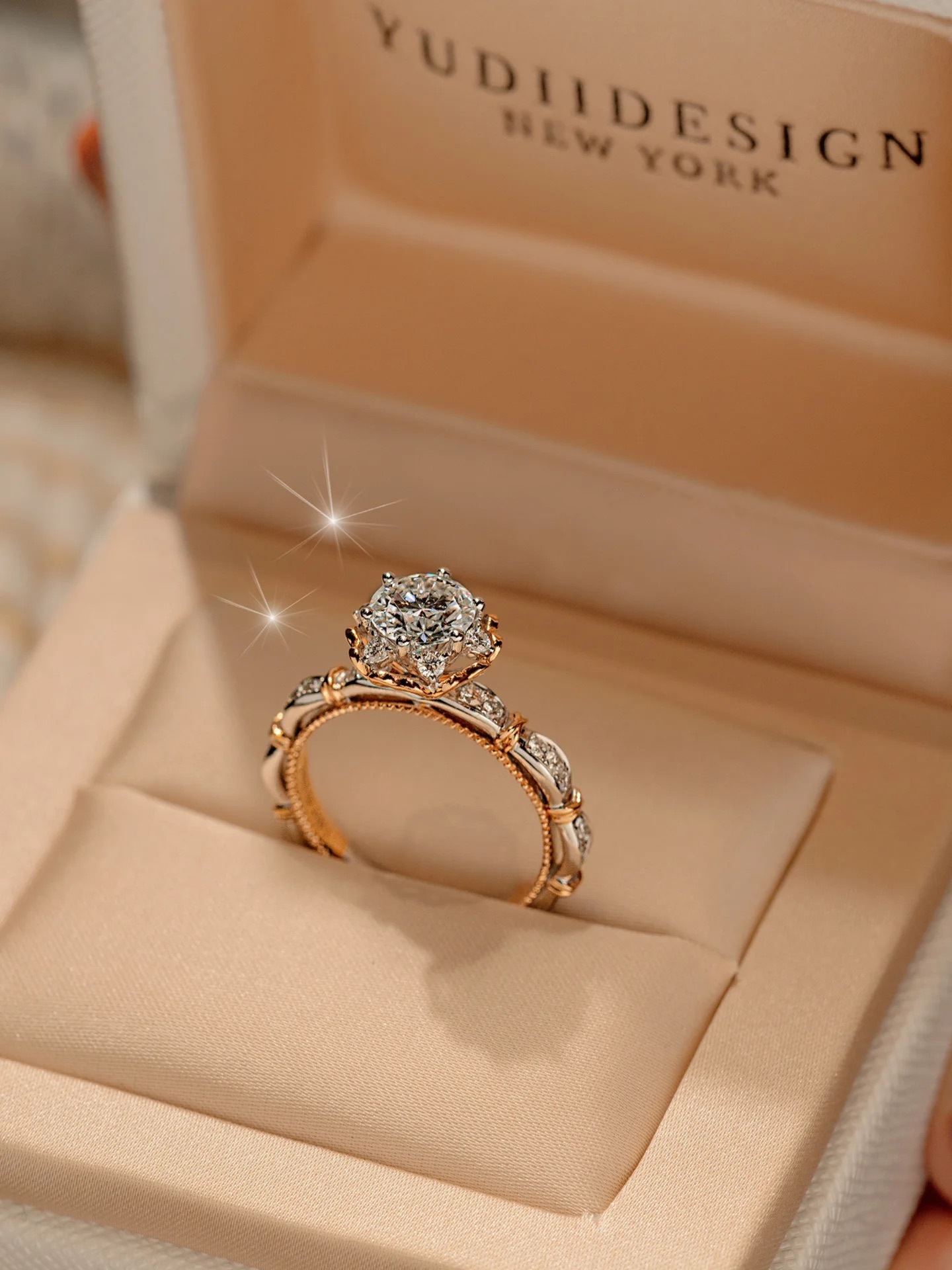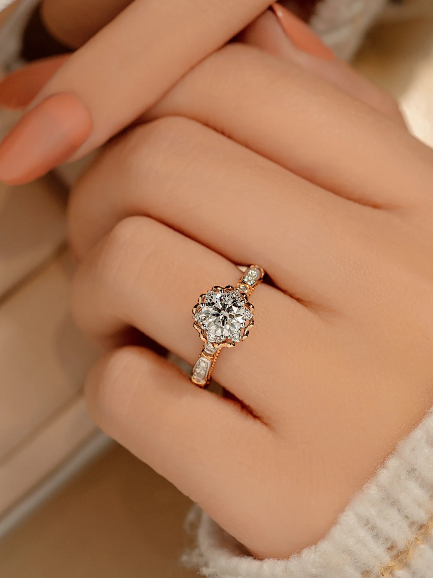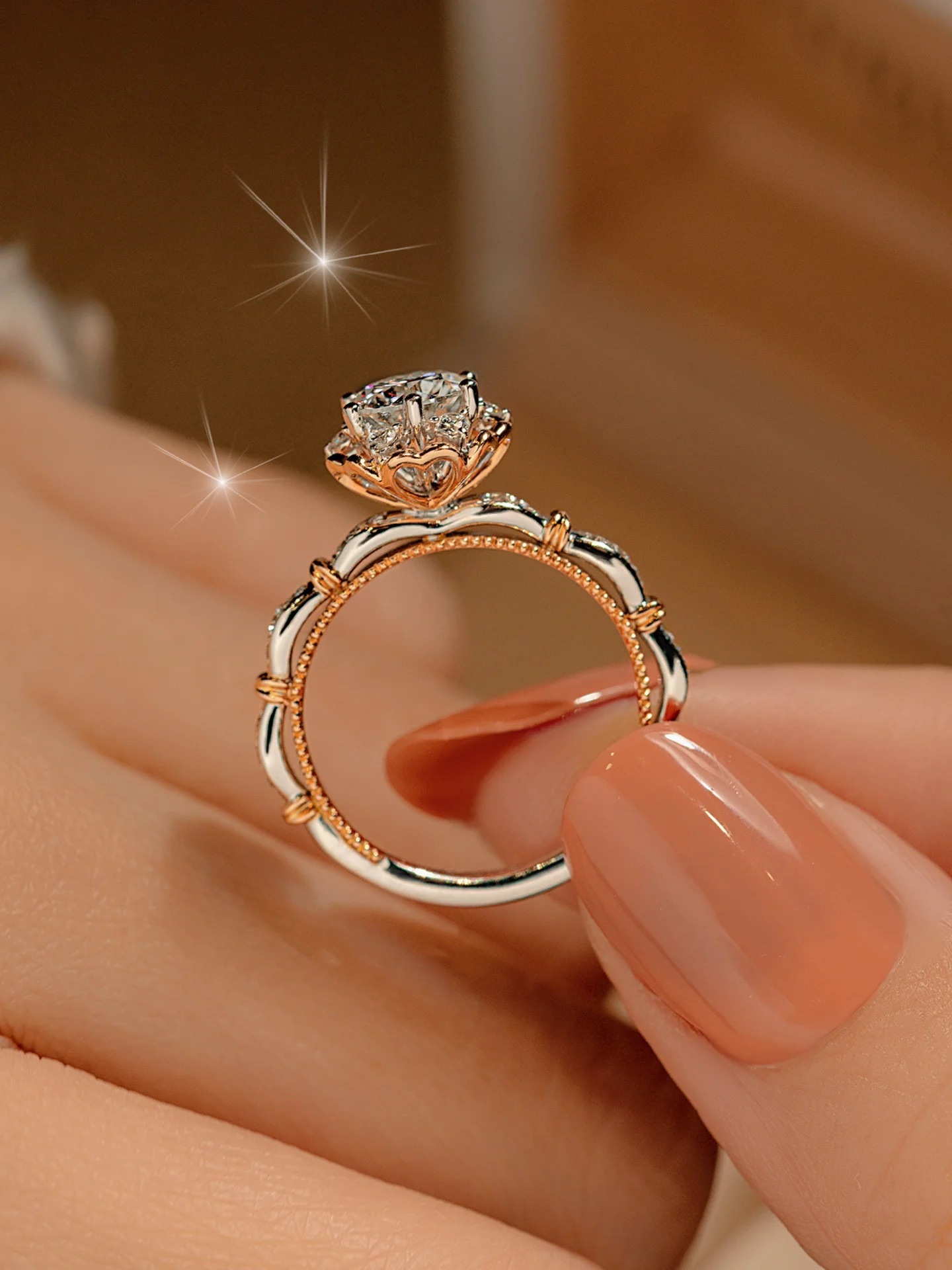 S925 plata esterlina moissanite anillo en forma de corazón Rosa Sosteniendo Flor bolsa redonda anillo de seis garra de lujo 50 puntos para el anillo de bodas