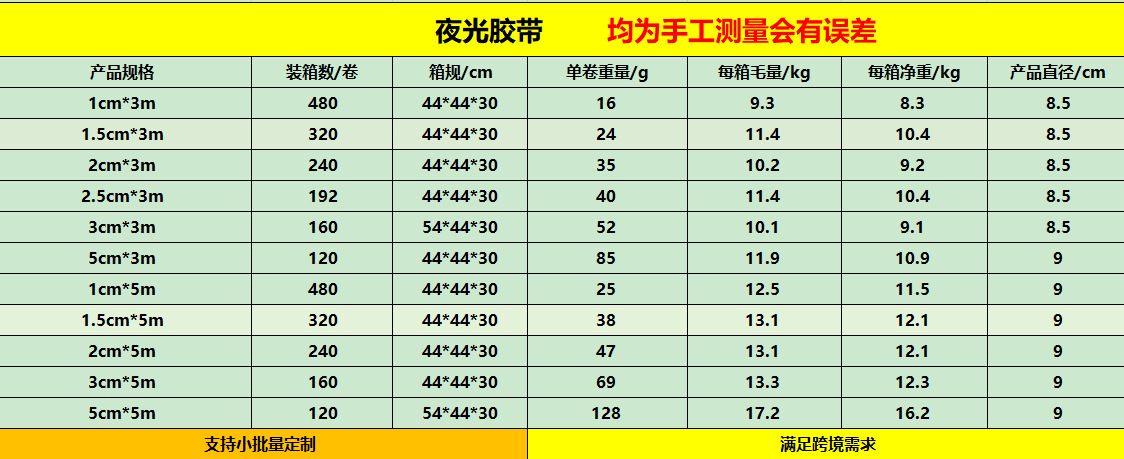 Modelo de especificación1cm de ancho * 3m de largo (480 rollos 1 caja); cinta luminosa-verde,1cm de ancho * 3m de largo (480 rollos 1 caja); cinta luminosa-azul cielo,1cm de ancho * 3m de largo (480 rollos 1 caja); cinta luminosa-rojo anaranjado,1cm de ancho * 3m de largo (480 rollos 1 caja); cinta luminosa-verde oscuro,1.5cm de ancho * 3m de largo (320 rollos 1 caja); cinta luminosa-verde,2cm de ancho * 3m de largo (240 rollos 1 caja); cinta luminosa-verde,2.5cm de ancho 3m de largo (192 rollos 1 caja); cinta luminosa-verde,3cm de ancho * 3m de largo (160 rollos 1 caja); cinta luminosa-verde,5cm de ancho * 3m de largo (120 rollos 1 caja); cinta luminosa-verde,1cm de ancho * 5m de largo (480 rollos 1 caja); cinta luminosa-verde,2cm de ancho * 5m de largo (240 rollos 1 caja); cinta luminosa-verde,3cm de ancho * 5m de largo (160 rollos 1 caja); cinta luminosa-verde,5cm de ancho * 5m de largo (120 rollos 1 caja); cinta luminosa-verde