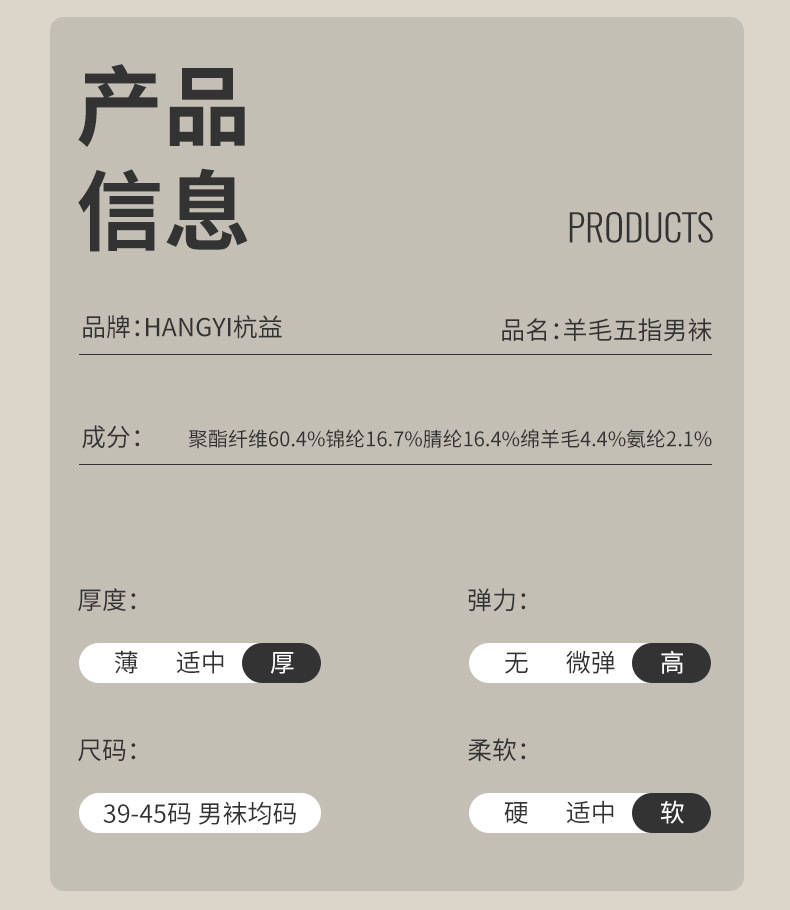 | Composición y contenido | Fibra de poliéster 60.4% nylon 16.7% acrílico 16.4% lana 4.4% spandex 2,15 |