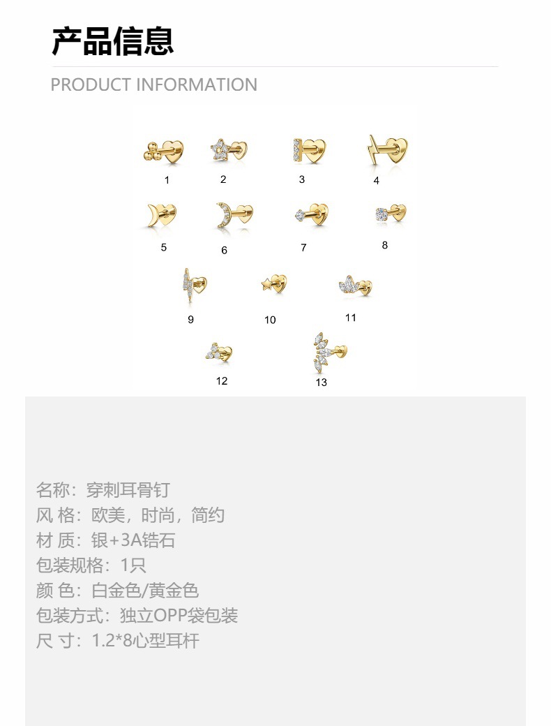 Europa y América Venta caliente s925 plata esterlina ins estilo simple diamante-incrustado personalidad cartílago piercing amor hilo piercing oído hueso uñas