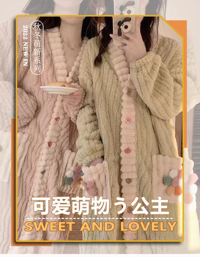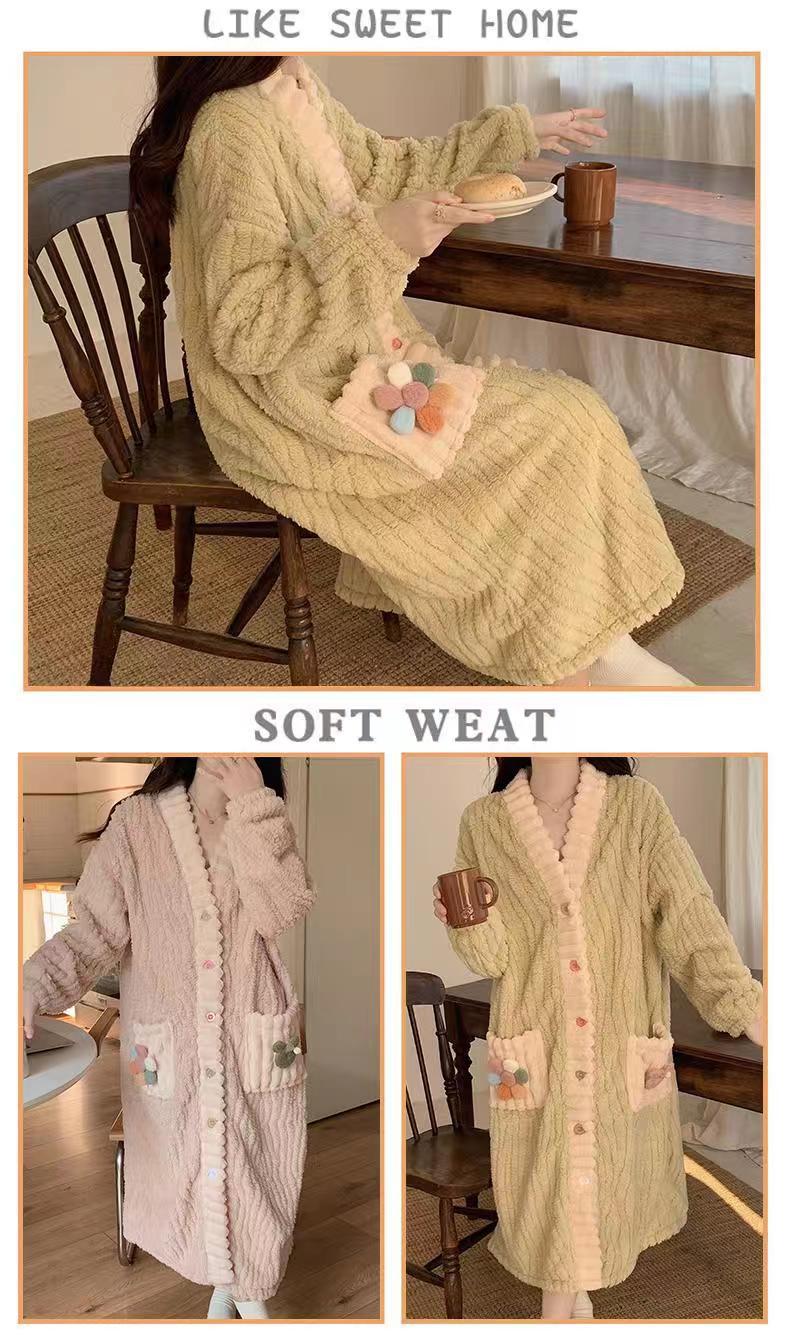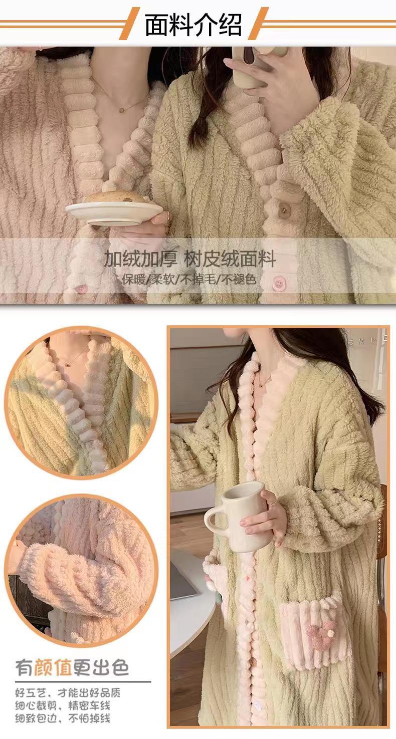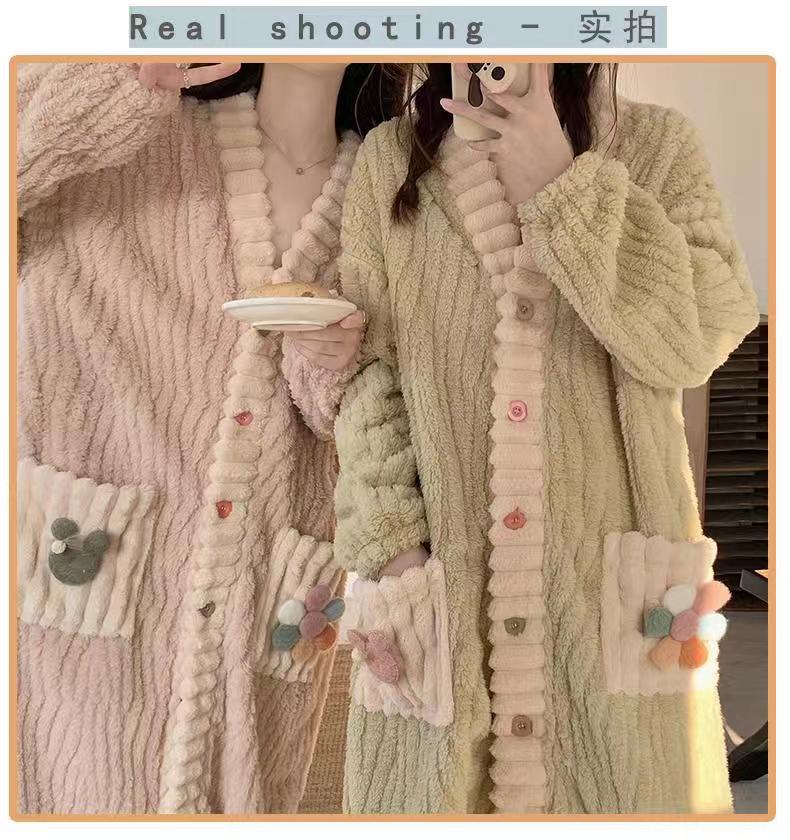 Camisón de terciopelo coral para mujer, estilo largo para otoño e invierno, bata de franela gruesa y forrada de lana, pijamas de invierno, ropa para estar en casa, sencillo y casual.