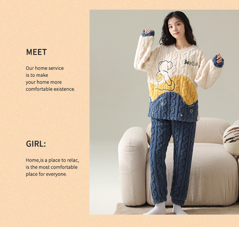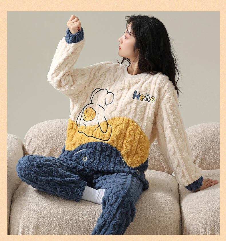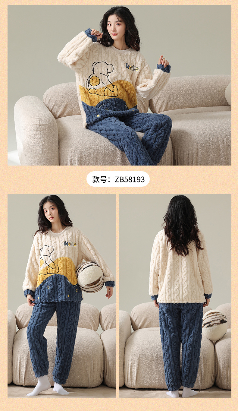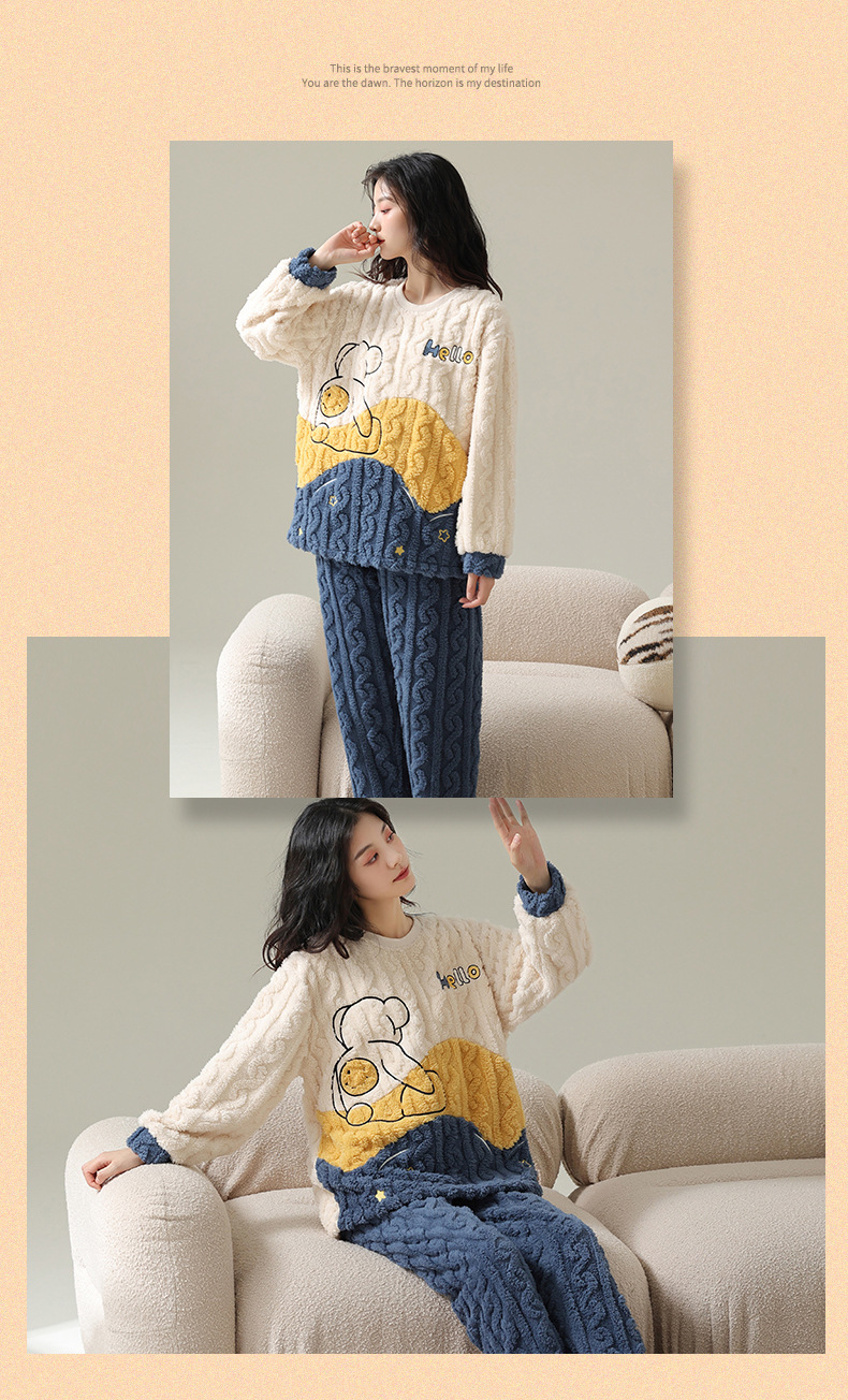 Pijamas de vellón de coral para mujer Otoño e Invierno engrosada franela forrada de vellón ropa para el hogar traje de dos piezas para mujer dibujos animados lindo