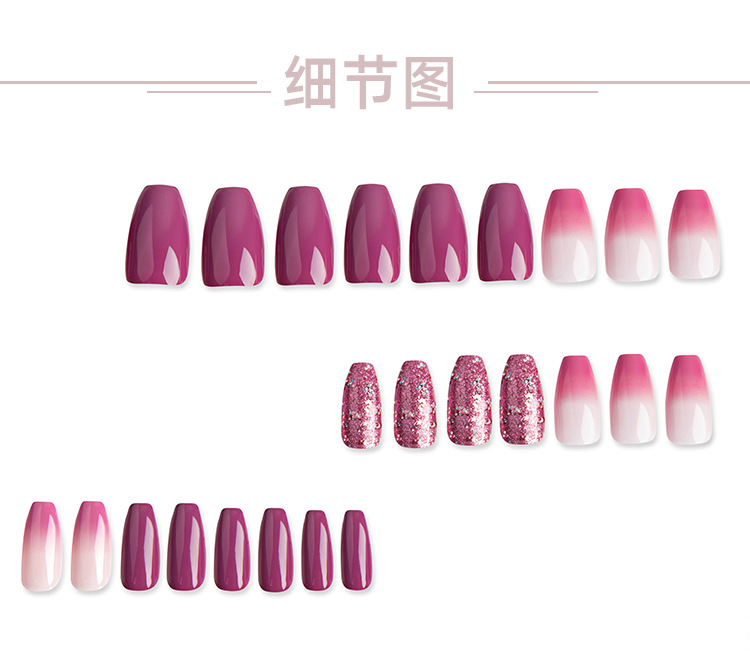 Desgaste de uñas púrpura pieza de uñas al por mayor Rosa degradado púrpura brillo corto pieza de uñas pieza de belleza de uñas acabado de uñas