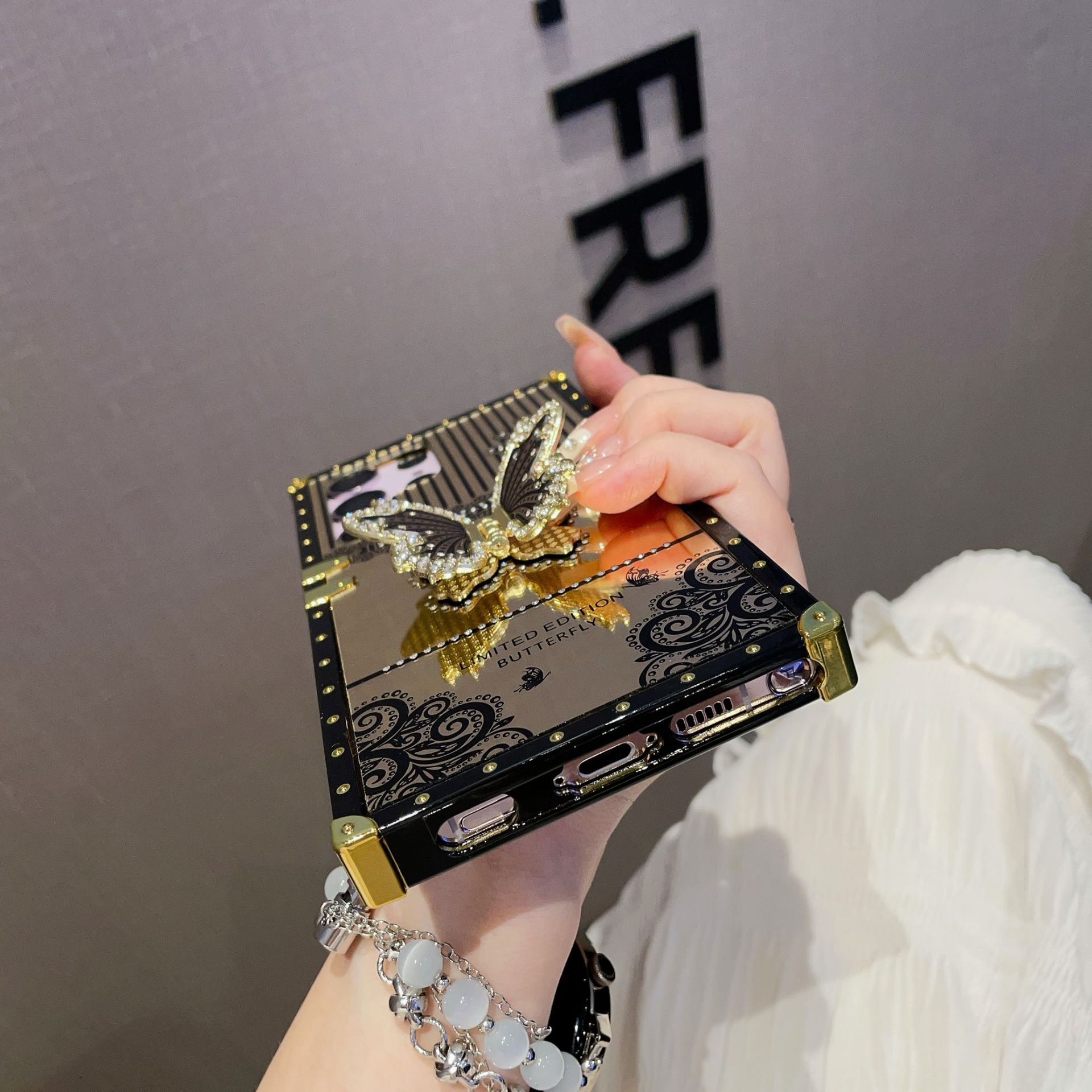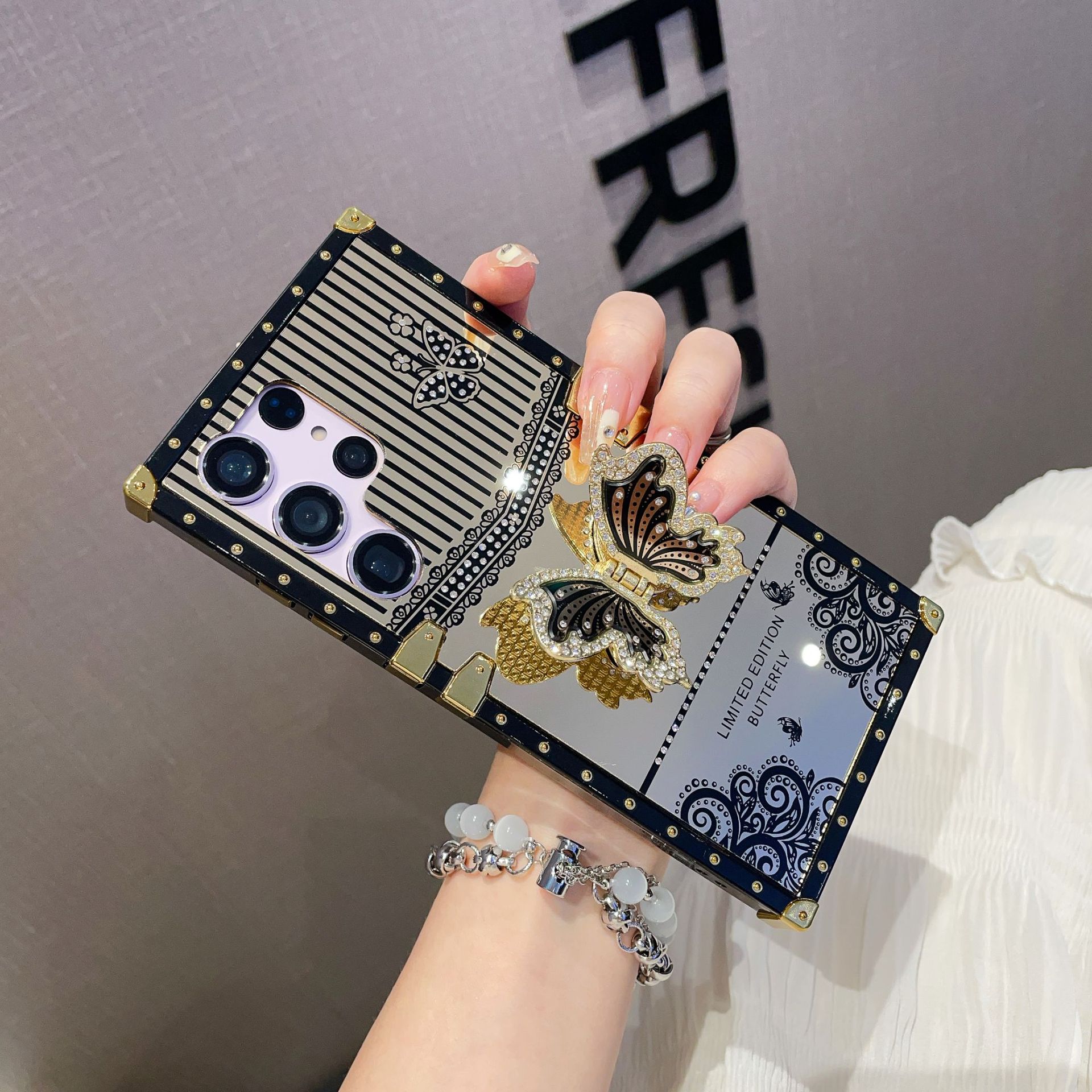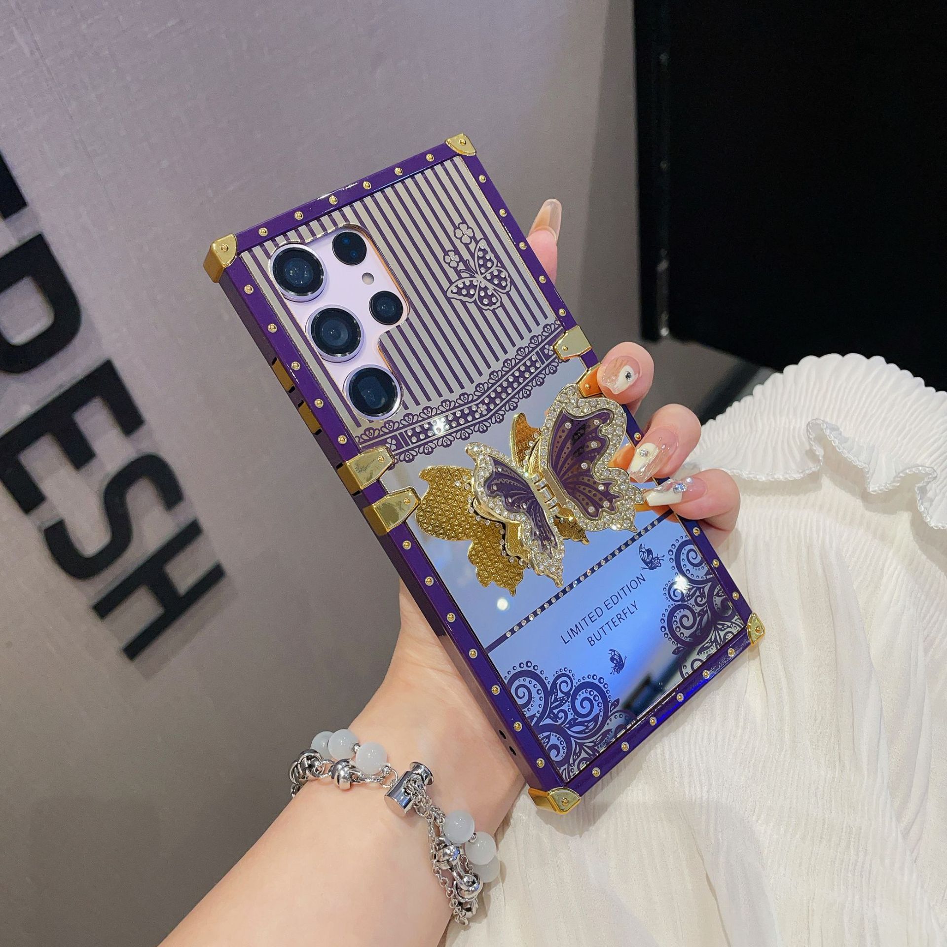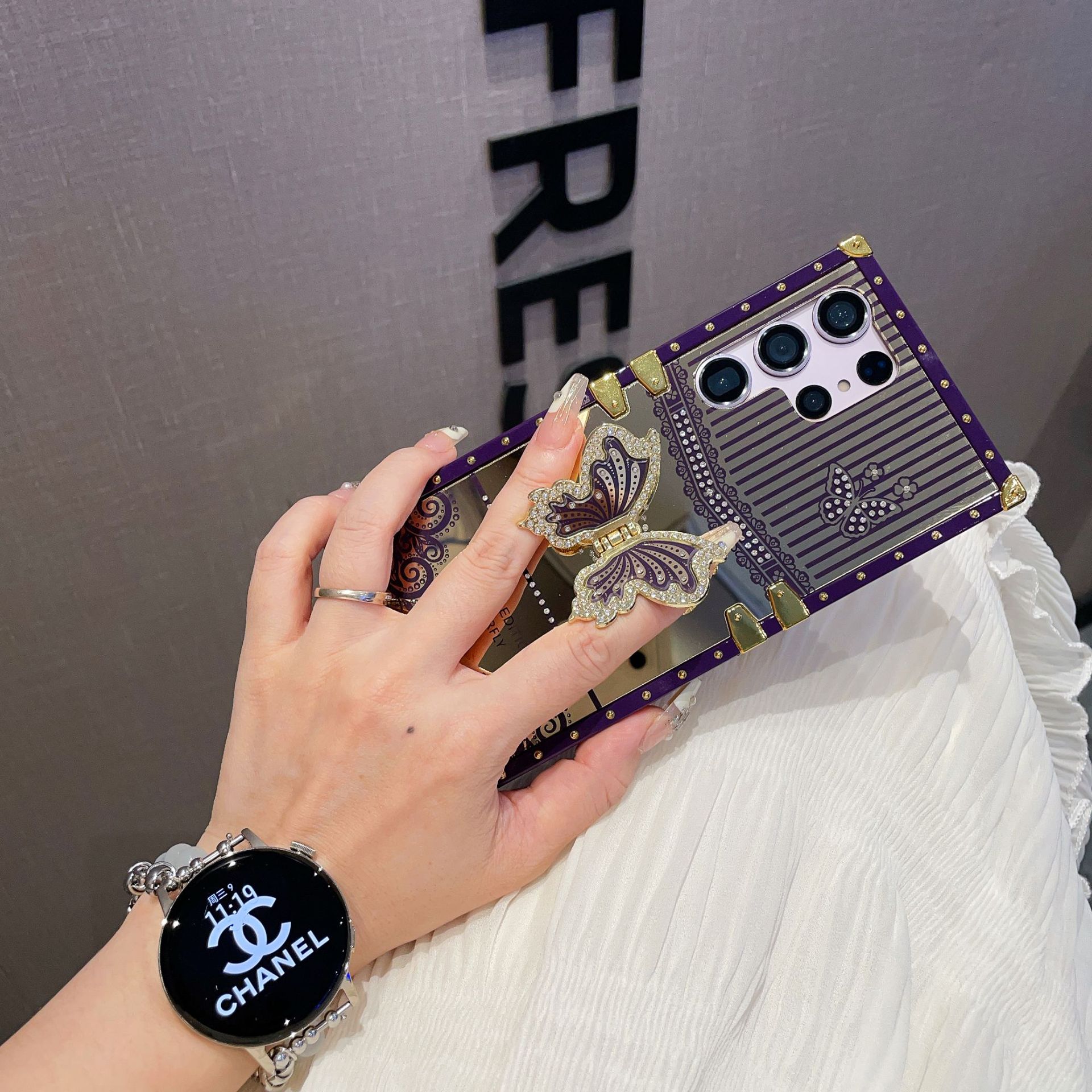 Adecuado para Samsung S24 mariposa diamante-incrustado soporte teléfono caso A73 maquillaje espejo pasarela cuadrado caso protector avanzado