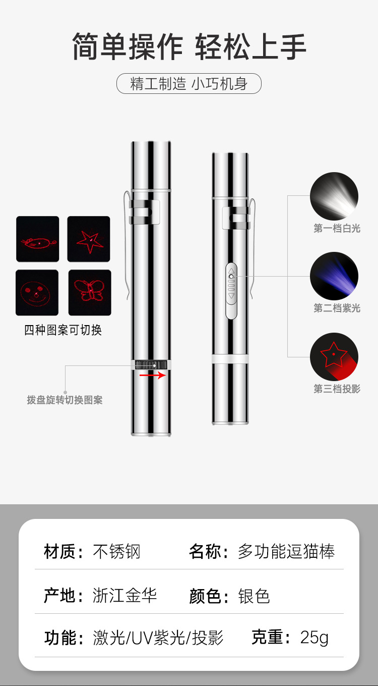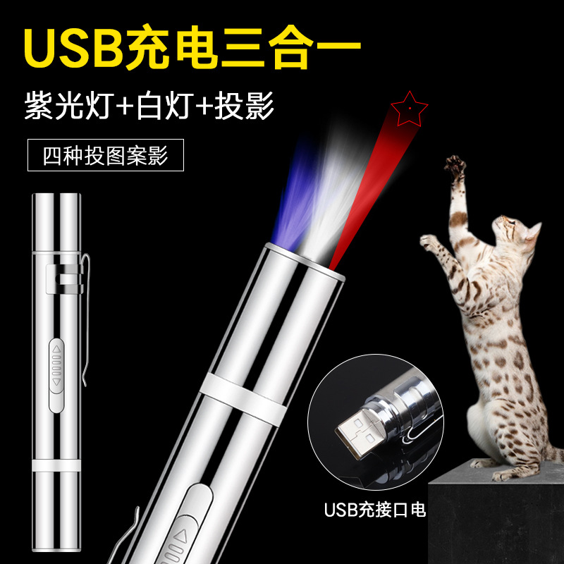 Venta caliente ventas directas de la fábrica para mascotas gato divertido palo USB Multi-patrón láser divertido gato juguete lámpara de iluminación detector de dinero
