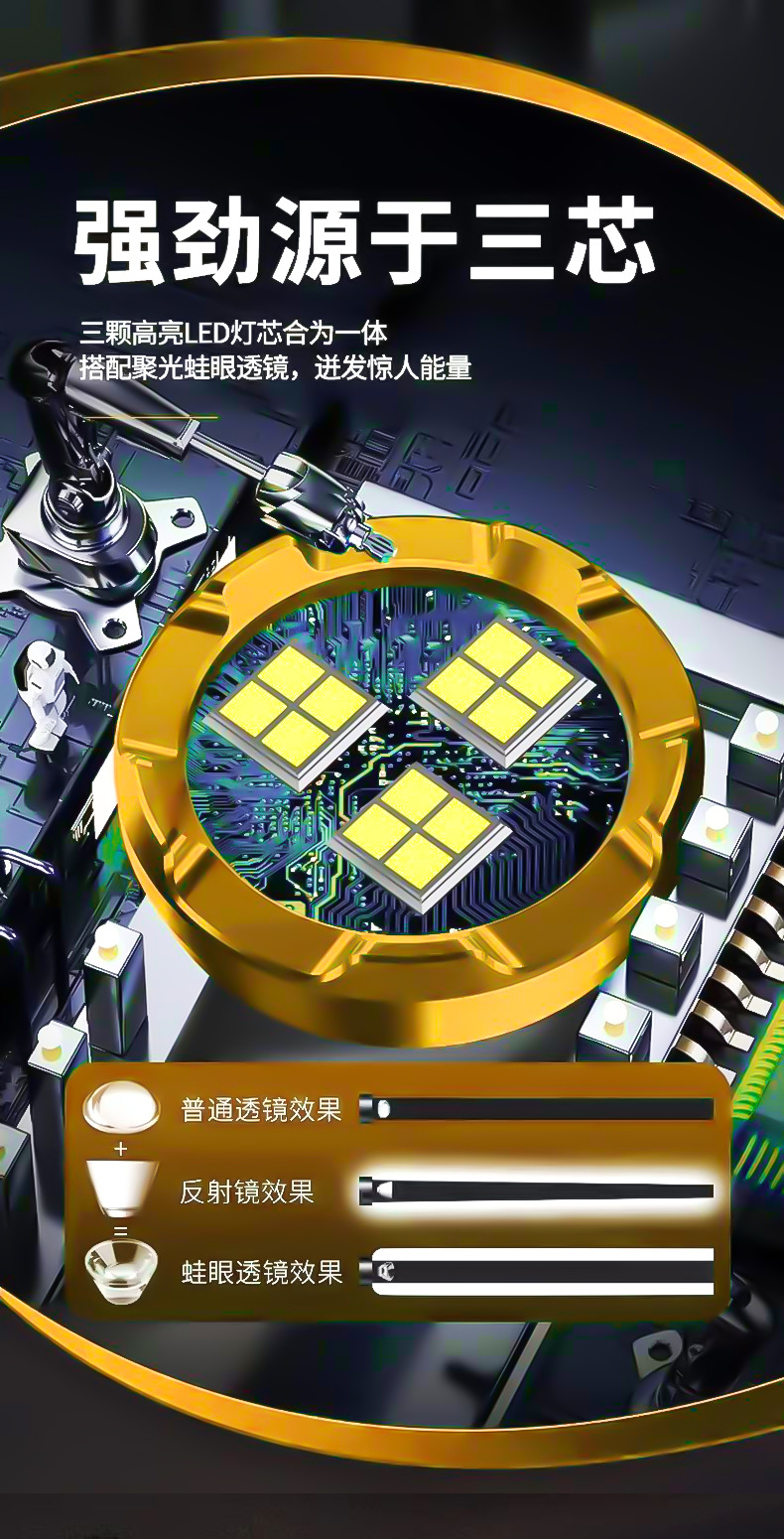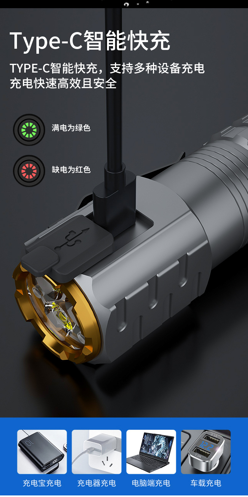 Tiktok caliente TYP-C de tres ojos al aire libre aleación linterna portátil fuerte luz pequeña pistola de acero mini linterna impermeable