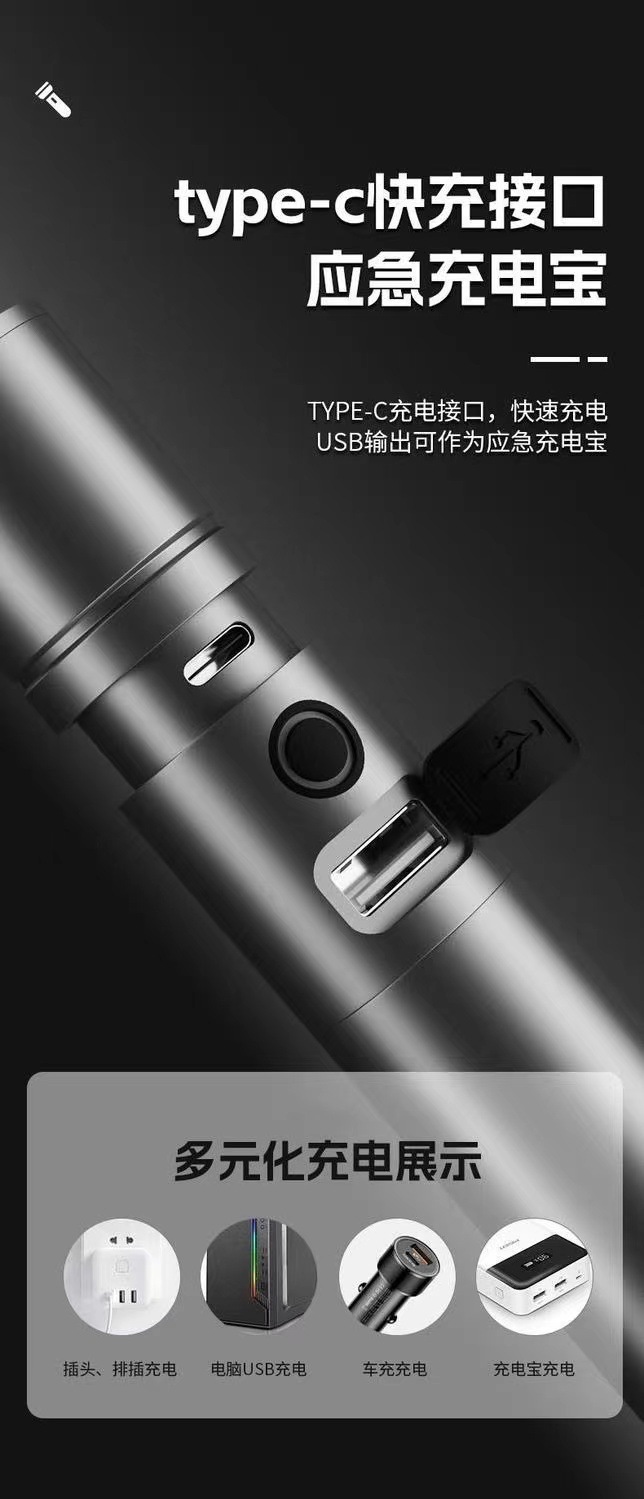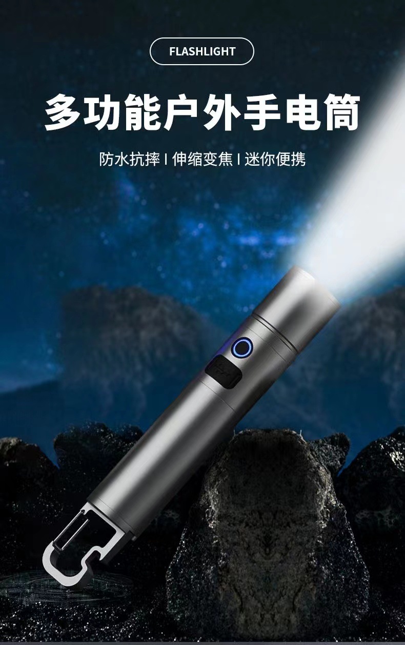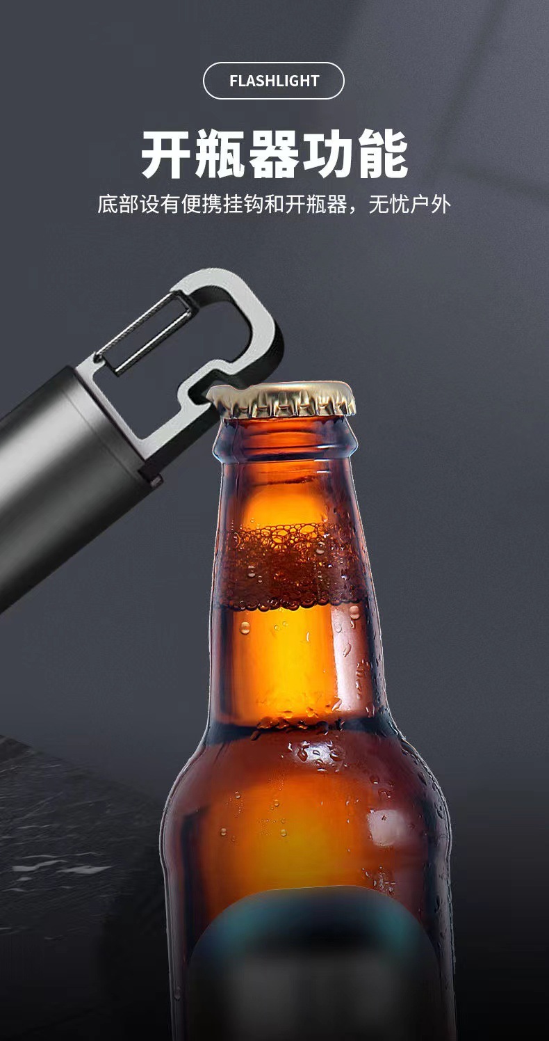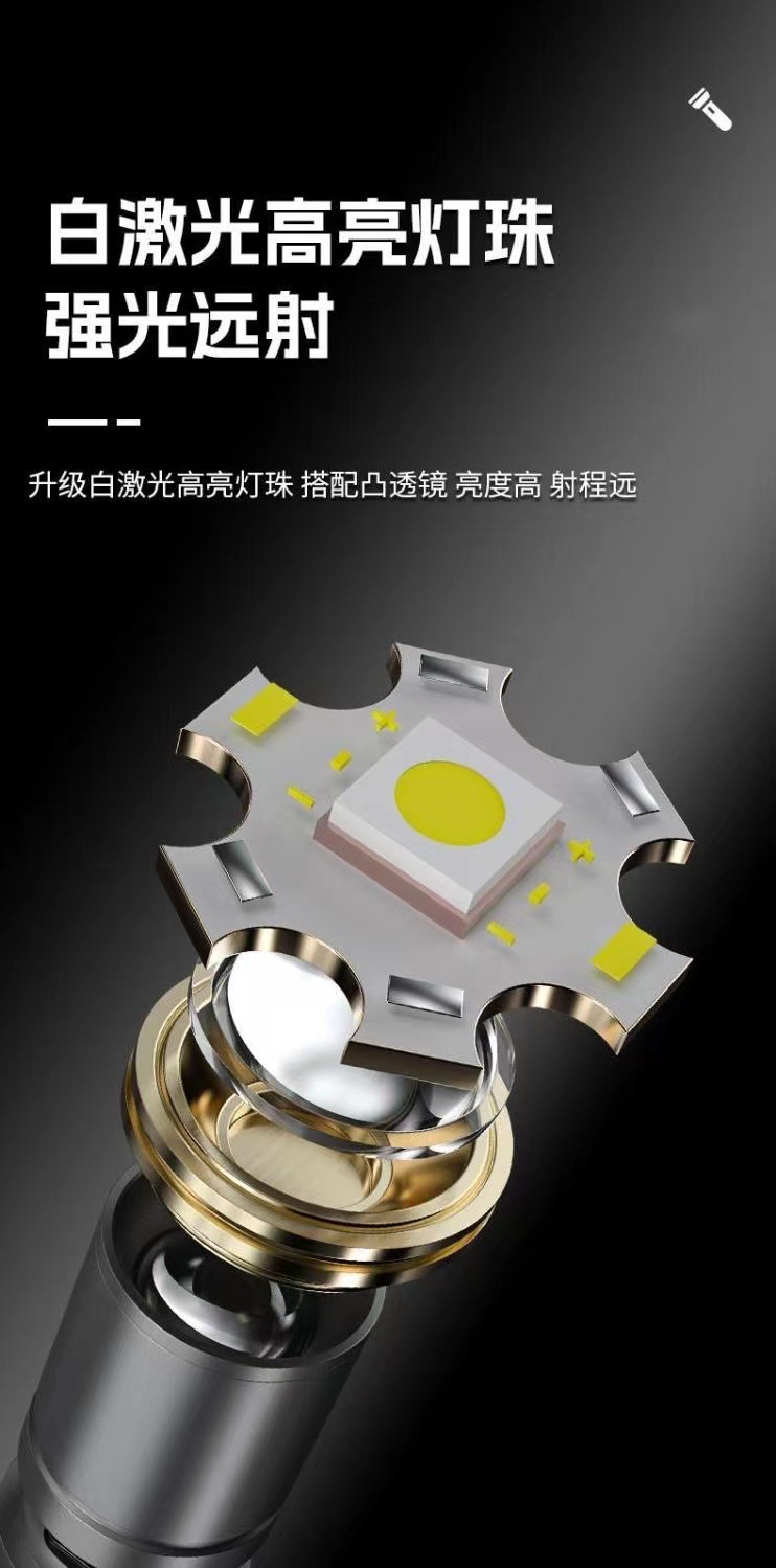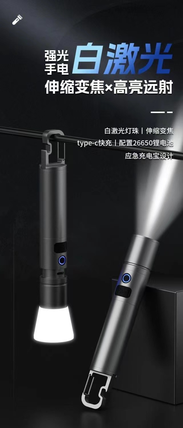 Nueva linterna láser blanca con zoom telescópico, función de banco de energía USB, gancho, abrebotellas, largo alcance y alto brillo