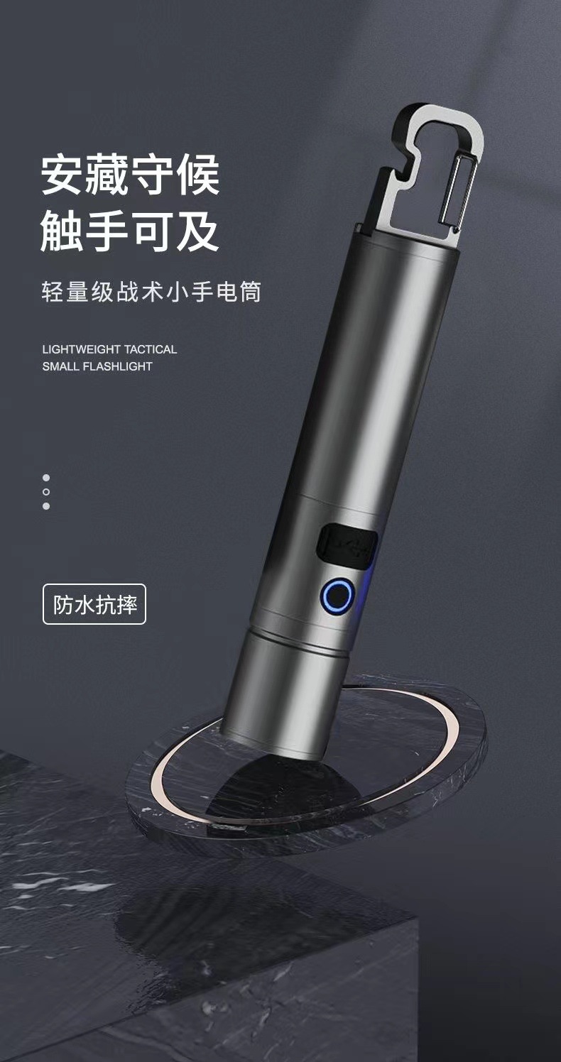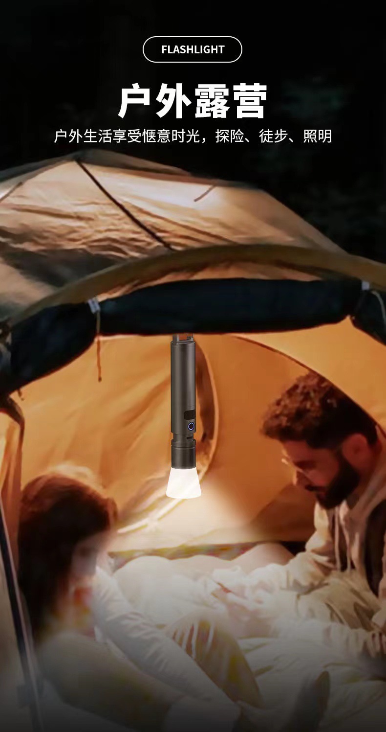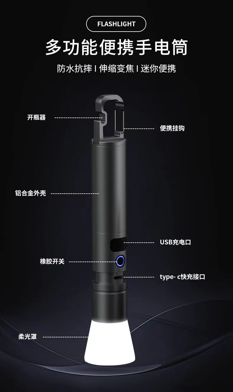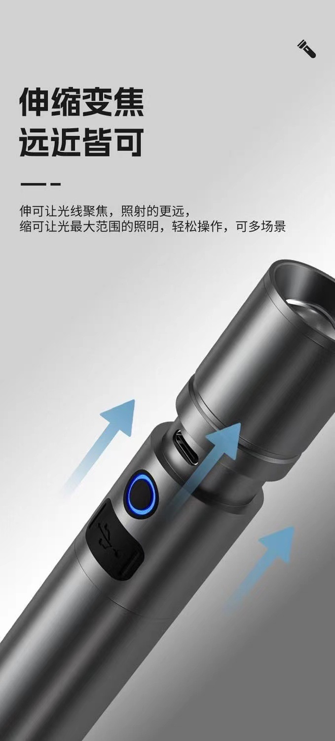 Nueva linterna láser blanca con zoom telescópico, función de banco de energía USB, gancho, abrebotellas, largo alcance y alto brillo