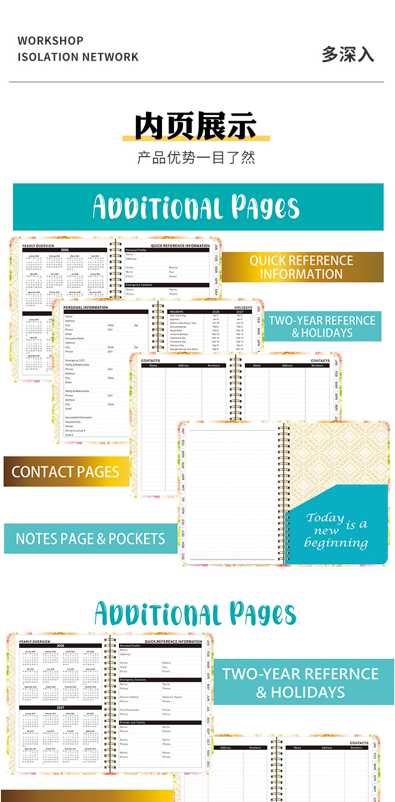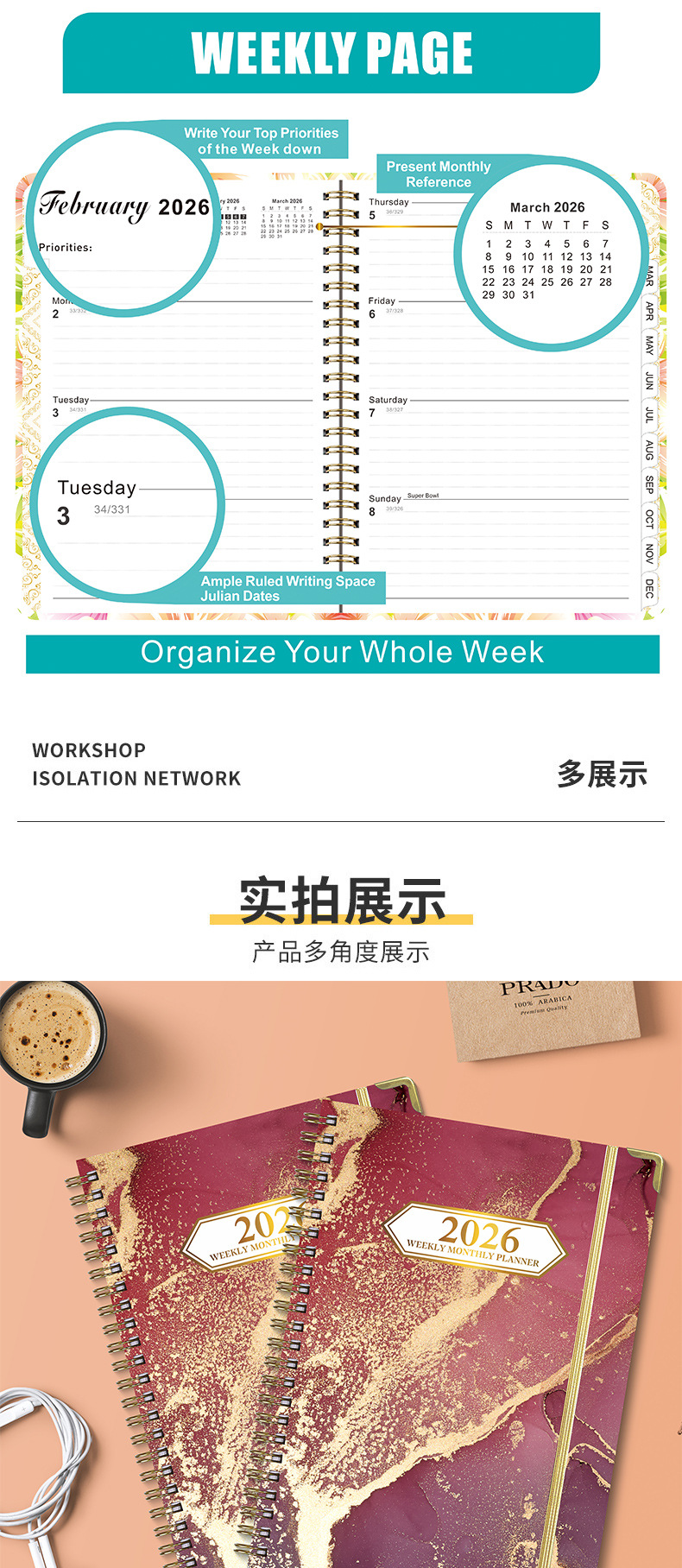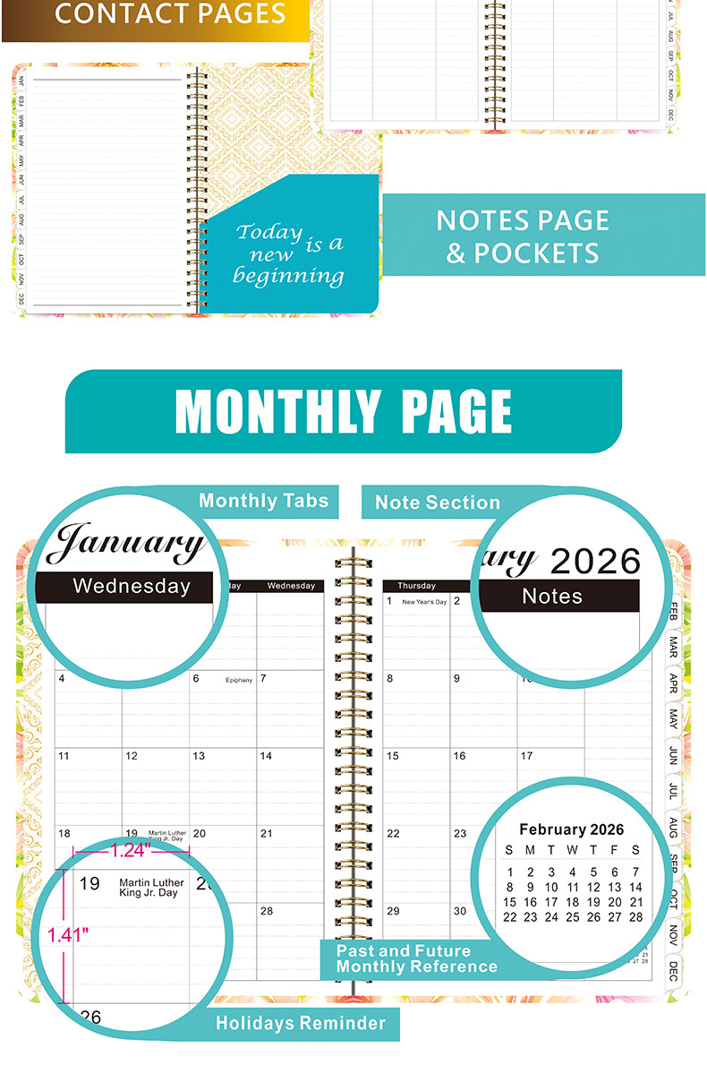 Agenda A5 transfronteriza de 26 años con páginas separadas para planificación de trabajo, registro de entrada, cuaderno de espiral en inglés.