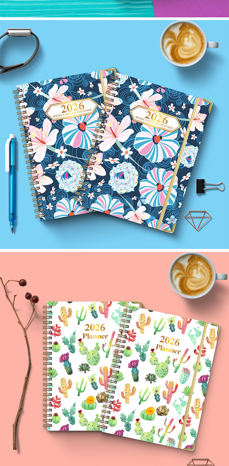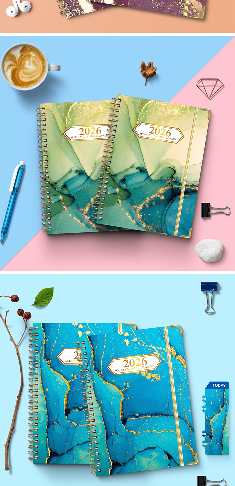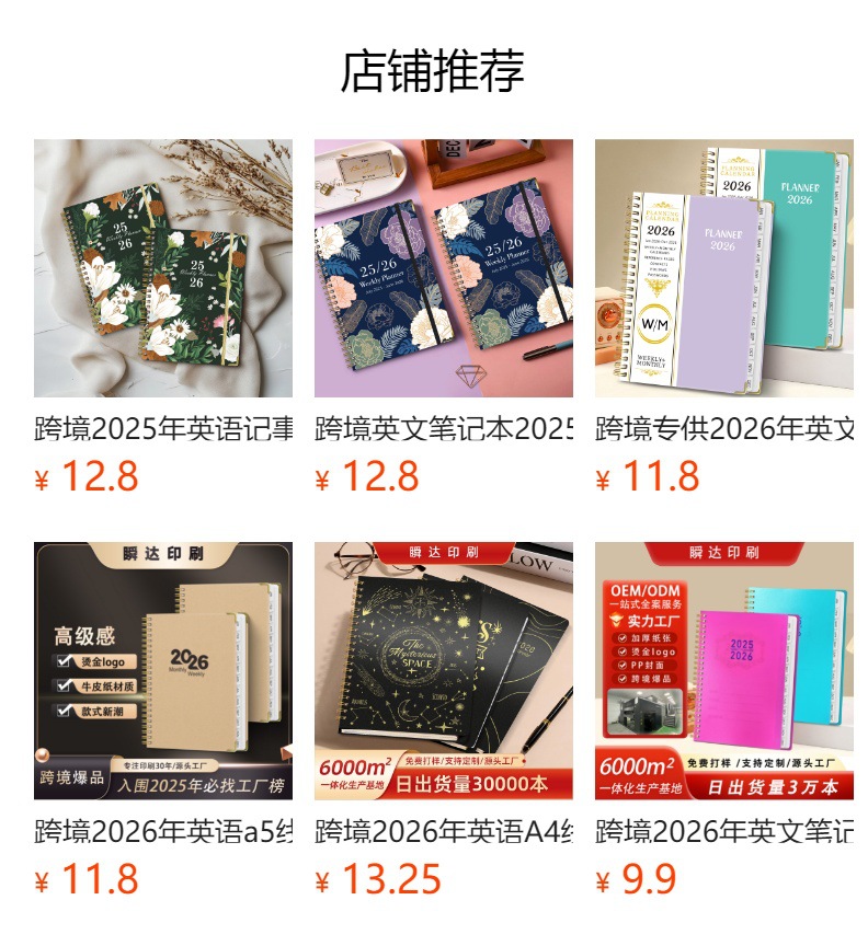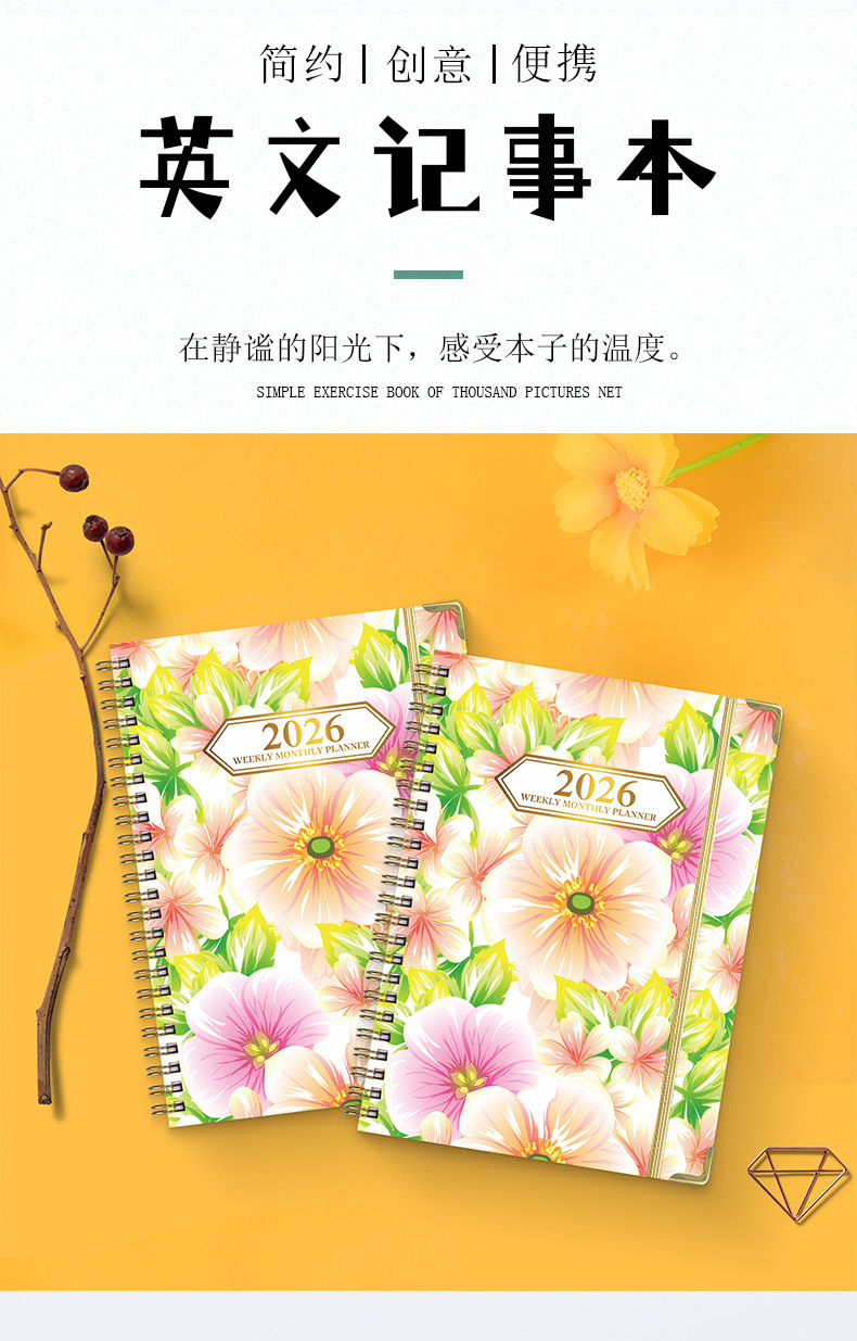 Agenda A5 transfronteriza de 26 años con páginas separadas para planificación de trabajo, registro de entrada, cuaderno de espiral en inglés.