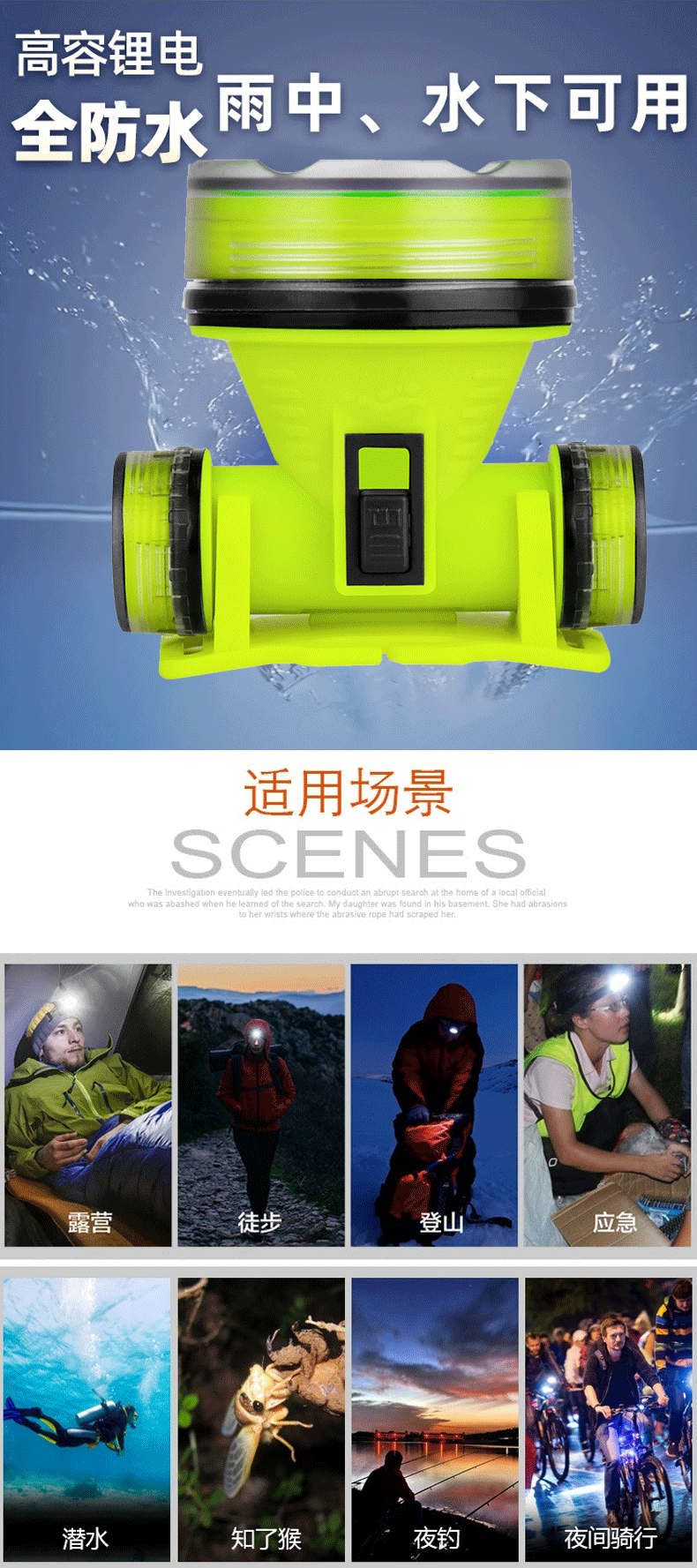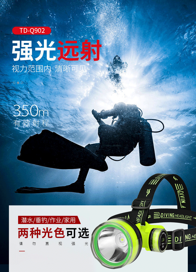 Faro de buceo profundo transfronterizo luz fuerte pesca de largo alcance montada en la cabeza iluminación subacuática pesca IPX8 nivel impermeable recargable