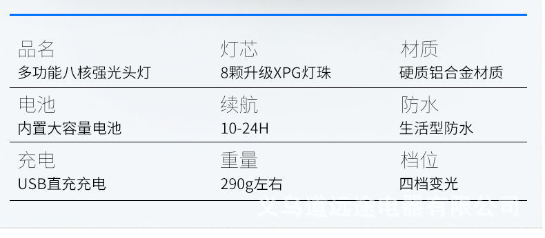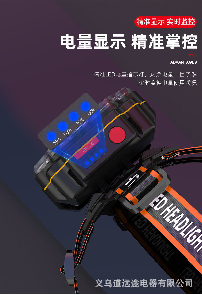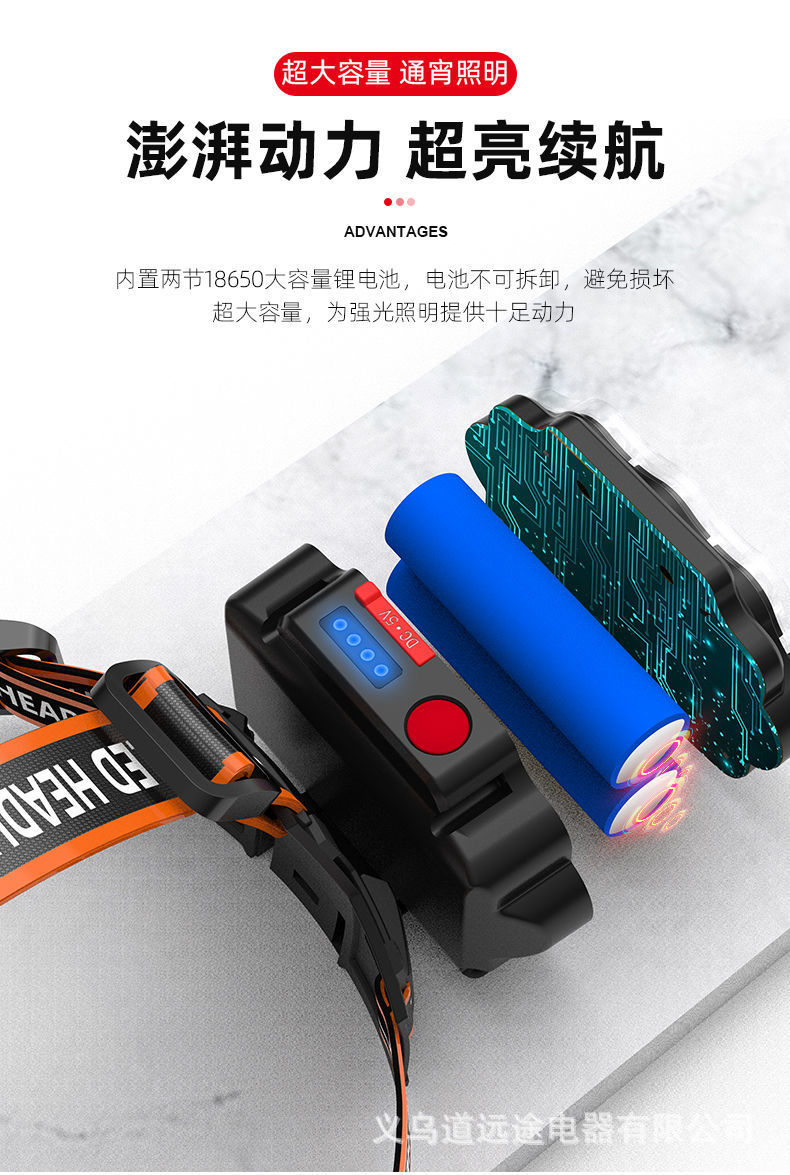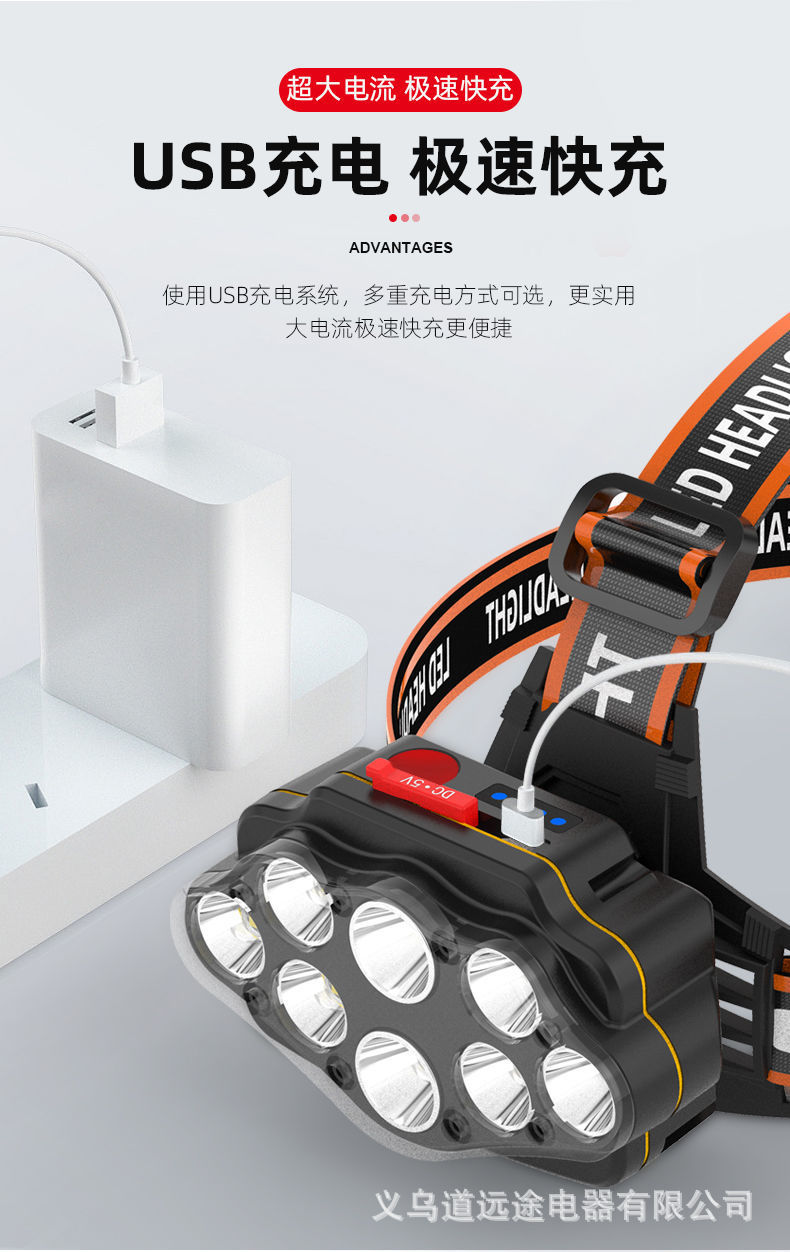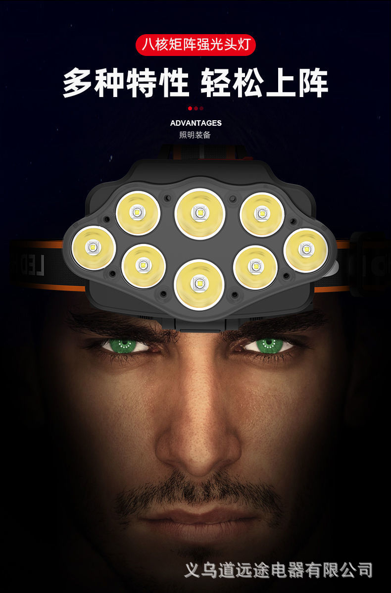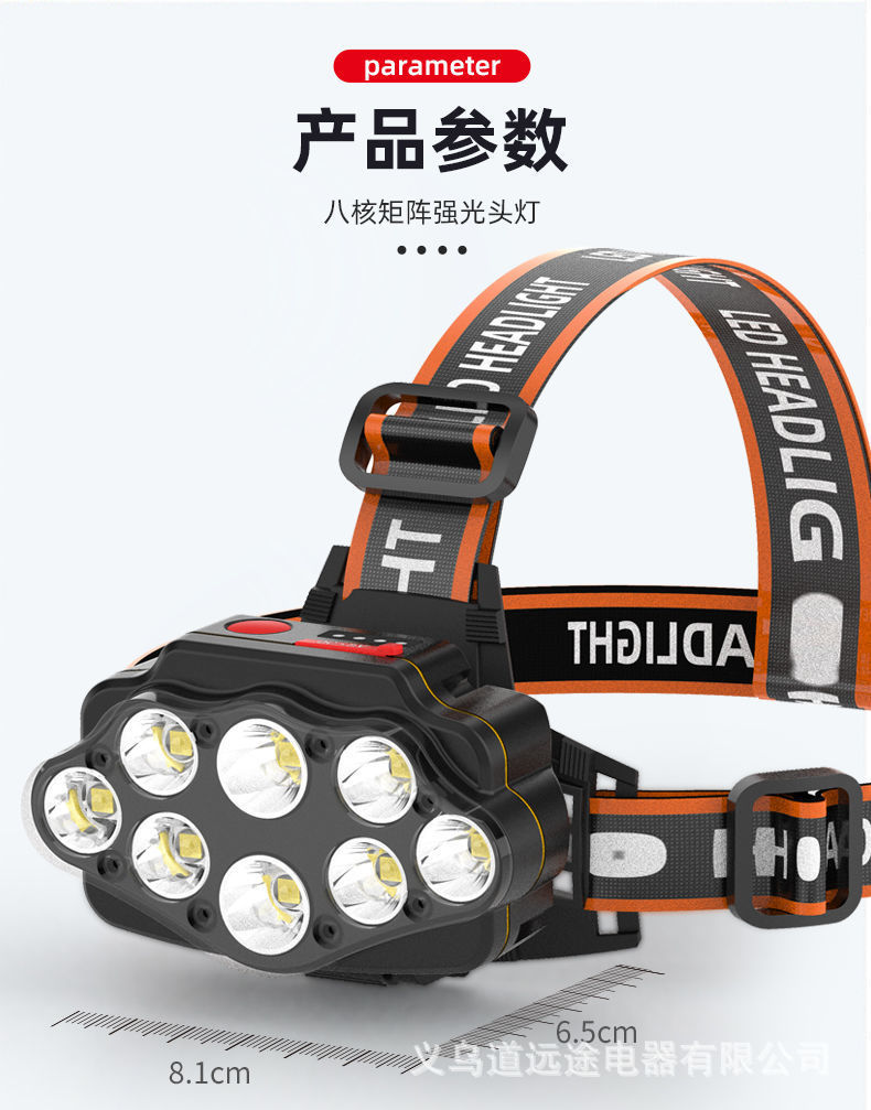 Ocho cabezas núcleo nuclear fuerte luz súper brillante faro USB recargable al aire libre ultra-larga espera de doble batería de litio linterna montada en la cabeza