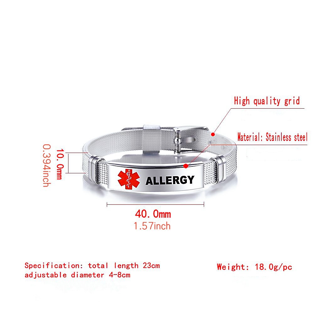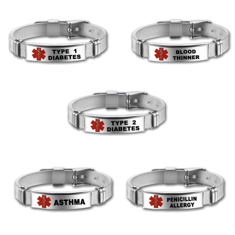 | Colores | TYPE 2 (pulsera),TYPE 1 (pulsera),BLOOD THINNER (Pulsera),ASTHMA (pulsera),PENICILLIN ALLERGY (Pulsera),Grabado |