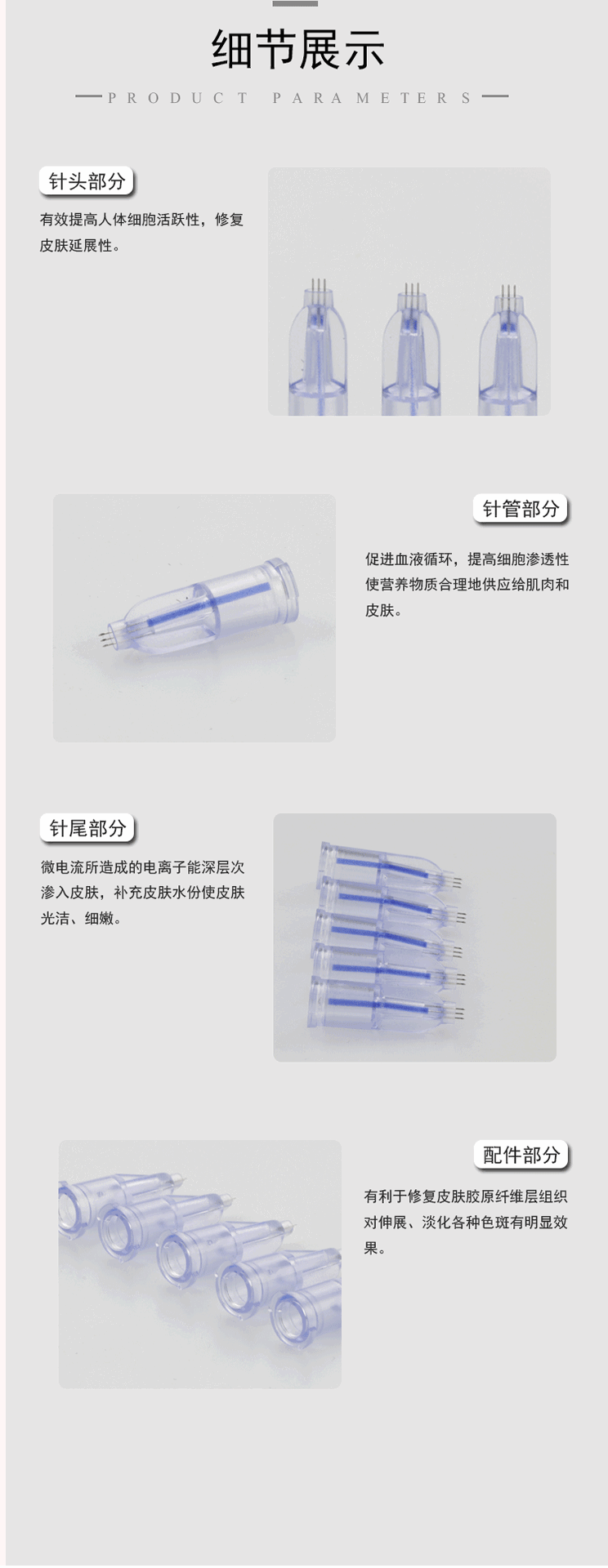 | Colores | Tres agujas 33G--1,0 mm,Tres agujas 33G--1,2 mm,Tres agujas 33G--1,5 mm,34G de cuatro pines: 1,2 mm |