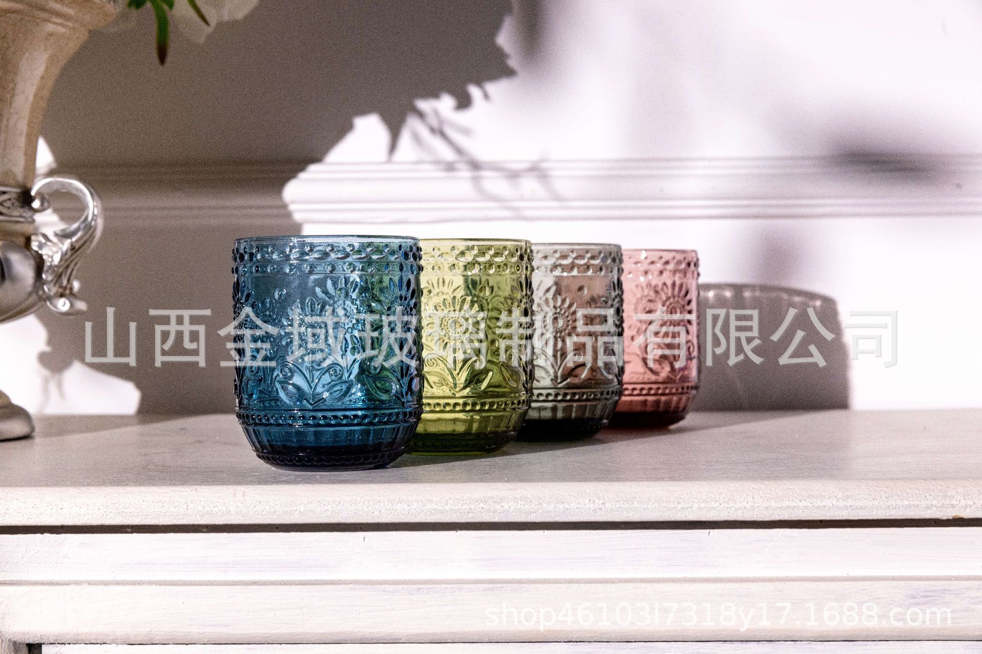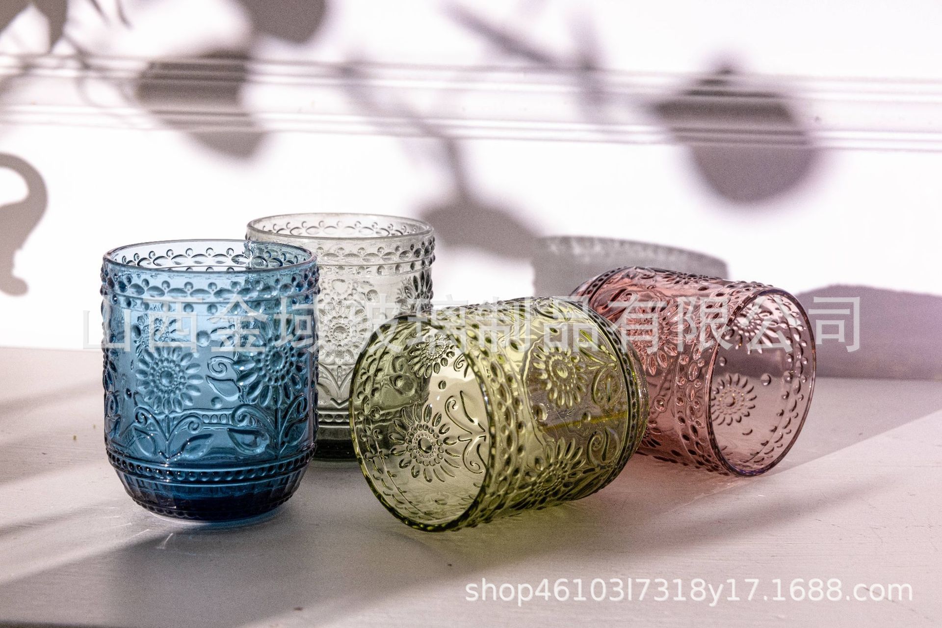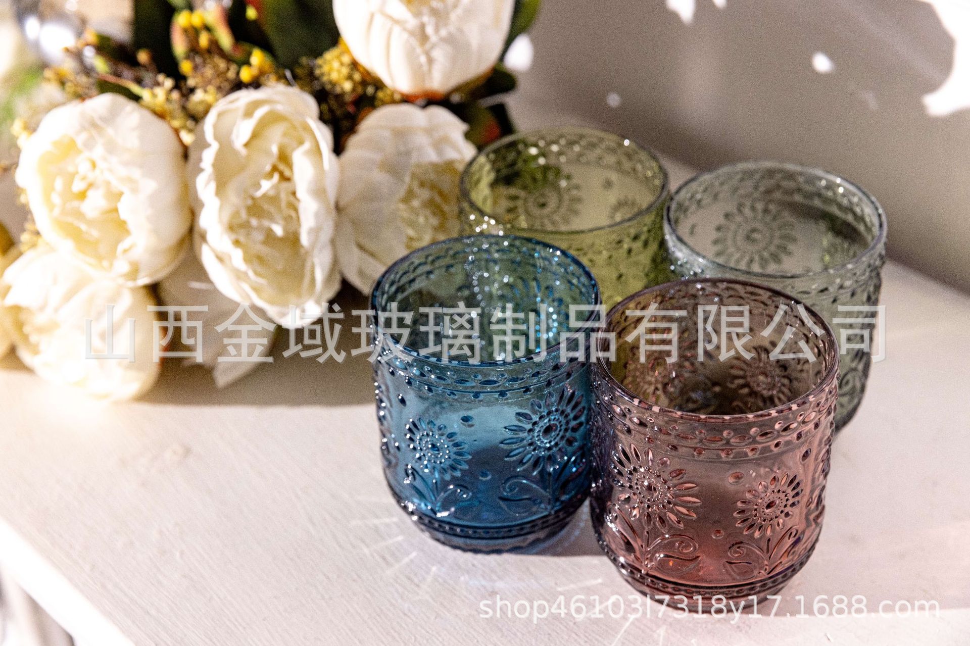 Taza de agua de vidrio con patrón de color de flor de sol en relieve retro al por mayor, taza de jugo de leche para el hogar de girasol, taza de bebida fría