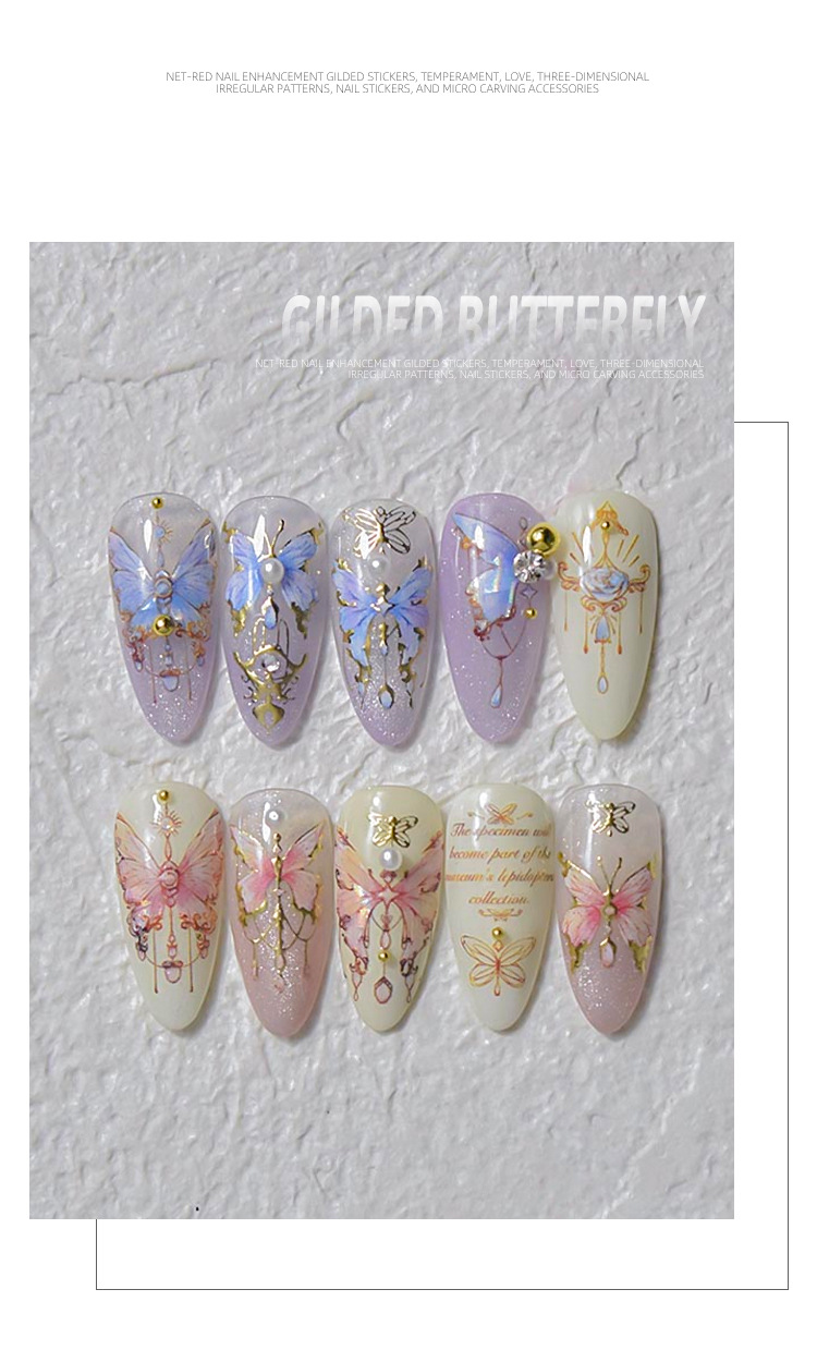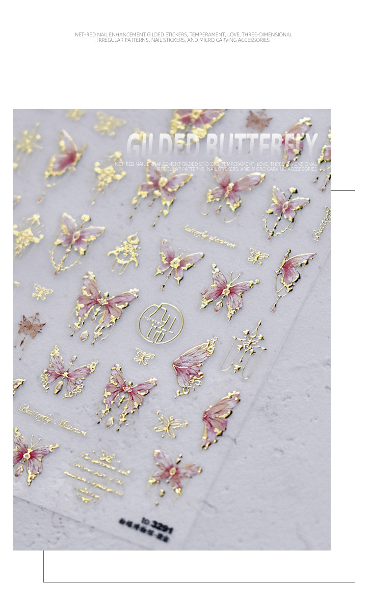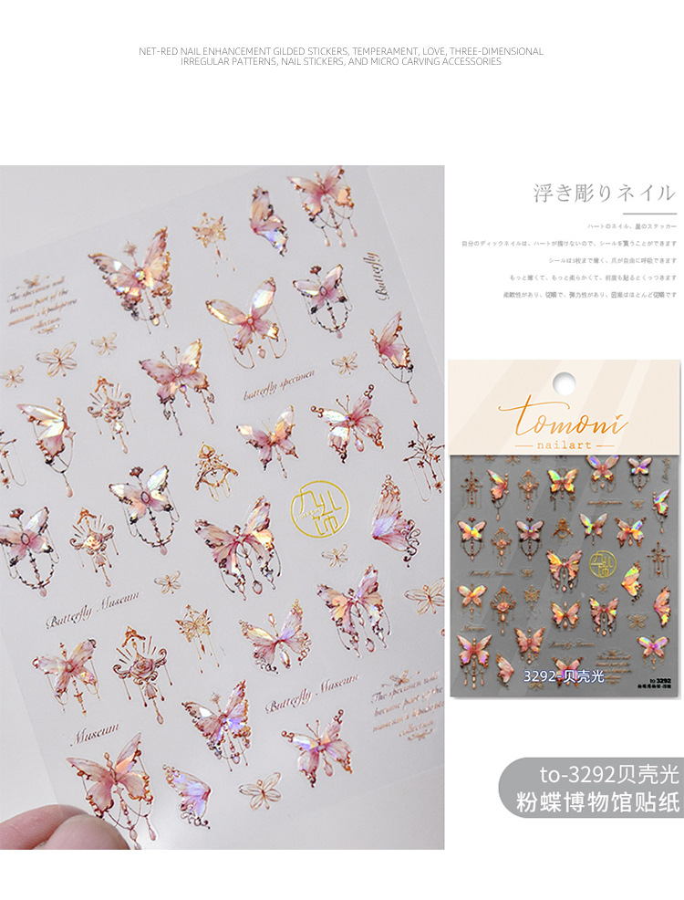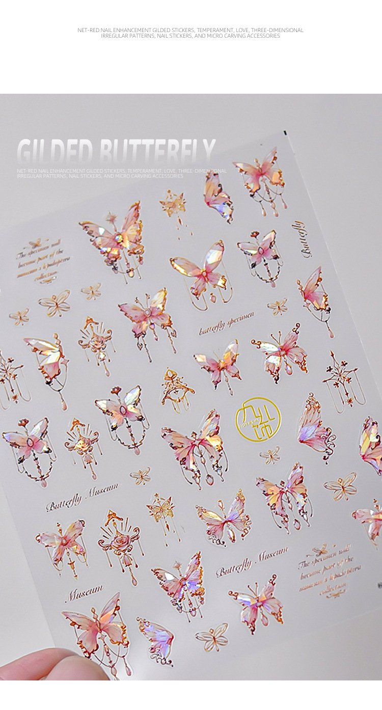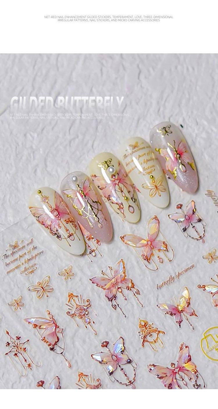 Pegatinas de uñas doradas populares pegatinas de uñas lindas japonesas alivio de fábrica mariposa tridimensional Shell luz Rosa mariposa al por mayor