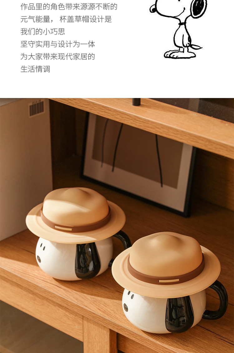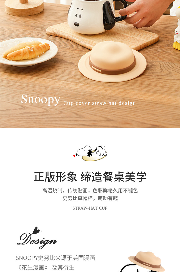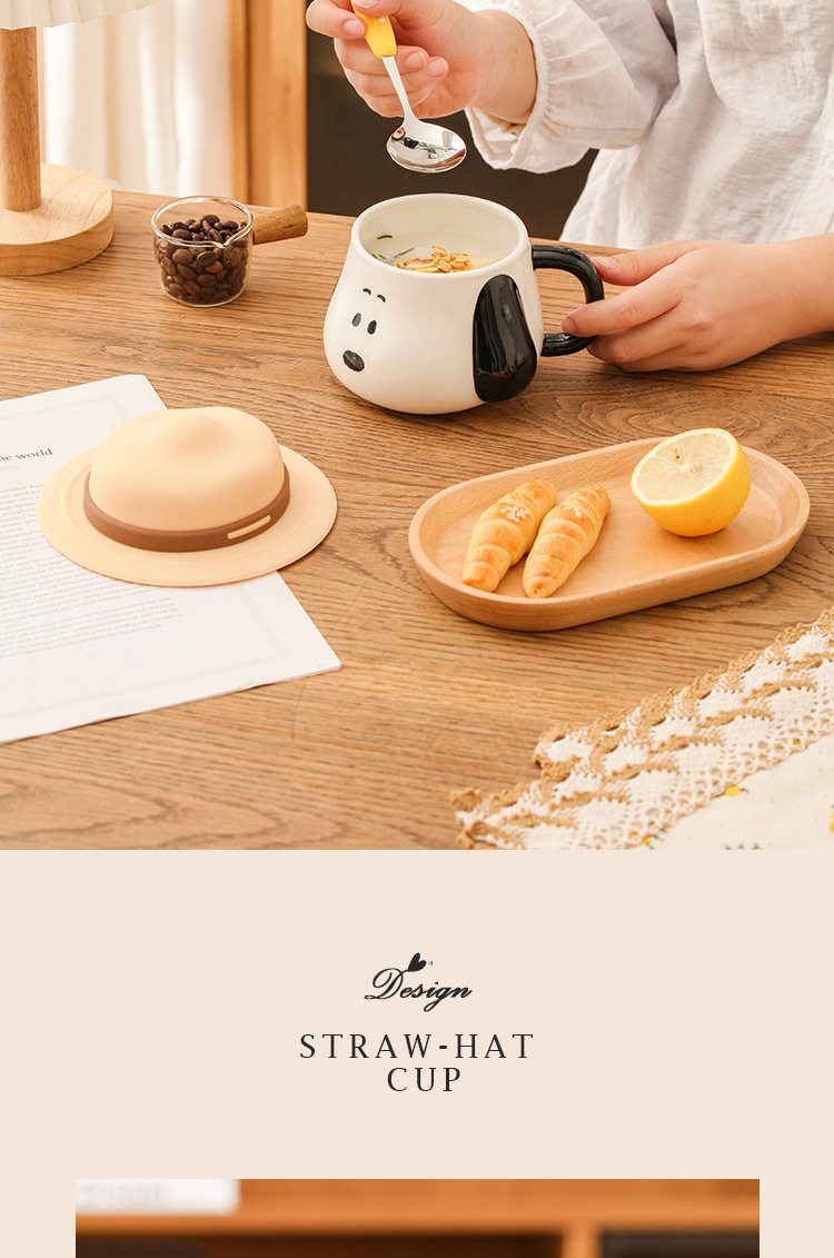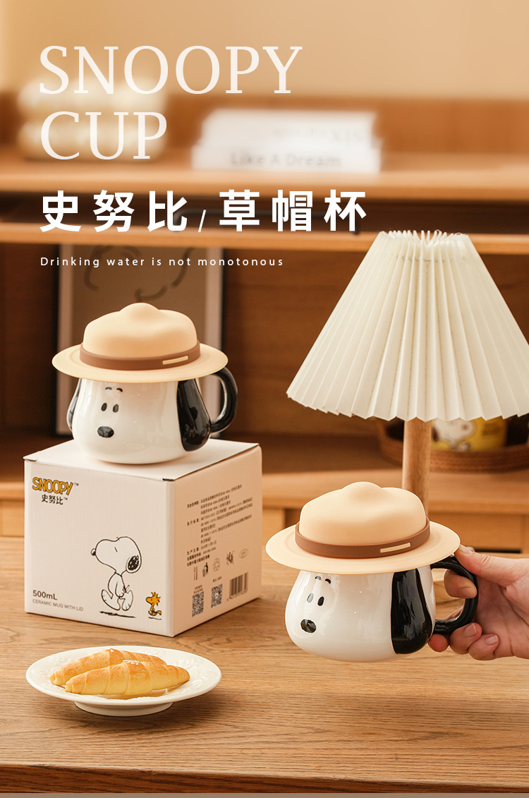 Taza creativa con forma de sombrero de paja de Snoopy con tapa, taza de cerámica auténtica con asa, taza de desayuno, taza de café, regalo al por mayor