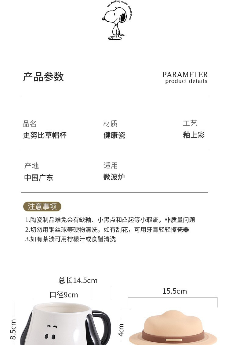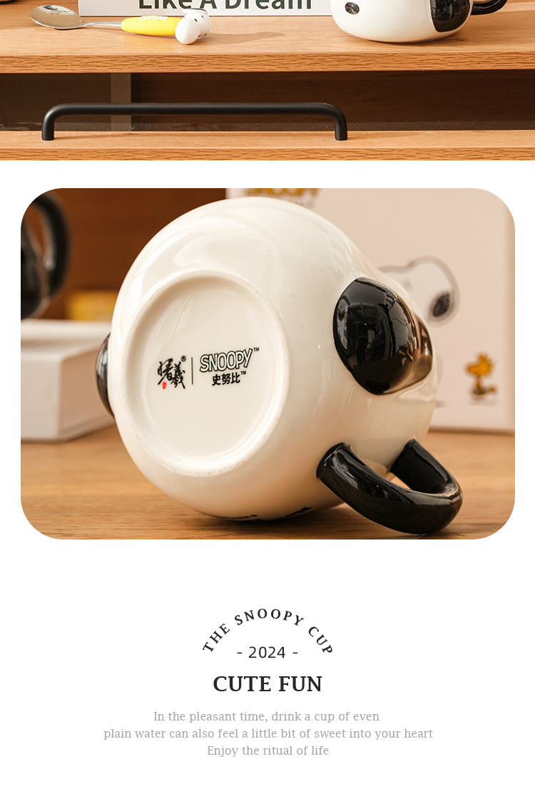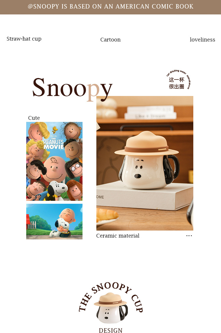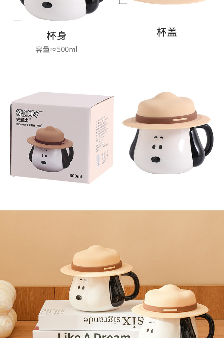 Taza creativa con forma de sombrero de paja de Snoopy con tapa, taza de cerámica auténtica con asa, taza de desayuno, taza de café, regalo al por mayor