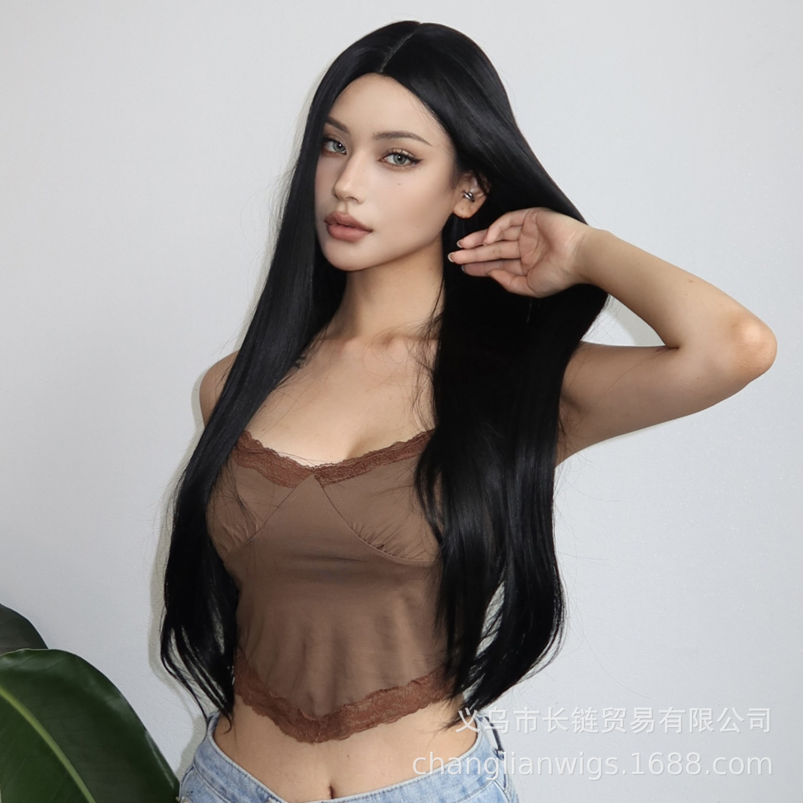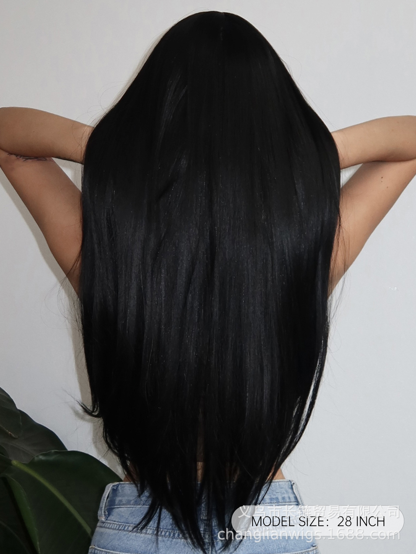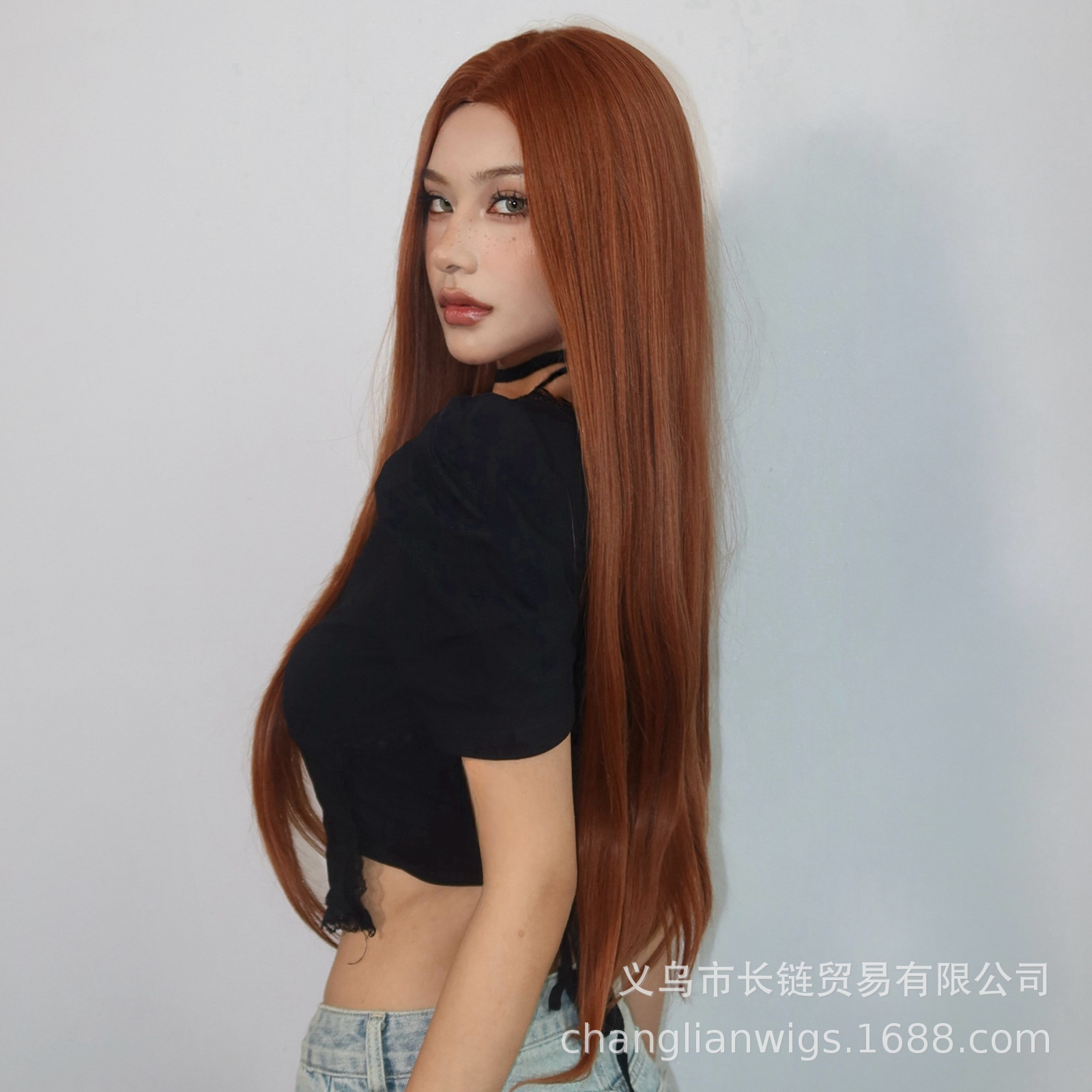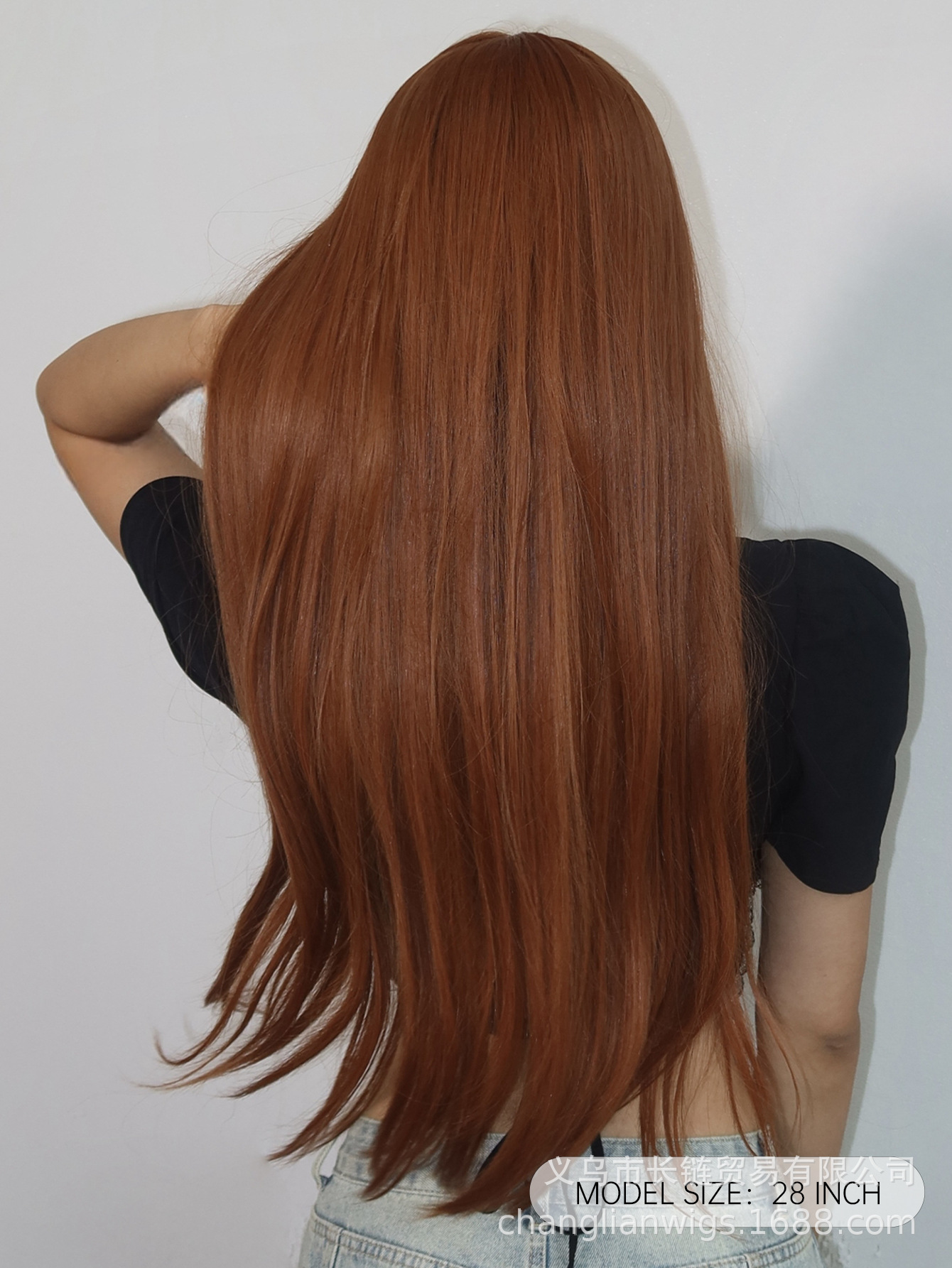 Luz transfronteriza Europa y América hasta la cintura peluca de pelo liso de longitud media negra cabeza entera seda doméstica femenina natural peluca Xuchang wigs