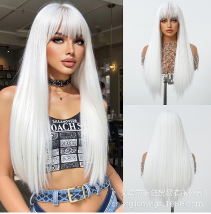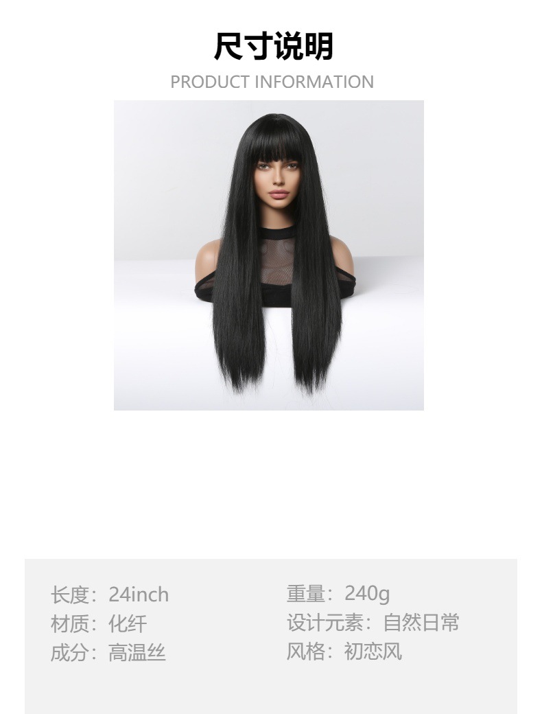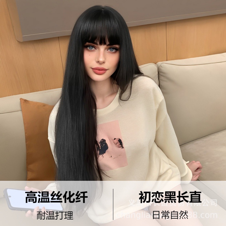 Peluca para mujer, estilo primer amor, negra larga y lisa con flequillo, fibra de alta temperatura, gorro de red rosa, peluca completa, peluca de fibra sintética para mujer, venta al por mayor en stock.