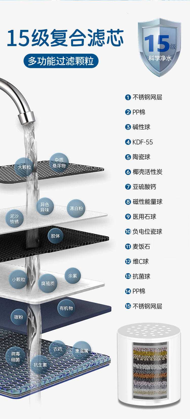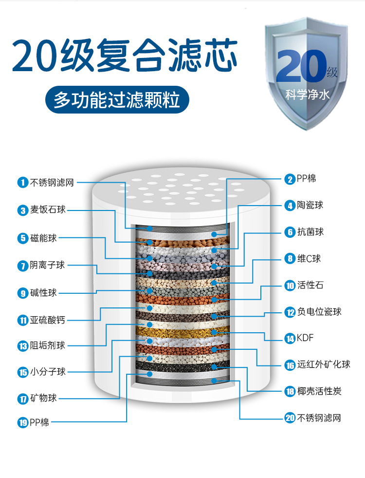 • *过滤:15 级替换滤芯可去除超过 95% 的氯,减少重金属和异味,软化水质,使皮肤和*更*,减少水斑 - 非常适合敏感肌肤。
