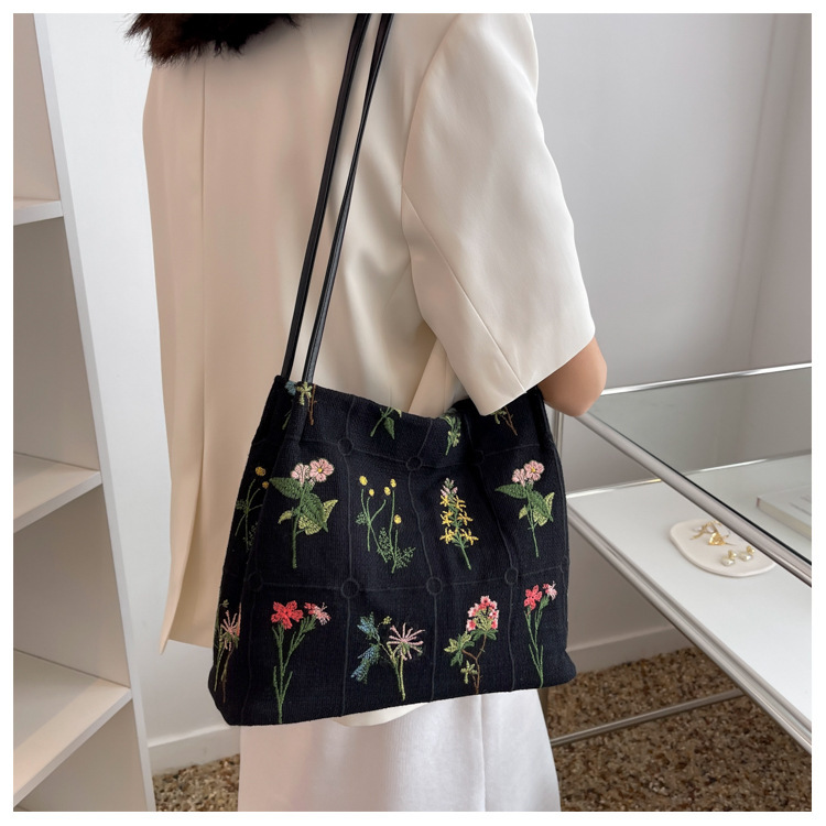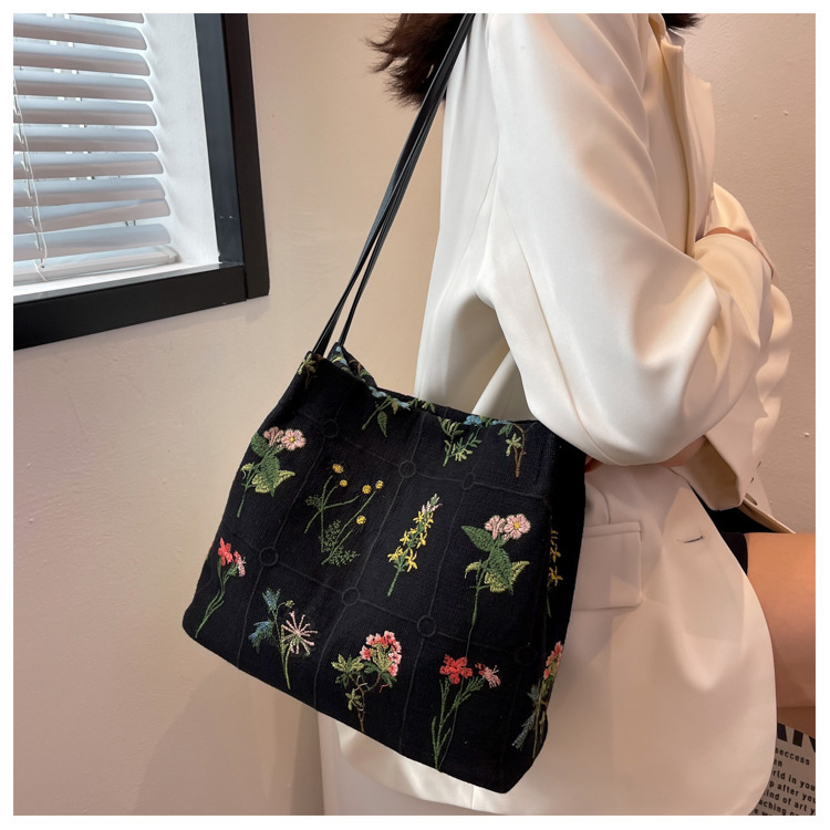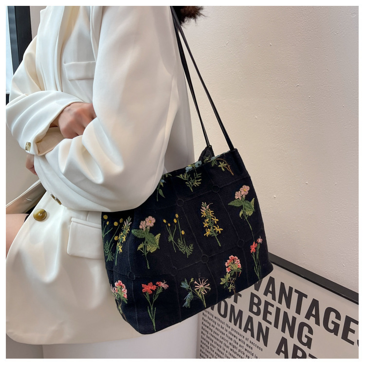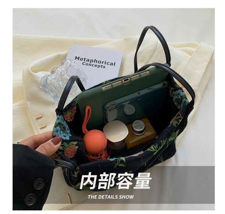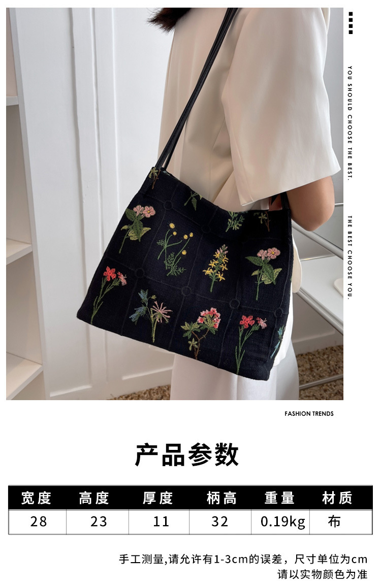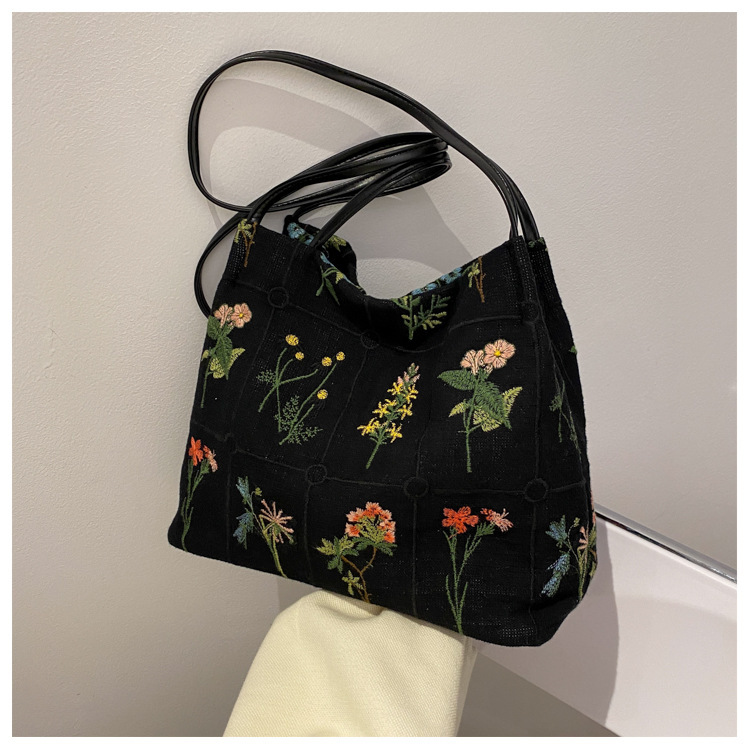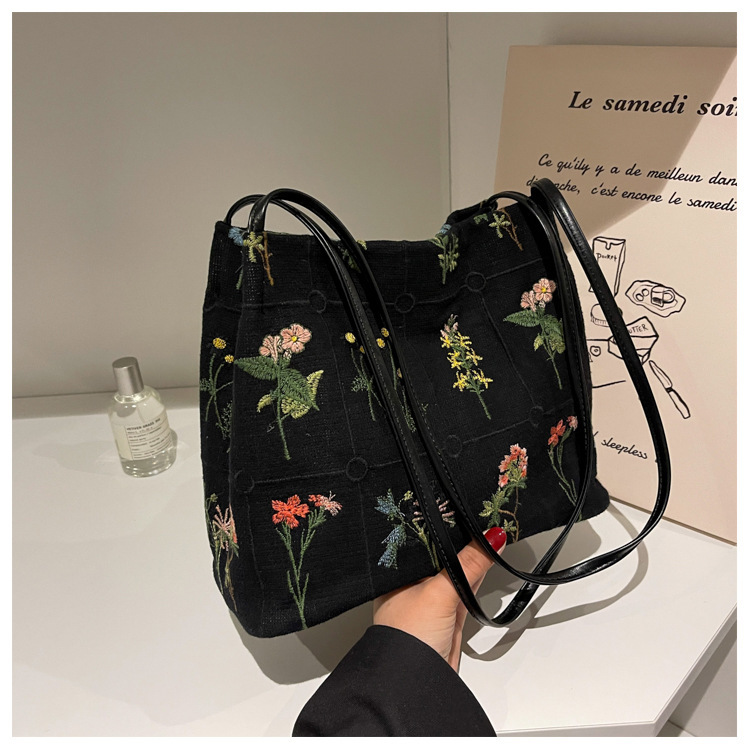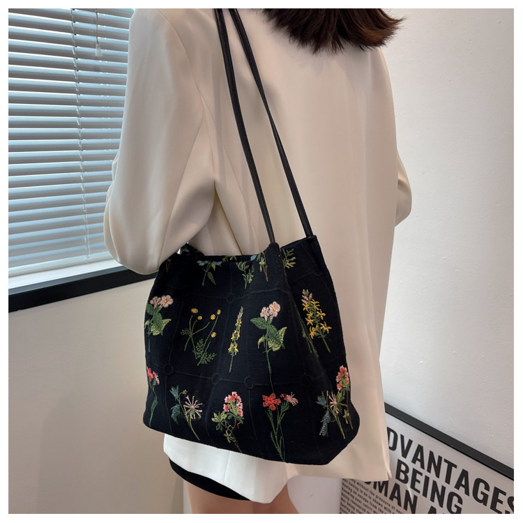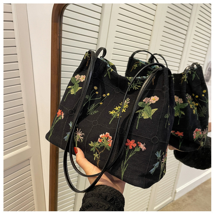 Bolso de mano bordado de gran capacidad para las mujeres 2024 primavera y verano nuevo nicho lienzo bordado bolso de cubo de cercanías