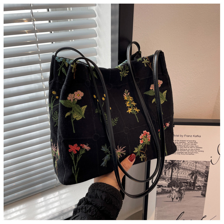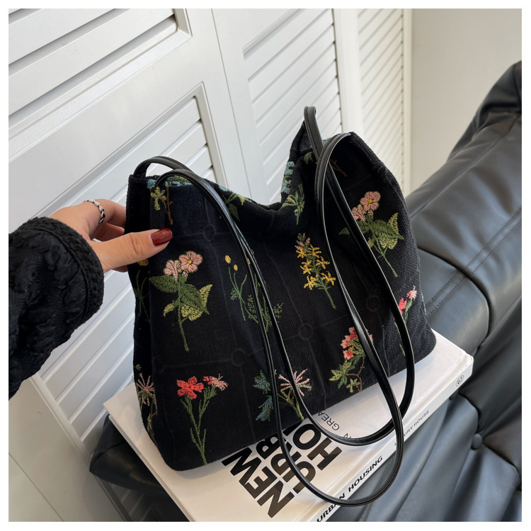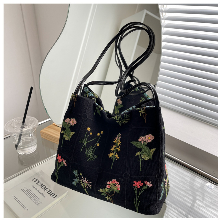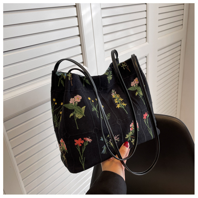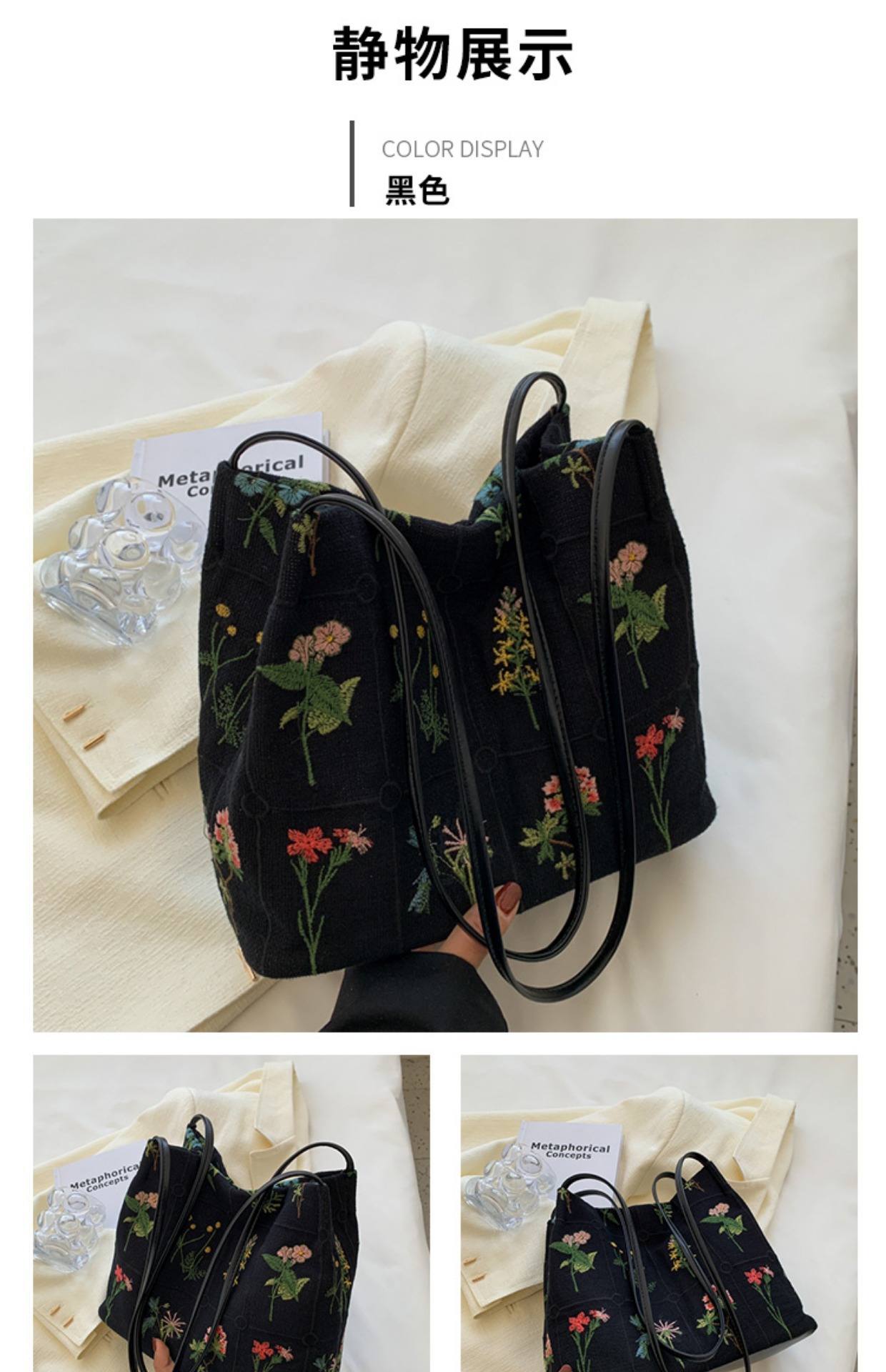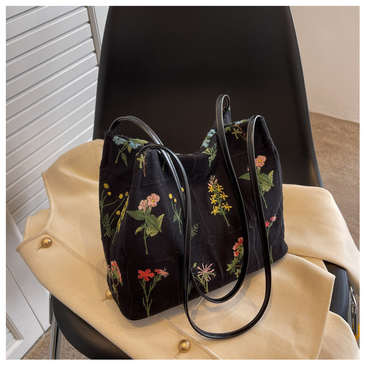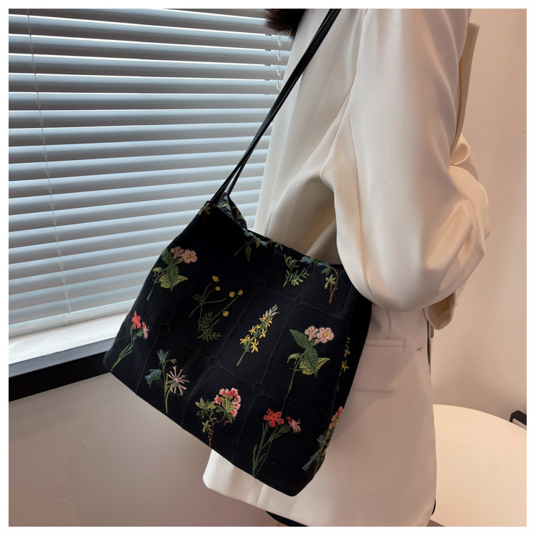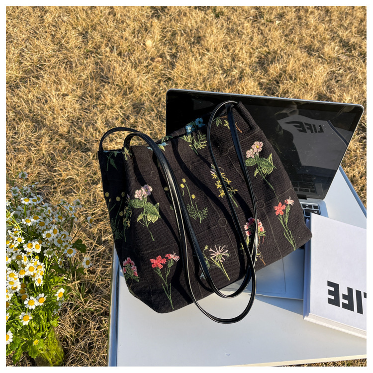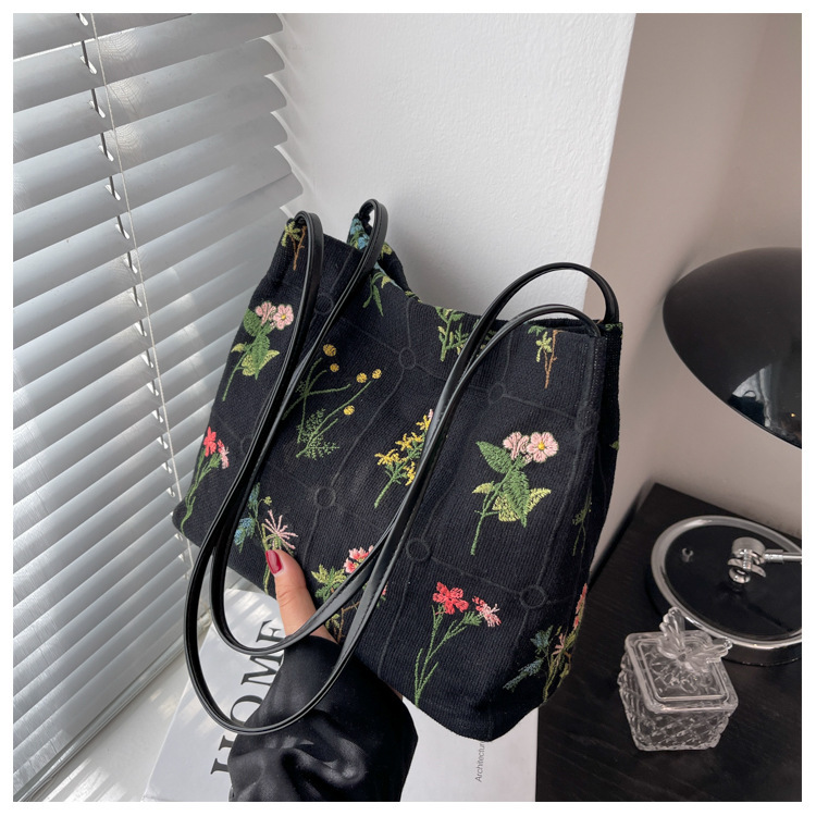 Bolso de mano bordado de gran capacidad para las mujeres 2024 primavera y verano nuevo nicho lienzo bordado bolso de cubo de cercanías