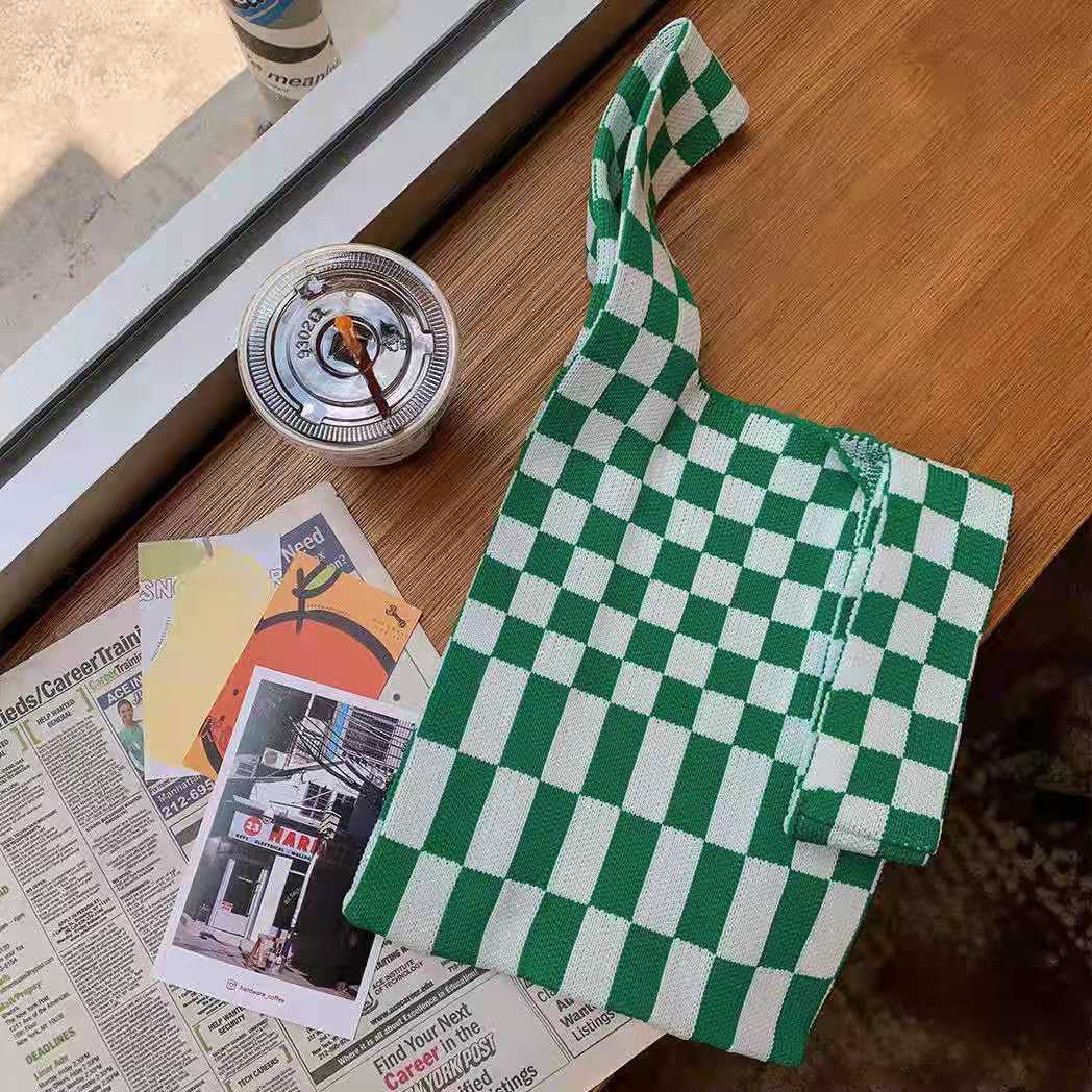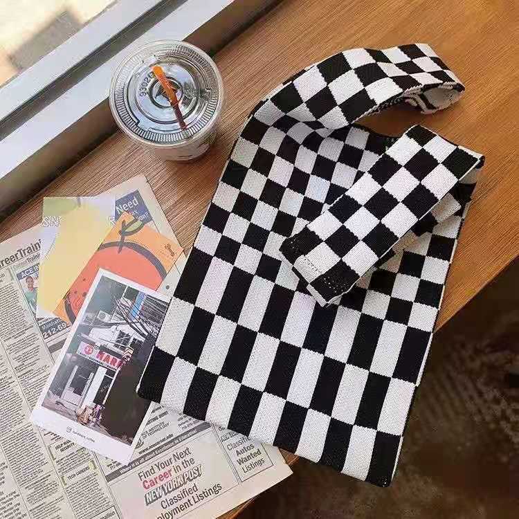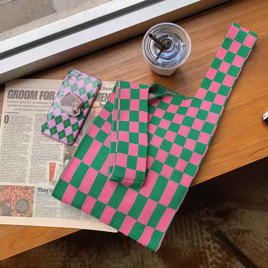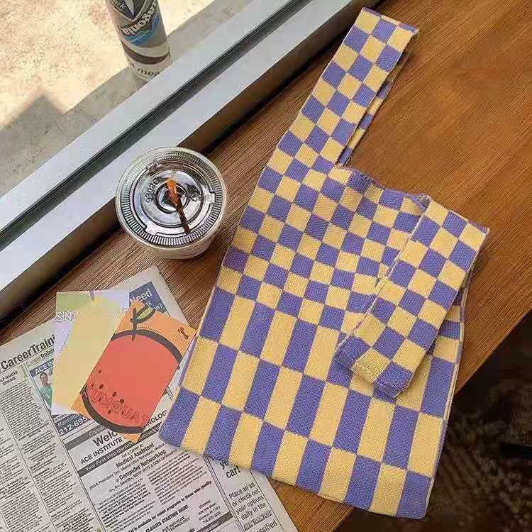 2021 Tablero de chessboard transfronterizo japonés y coreano Bolso de hombro de punto de color de contraste a cuadros Bolso tejido Bolso de hombro para las mujeres
