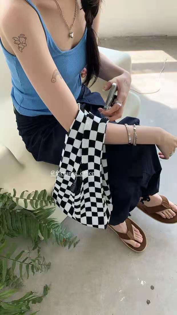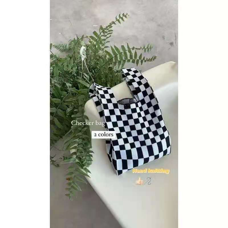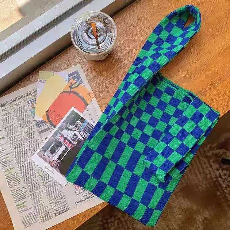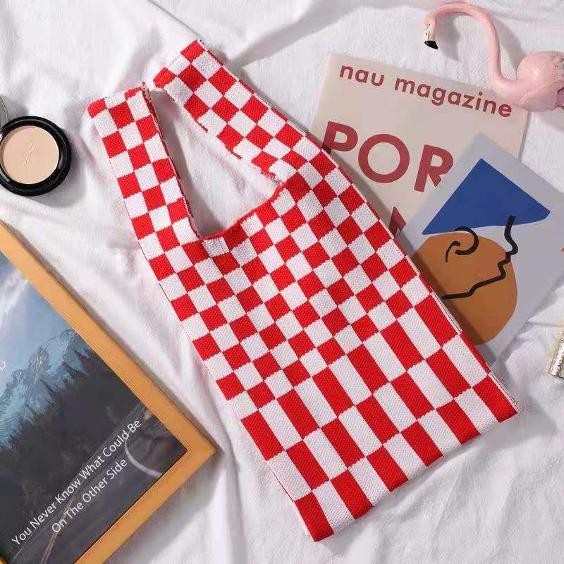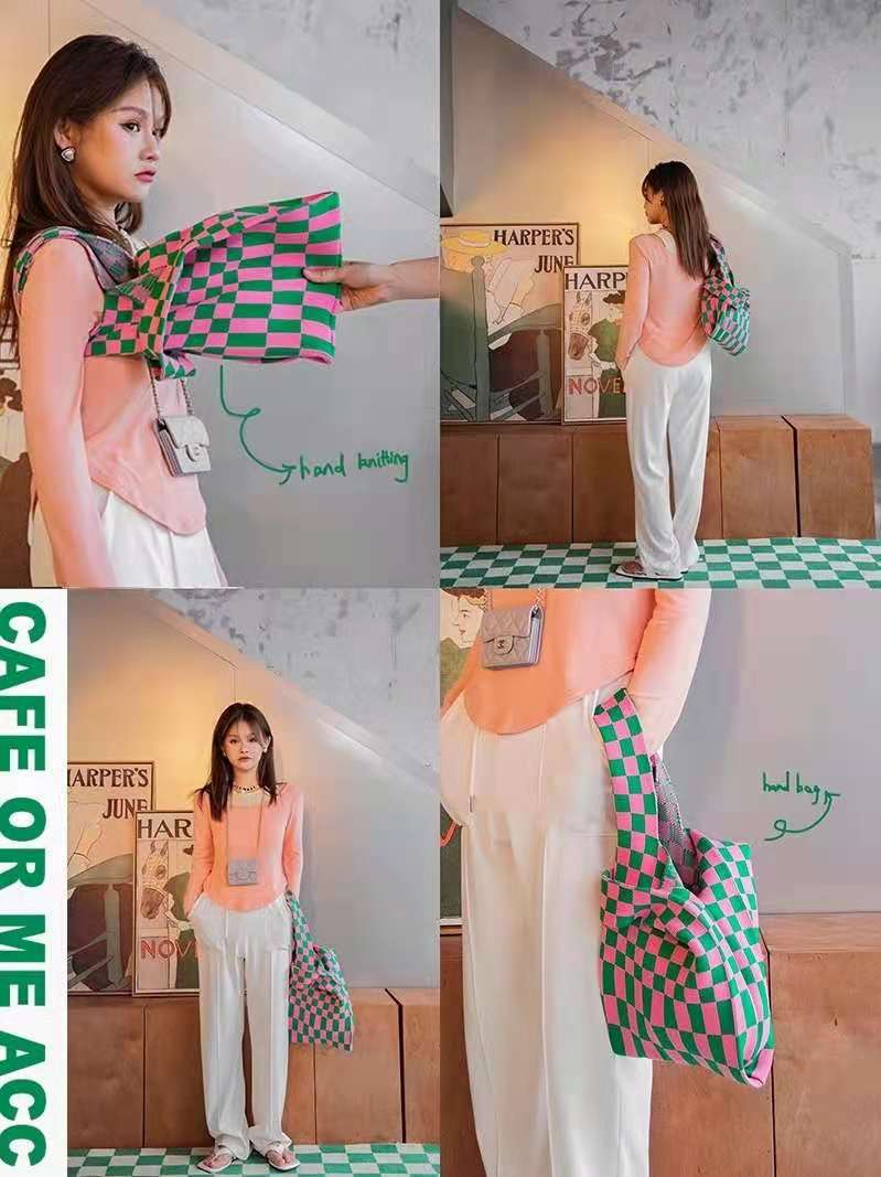 2021 Tablero de chessboard transfronterizo japonés y coreano Bolso de hombro de punto de color de contraste a cuadros Bolso tejido Bolso de hombro para las mujeres