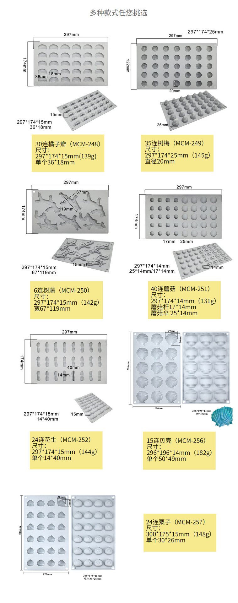 | Especificación | (30 moldes de aceitunas 135g) MCM-702,(10 moldes para ostras 152g) MCM-703,(18 nueces 103g)MCM-704,(30 almendras y 101g)MCM-651,(28 granos de café 138g) MCM-572,(6 granos de café 87g)MCM-643,Cacahuetes (144g) MCM-252,Naranja (139 g) MCM-248,Frambuesa (145g) MCM-249,Rama (142g) MCM-250,Hongo (131g) MCM-251,Cáscara (182 g) MCM-256,Castaño (148g) MCM-257,15 castañas (150g) MCM-413,(8 rodajas de manzana 162g) MCM-568,(8 rodajas de pera 166g)MCM-569,(8 rodajas de limón ovaladas 175g) MCM-570,(8 rodajas redondas de limón 164g) MCM-571 |