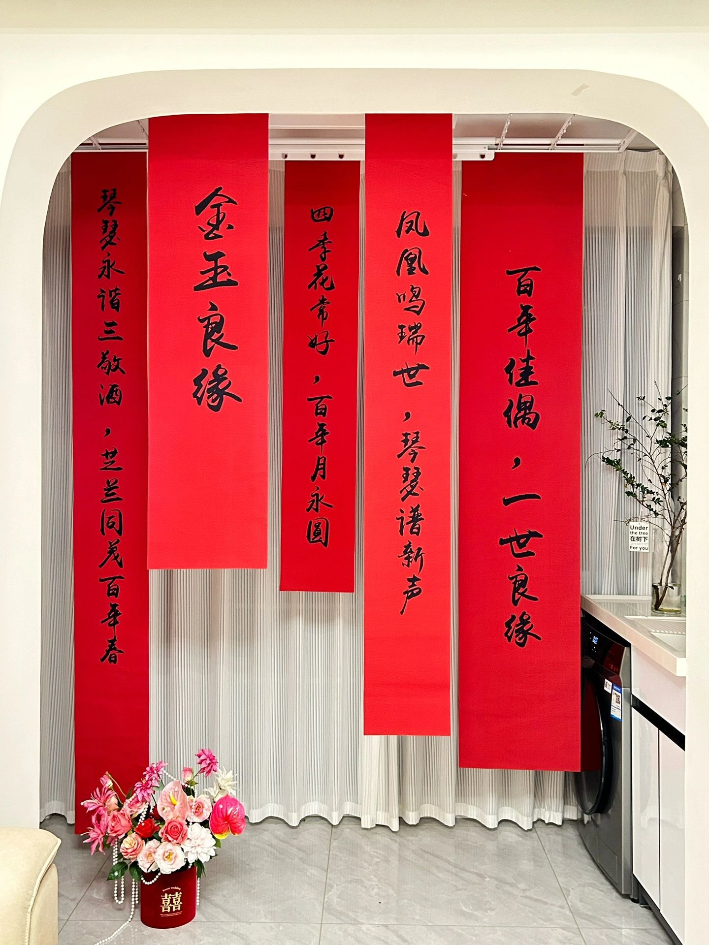 Patio rural ceremonia de boda arreglo sala de bodas estilo chino colgante de tela Banquete de boda foto de alto grado fondo rojo tela banner