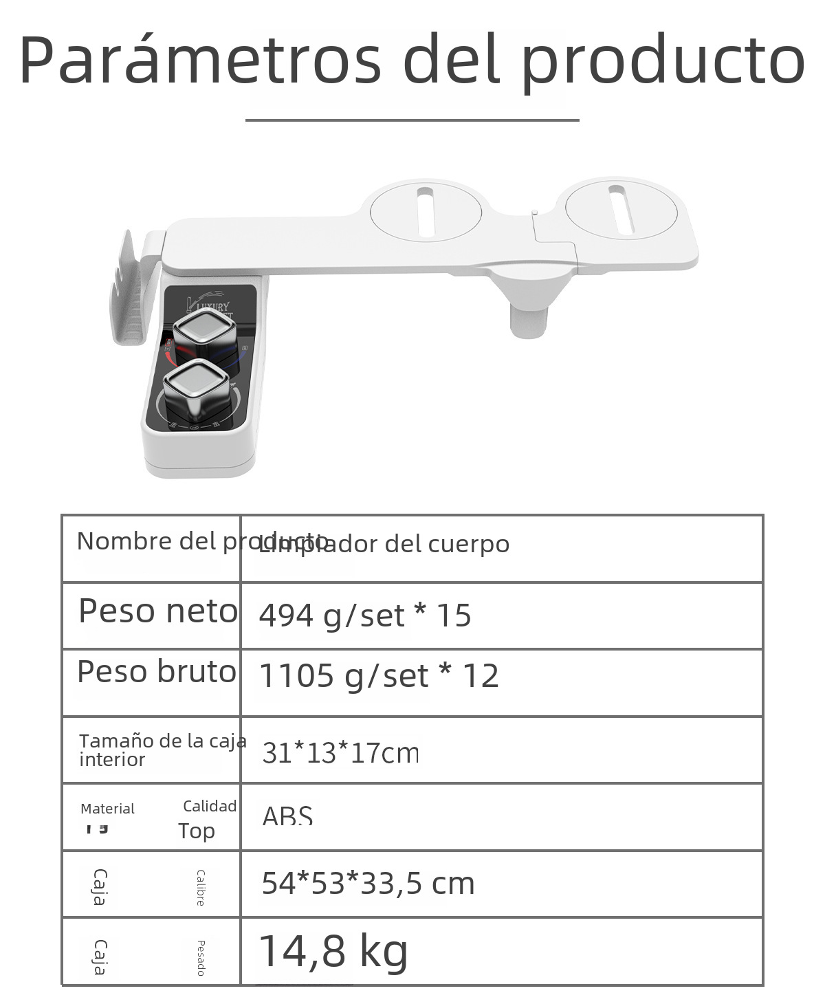 | Características adicionales | Ajuste de la temperatura del agua,Limpieza de la cadera,Las mujeres lavan,Ajuste de la presión del agua,Boquilla de autolimpieza |