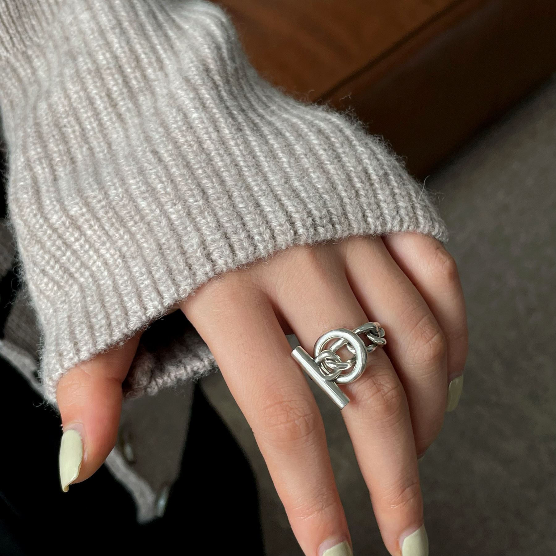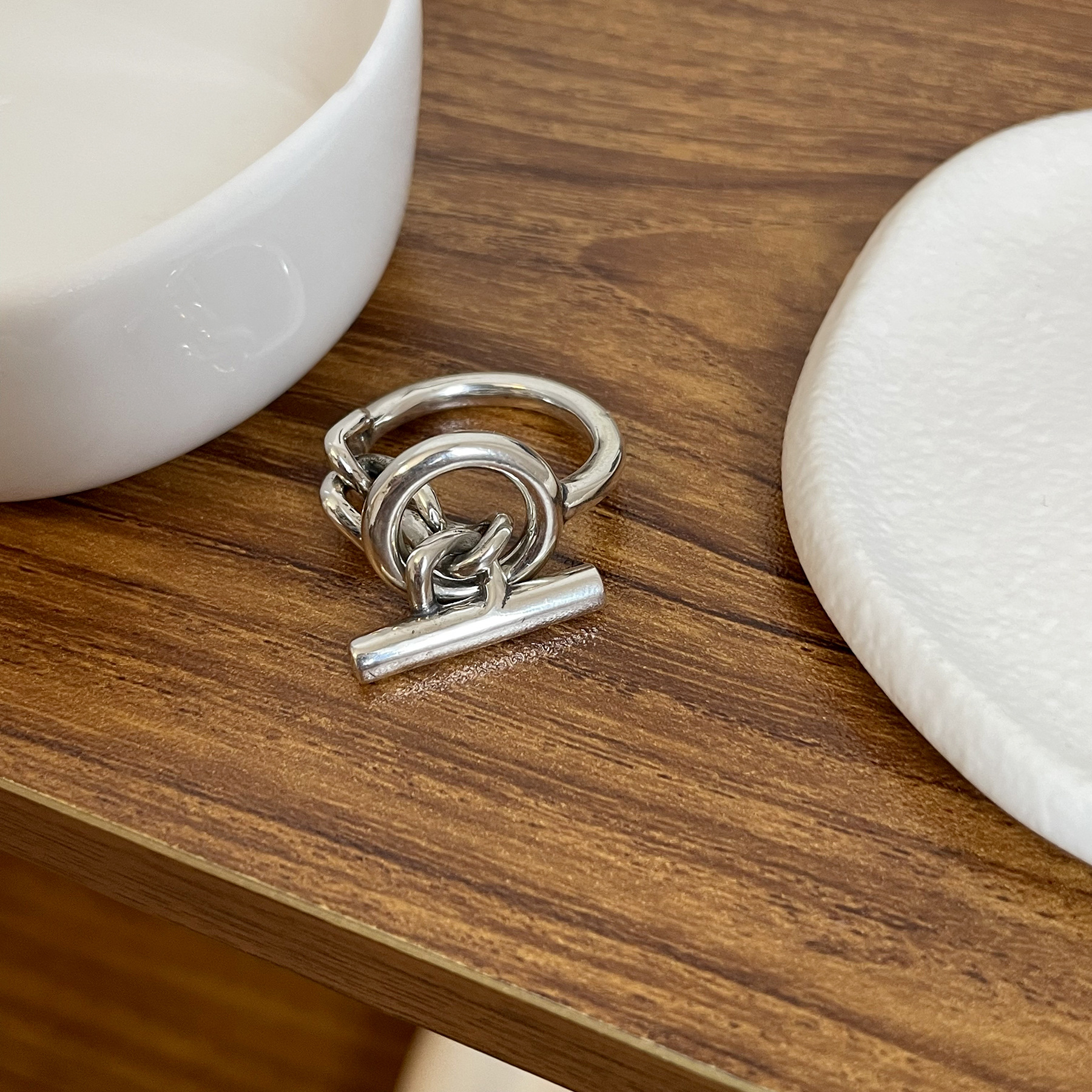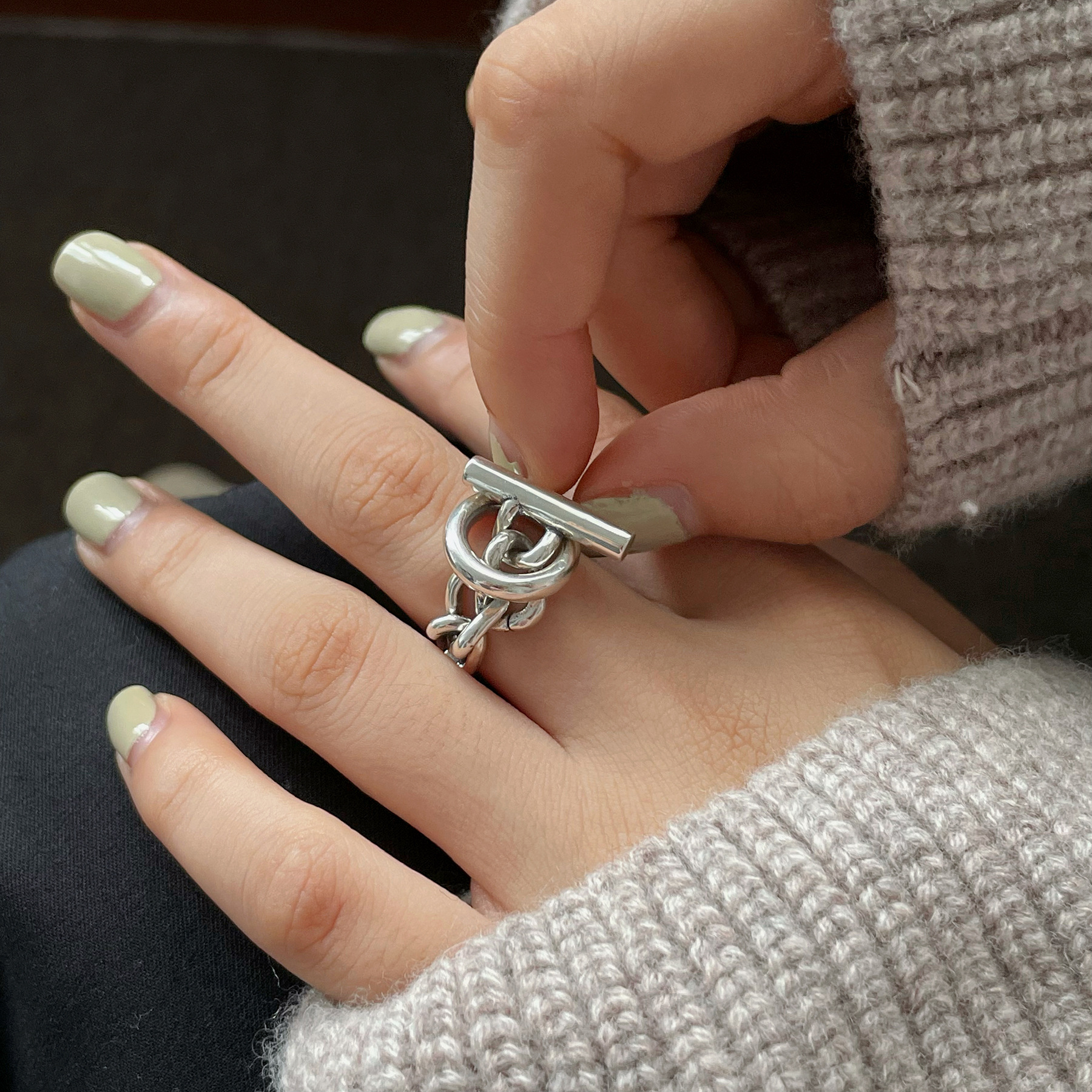 Versión coreana S925 anillo redondo multicapa personalizado chapado en plata para mujer, anillo abierto de dedo índice con cadena con hebilla OT de moda retro.
