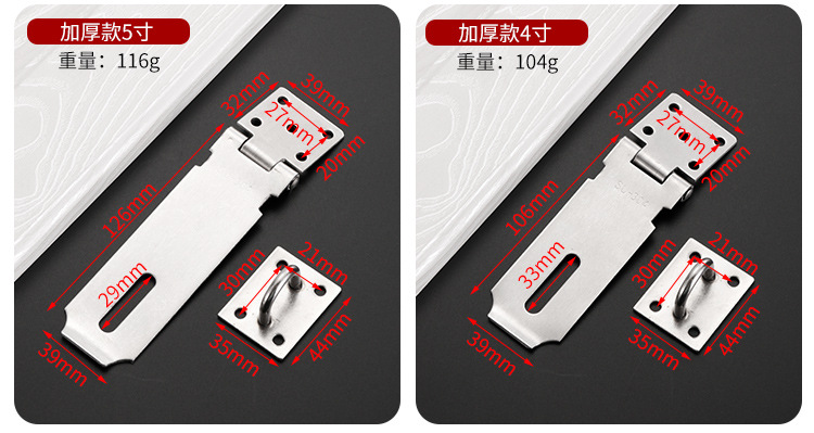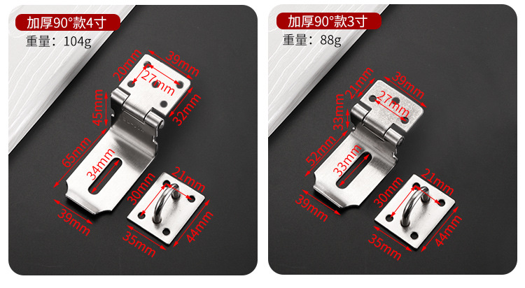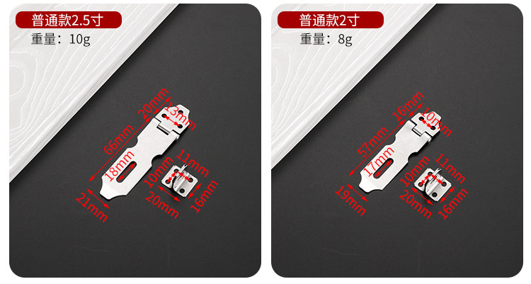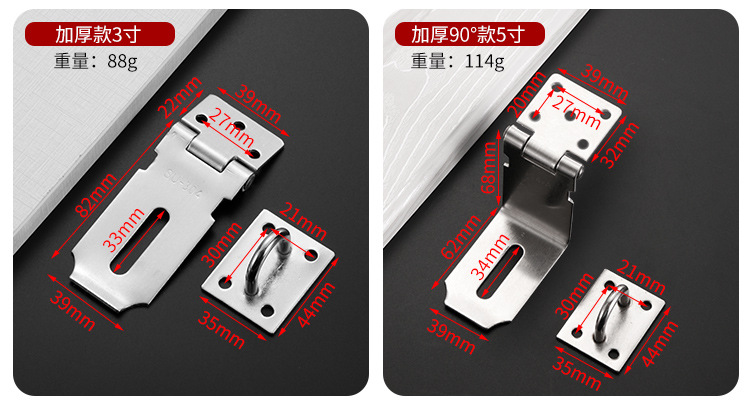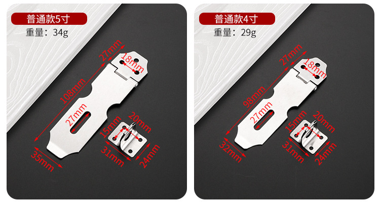 | Especificaciones | 2-inch (60 sets/box 3000 sets/piece),2,5 pulgadas (60 sets/box 3000 sets/piece),3 pulgadas (40 juegos/caja 2000 juegos/pieza),3-inch (30 sets/box 1500 sets/piece),4 pulgadas (20 sets/caja 1000 sets/pieza),5 pulgadas (20 sets/caja 1000 sets/pieza),Engrosada cerradura de 3 pulgadas (10 sets/box 240 sets/piece),Engrosamiento de 4 pulgadas de bloqueo (10 sets/box 240 sets/piece),Engrosamiento de 5 pulgadas de bloqueo (10 sets/box 240 sets/piece),Engrosado de 3 pulgadas de bloqueo de 90 grados (10 sets/box 240 sets/piece),Engrosada 4 pulgadas de 90 grados de bloqueo (10 sets/box 240 sets/piece),Engrosada 5 pulgadas 90 grados de bloqueo (10 sets/box 240 sets/piece) |