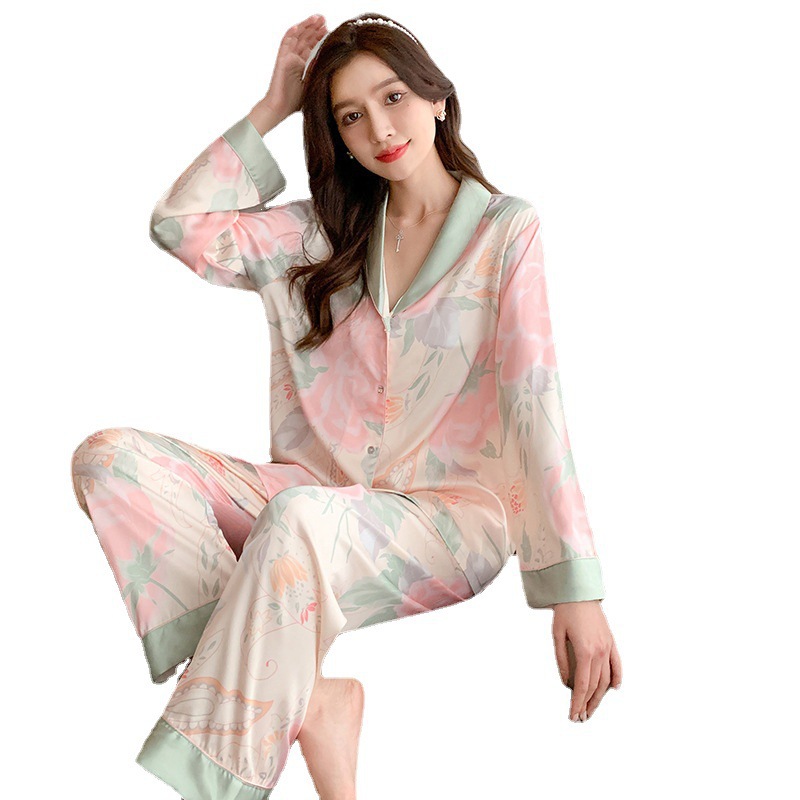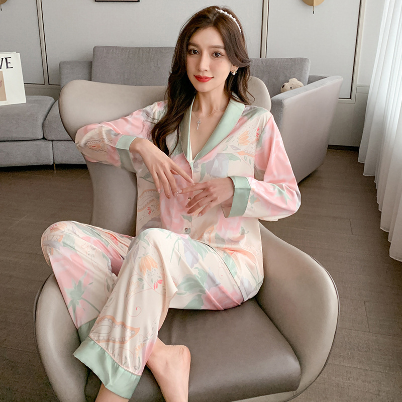 Elegante pijamas de seda artificial de manga larga para mujer de alto grado de seda de hielo suelta de dos piezas ropa para el hogar otoño transmisión en vivo entrega de una pieza