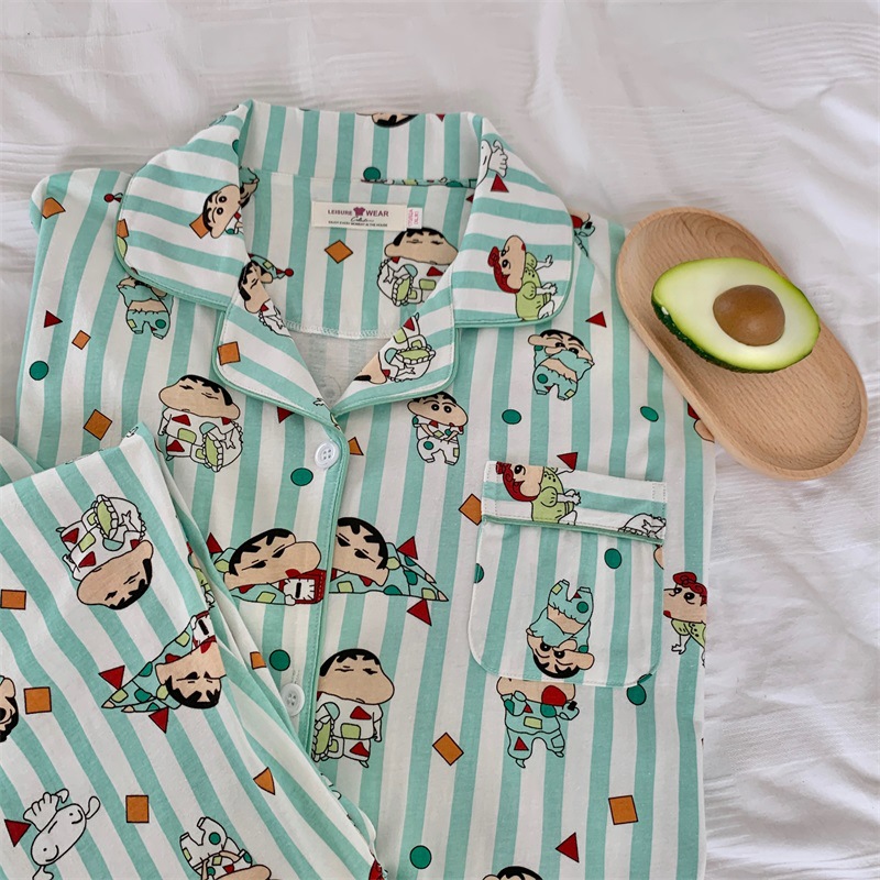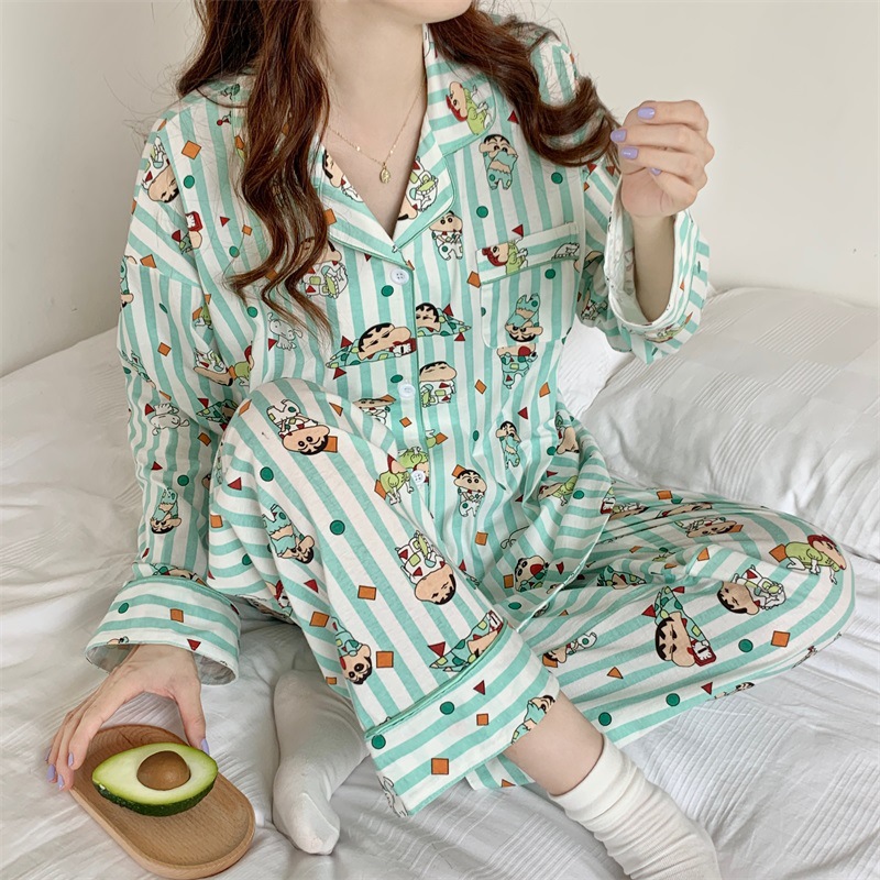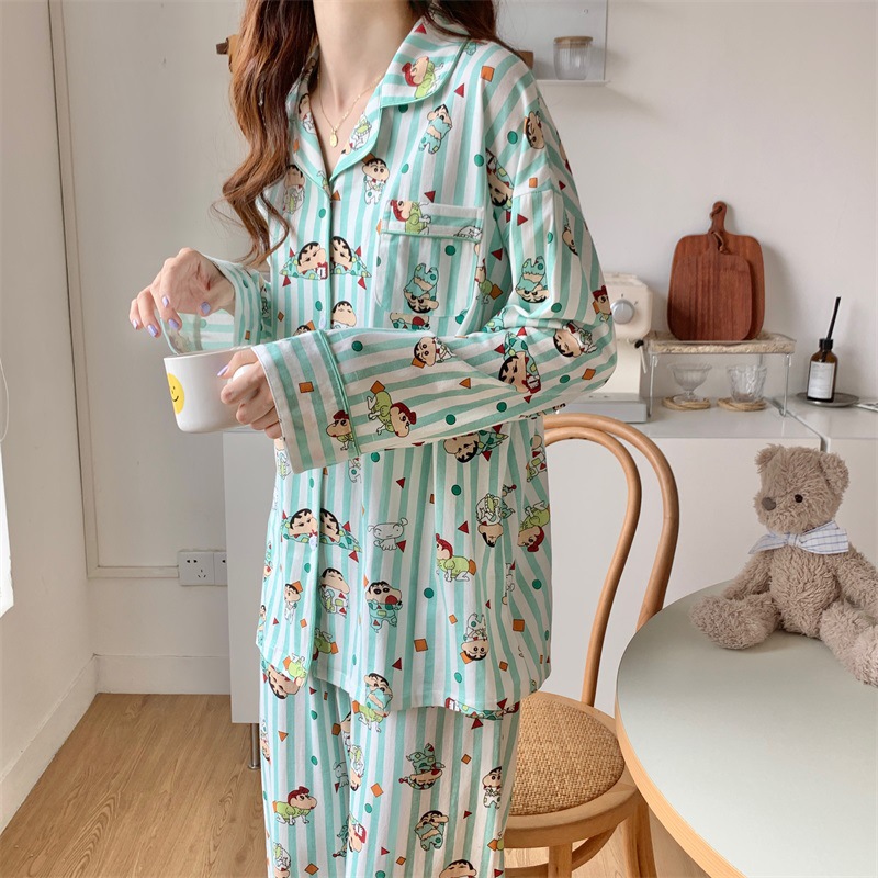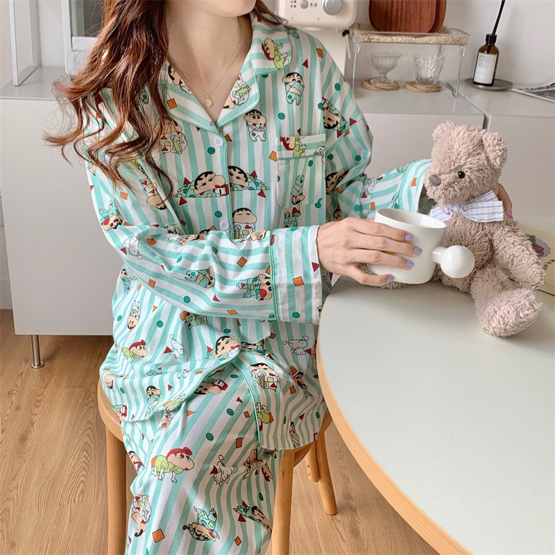 Nuevo estilo crayón Xiaoxin pijamas de estilo coreano de las mujeres de dibujos animados lindo suelta más el tamaño de dos piezas de ropa para el hogar otoño entrega en vivo
