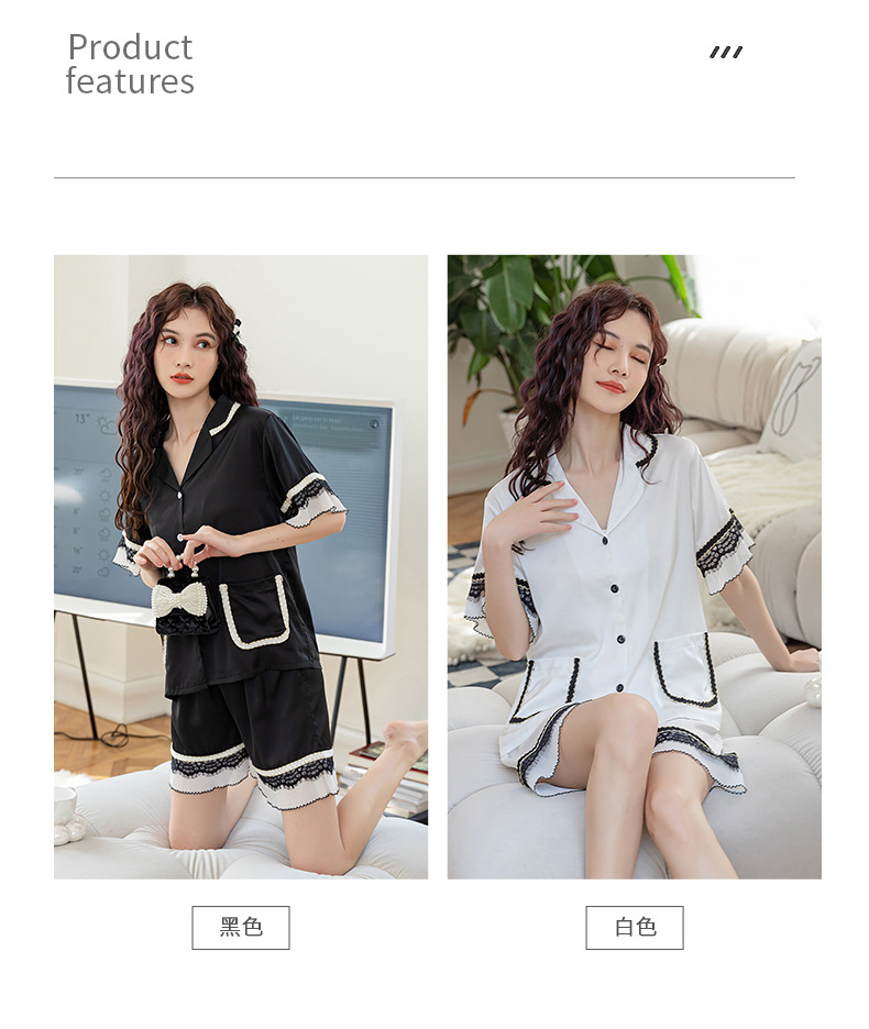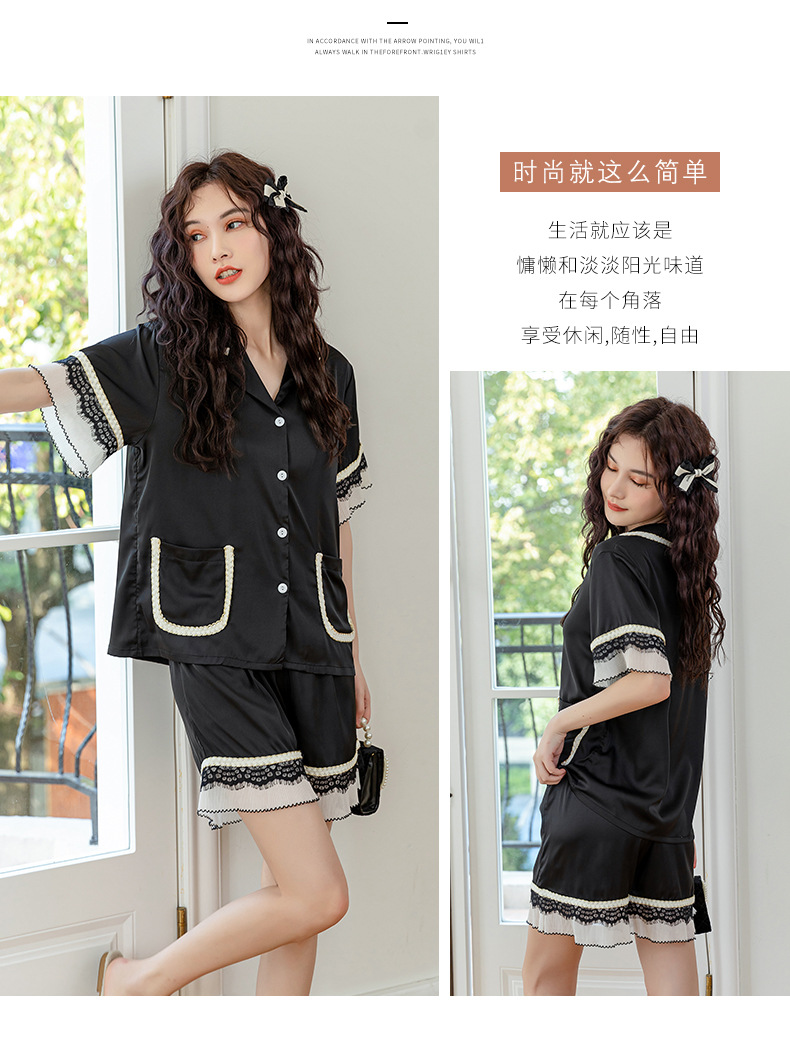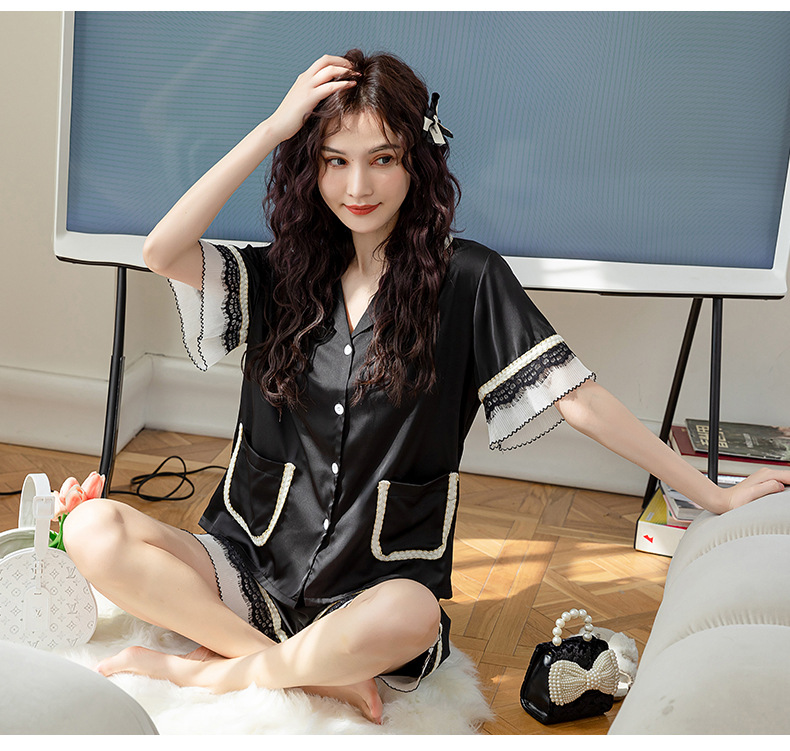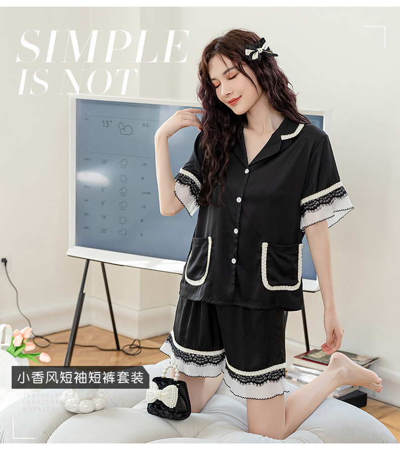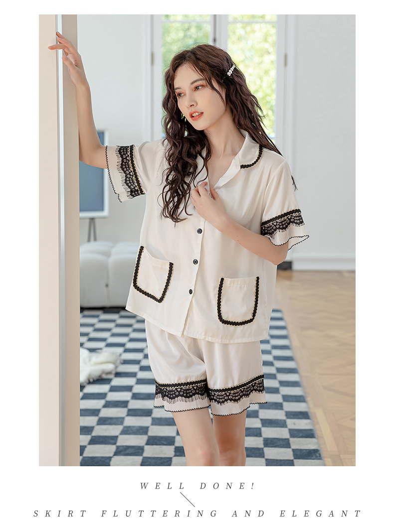 Nuevos pijamas de seda de hielo de alta gama para mujer, traje de solapa fina de manga corta con empalme de encaje de verano, ropa de moda para el hogar