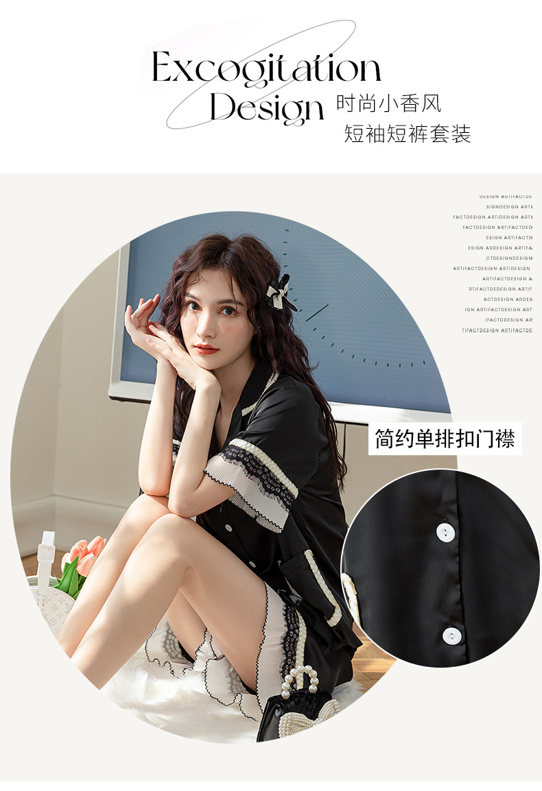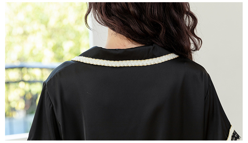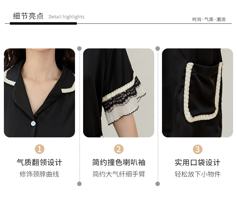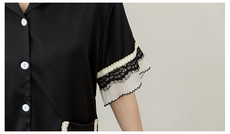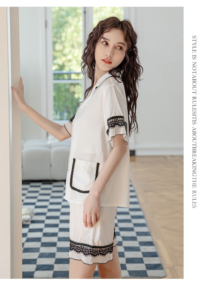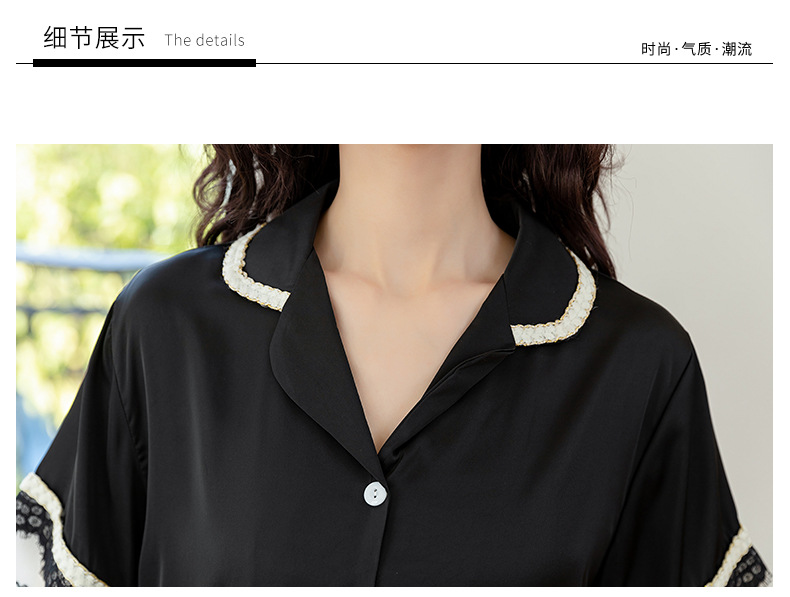 Nuevos pijamas de seda de hielo de alta gama para mujer, traje de solapa fina de manga corta con empalme de encaje de verano, ropa de moda para el hogar