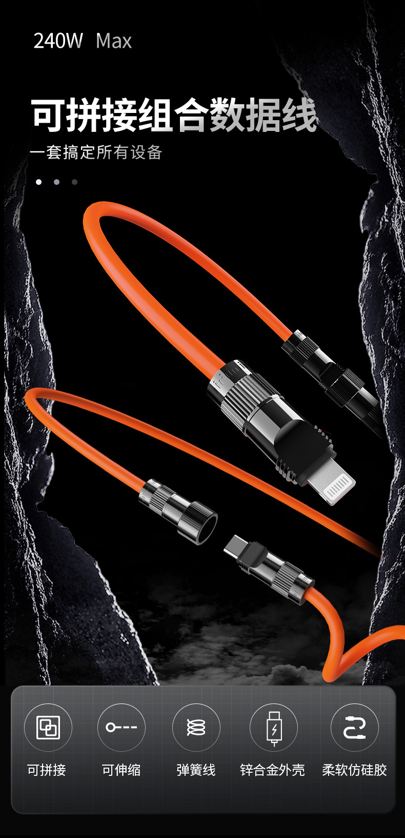 El nuevo cable de resorte de costura de 240W cinco en uno cable de datos de carga rápida PD3.1 kit de carga multifunción de alta potencia