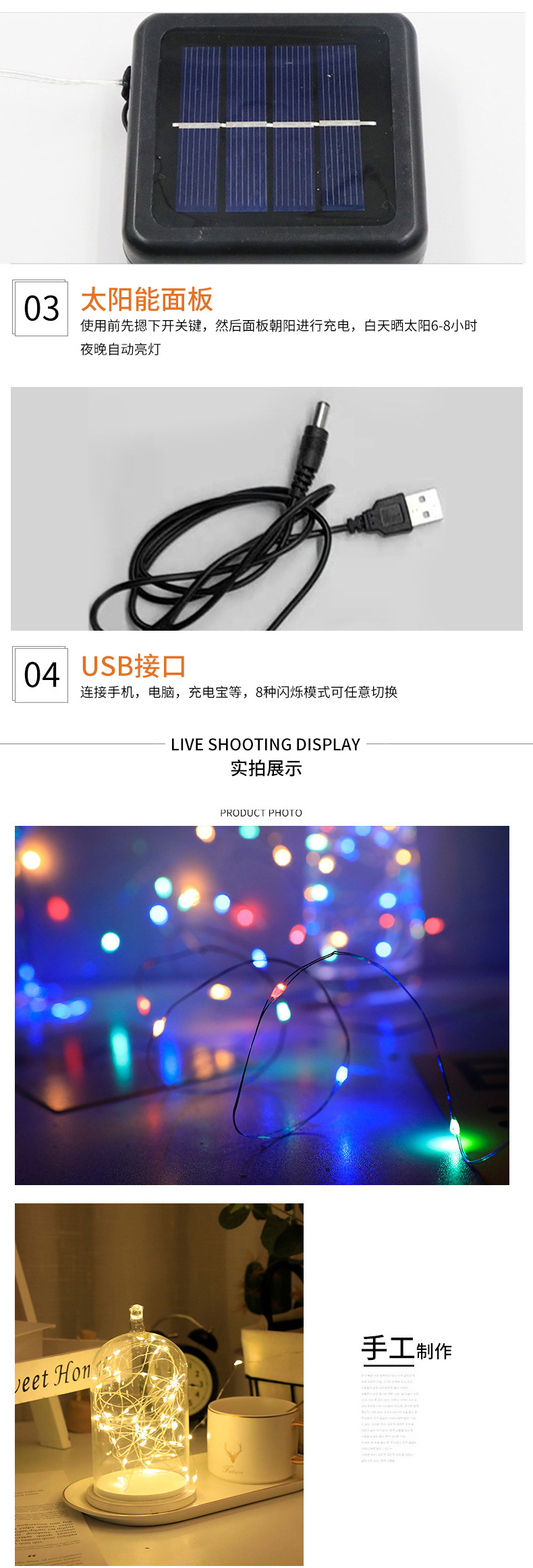 Recién actualizado USB recargable con control remoto energía solar 50 m 500 luces