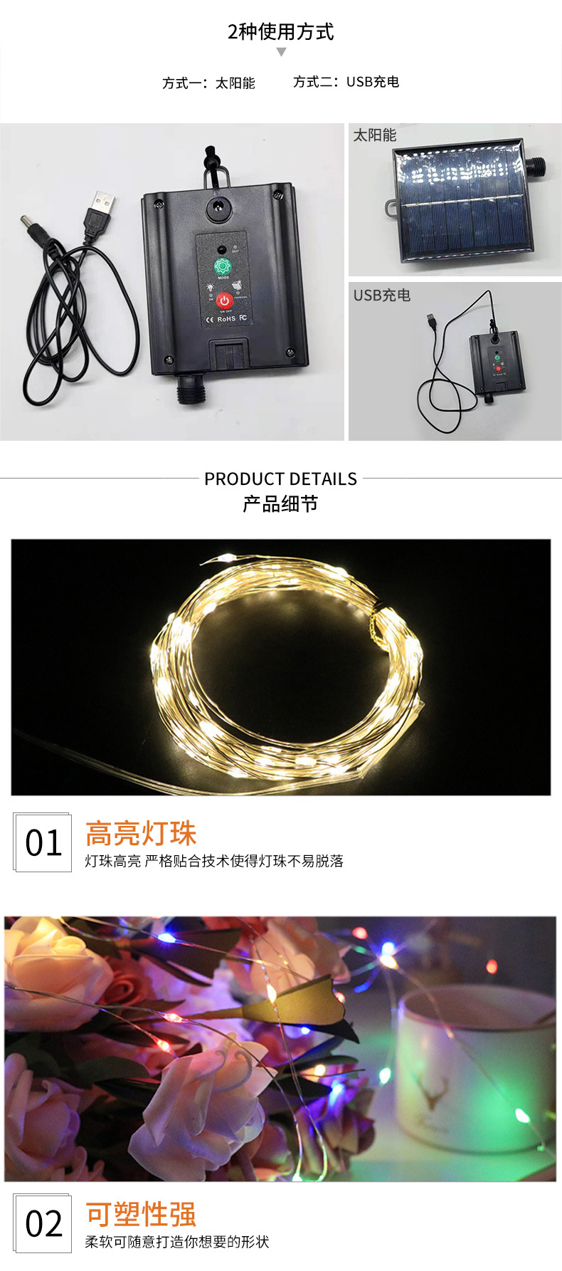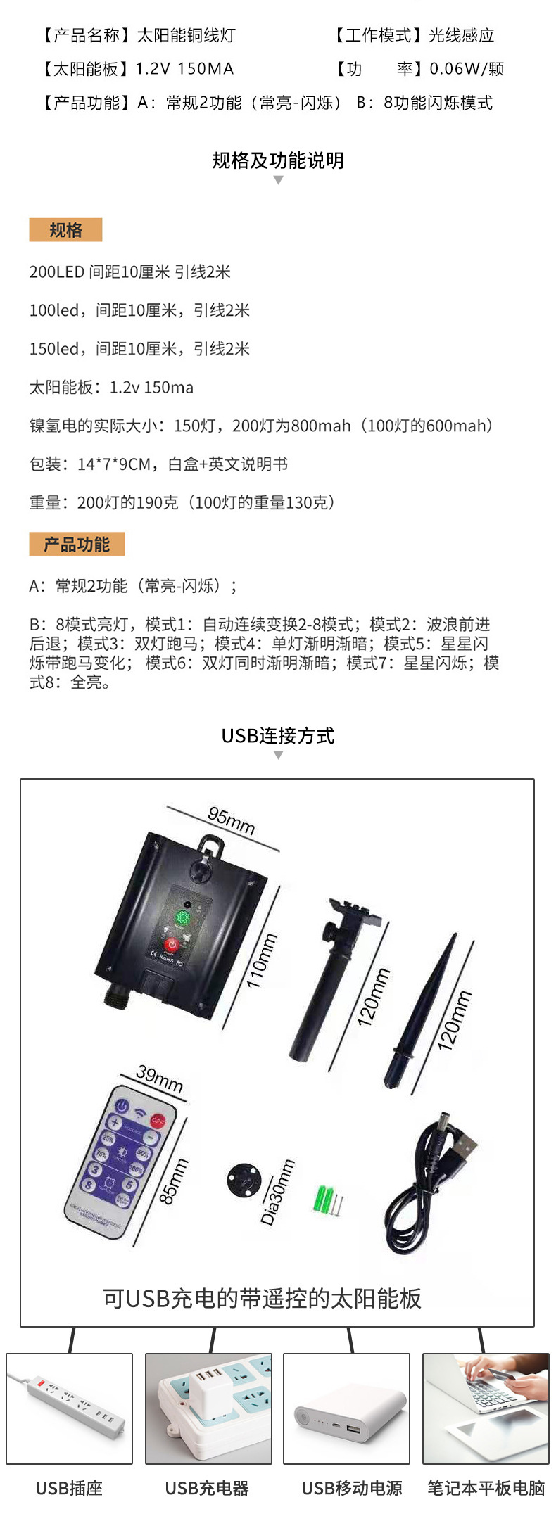 Recién actualizado USB recargable con control remoto solar 12 m 100 luces