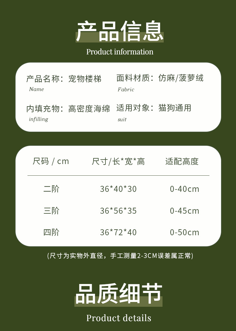 | Especificaciones | Escalera de rampa para mascotas (la chaqueta es extraíble y lavable)-[Esponja 25D prensada al vacío] |