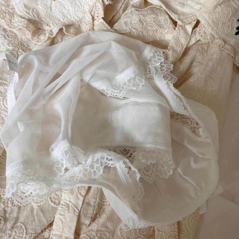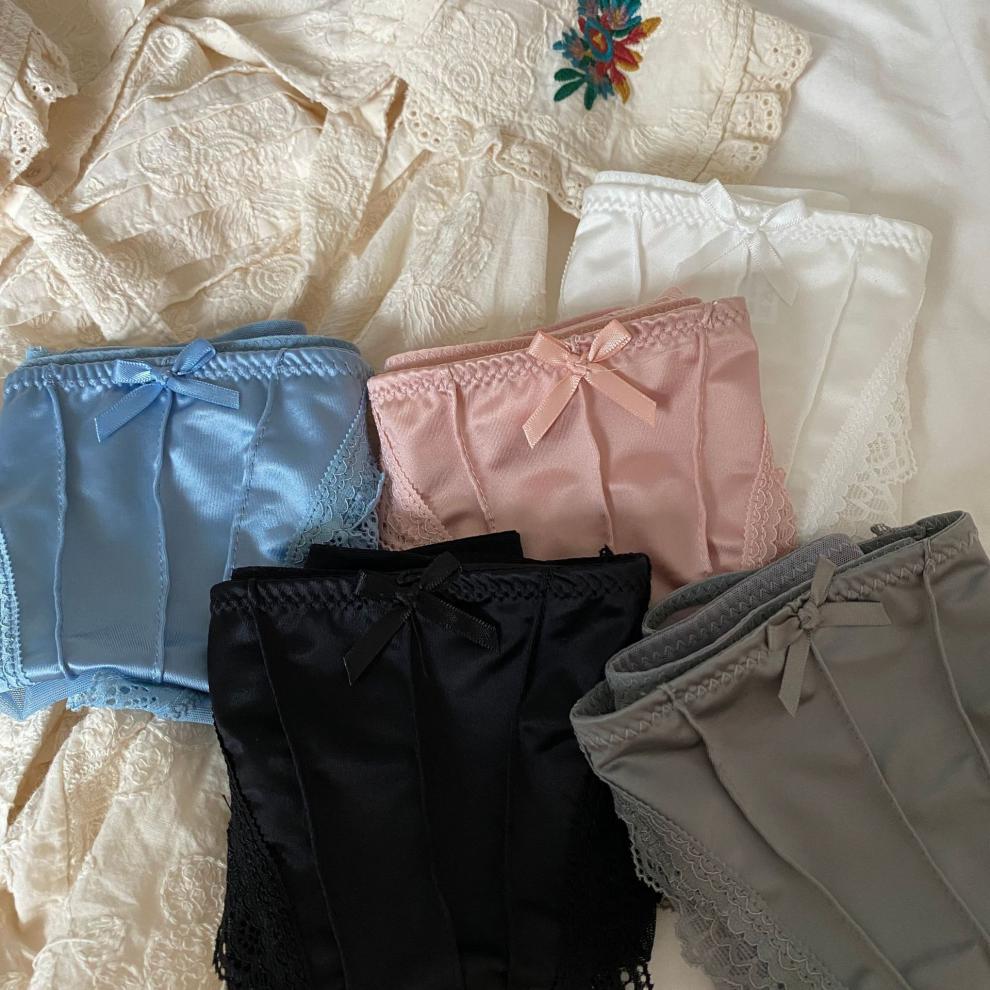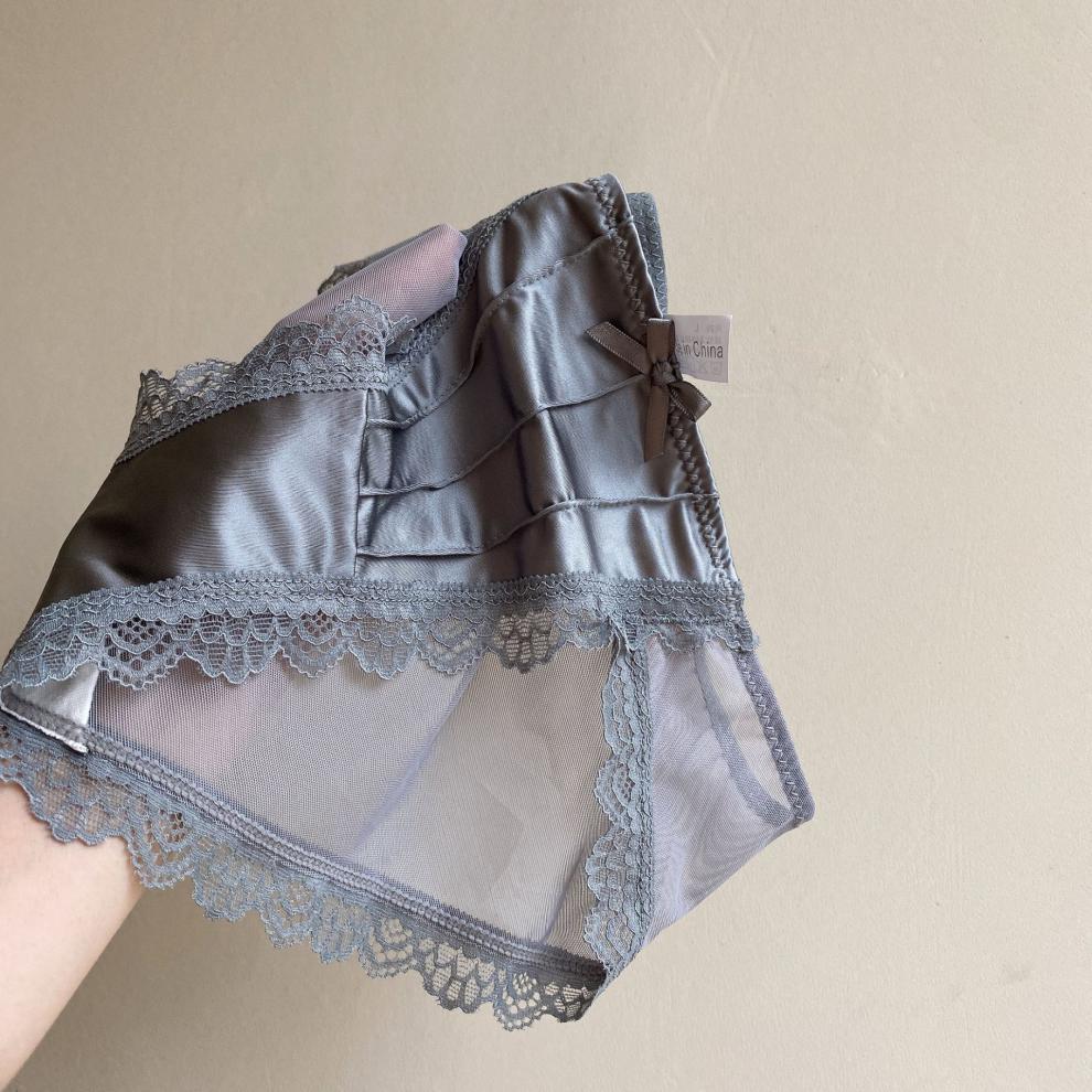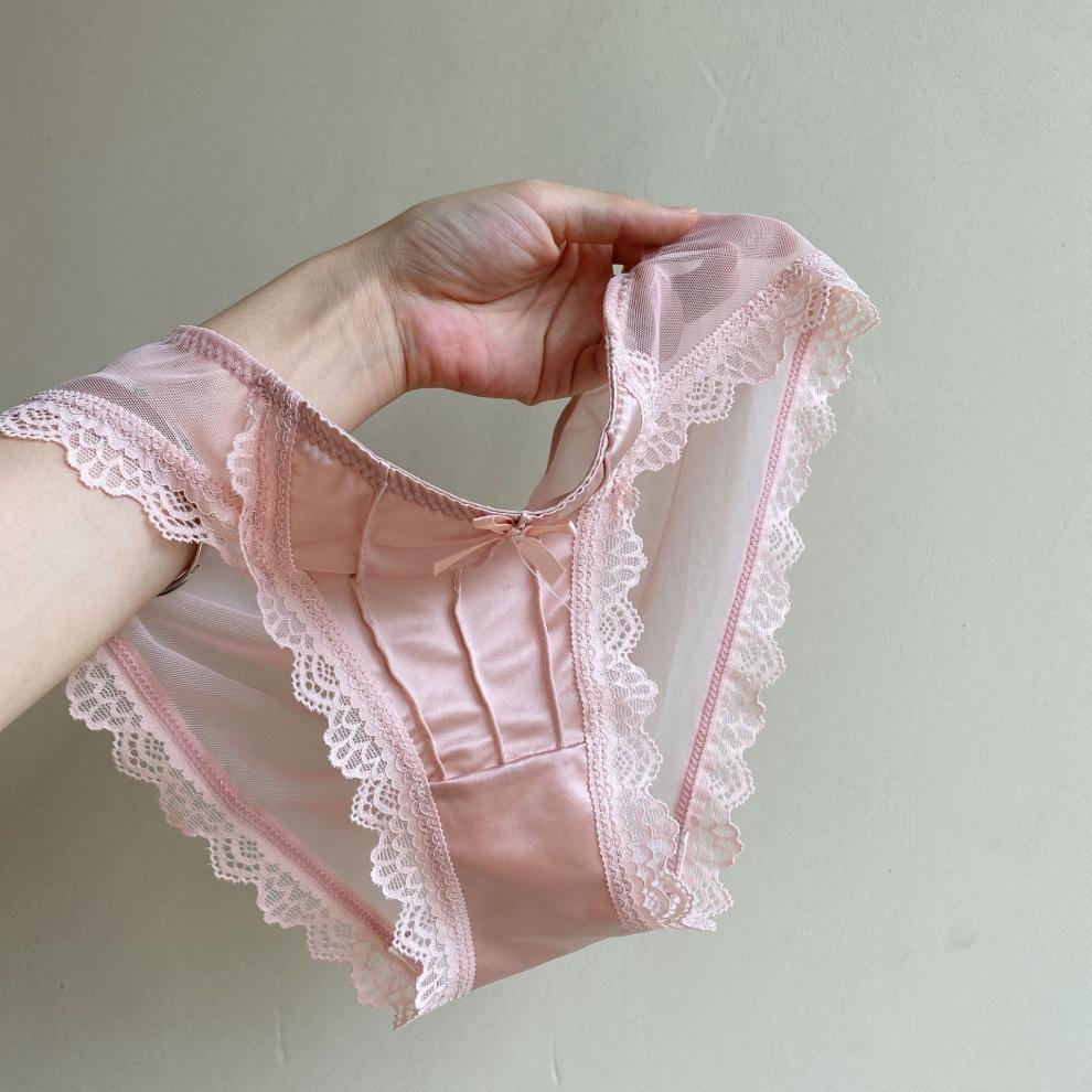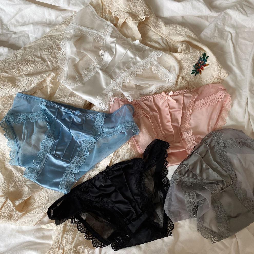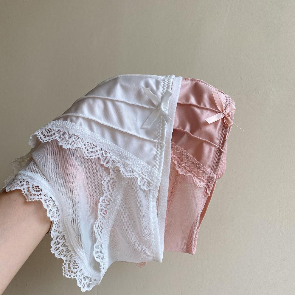 Esmalte de luz de la Luna blanca ~ ropa interior francesa de satén retro de encaje puro sexy para mujer calzoncillos de malla de cintura media delgados