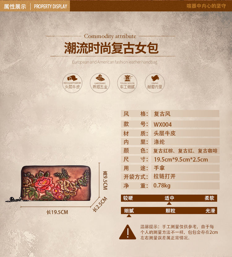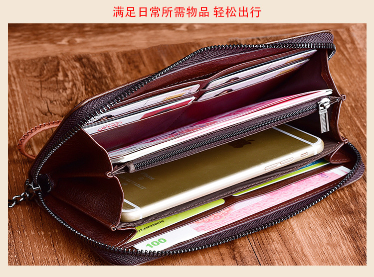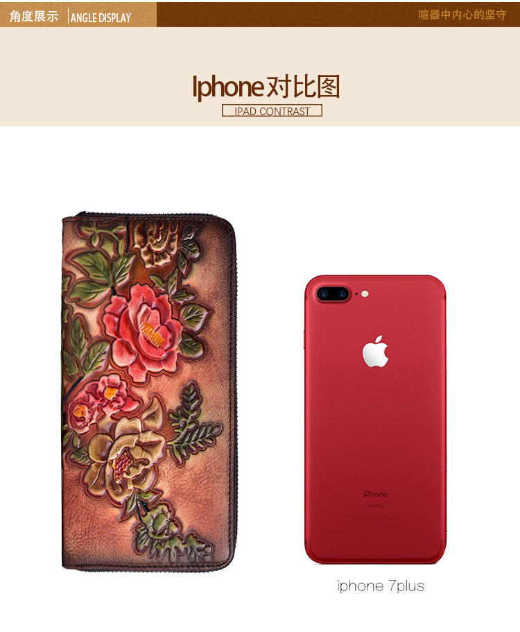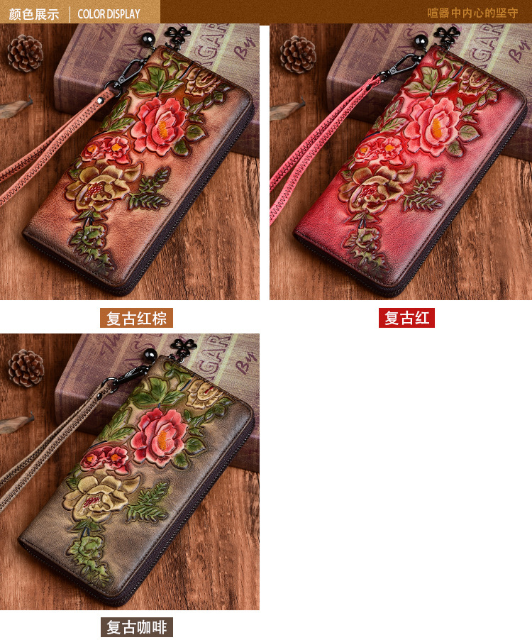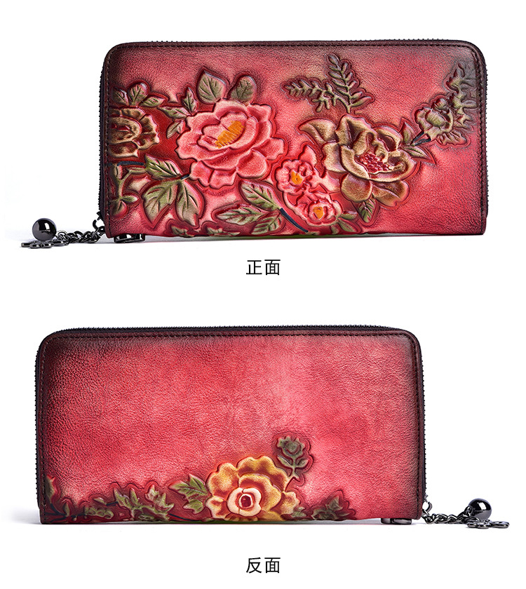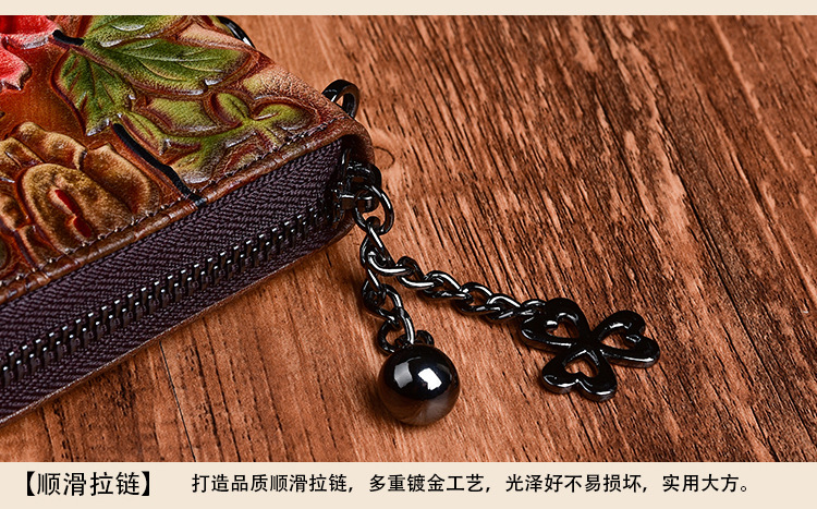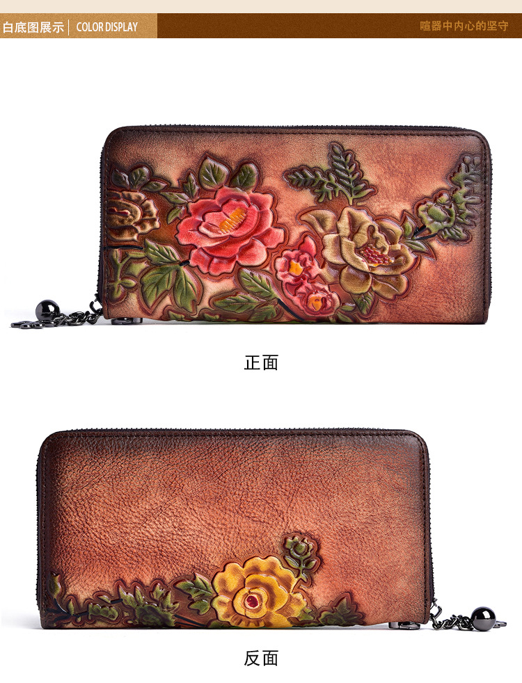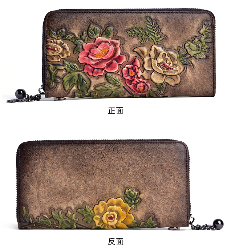 Cartera de mujer de cuero curtido vegetal, bolso largo con cremallera, bolso para teléfono de piel de vacuno de primera capa, diseño vintage de alta gama con relieve.