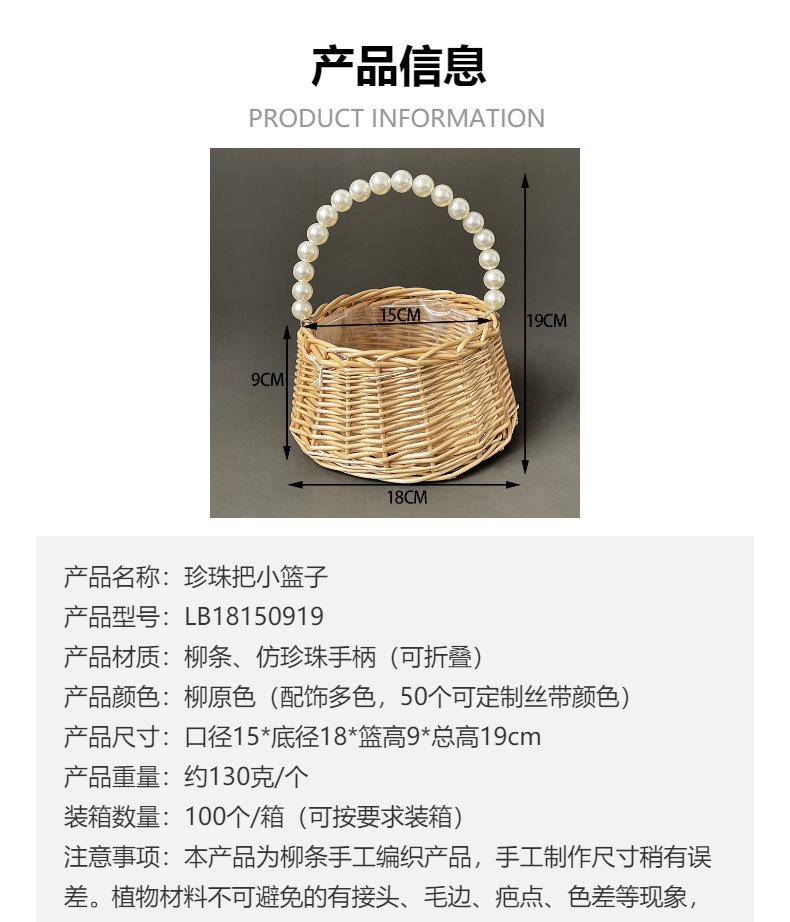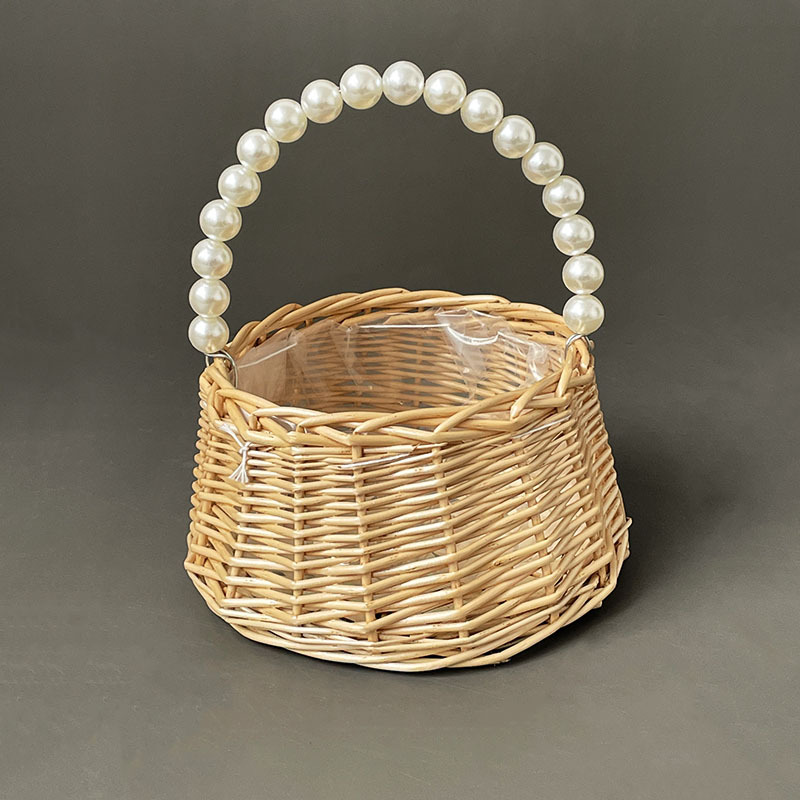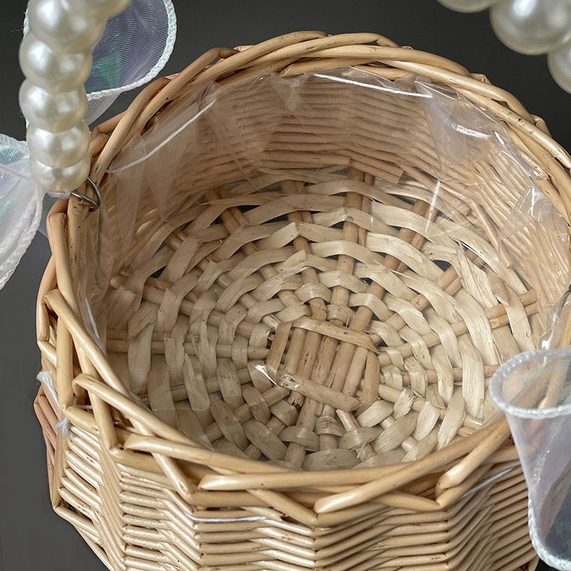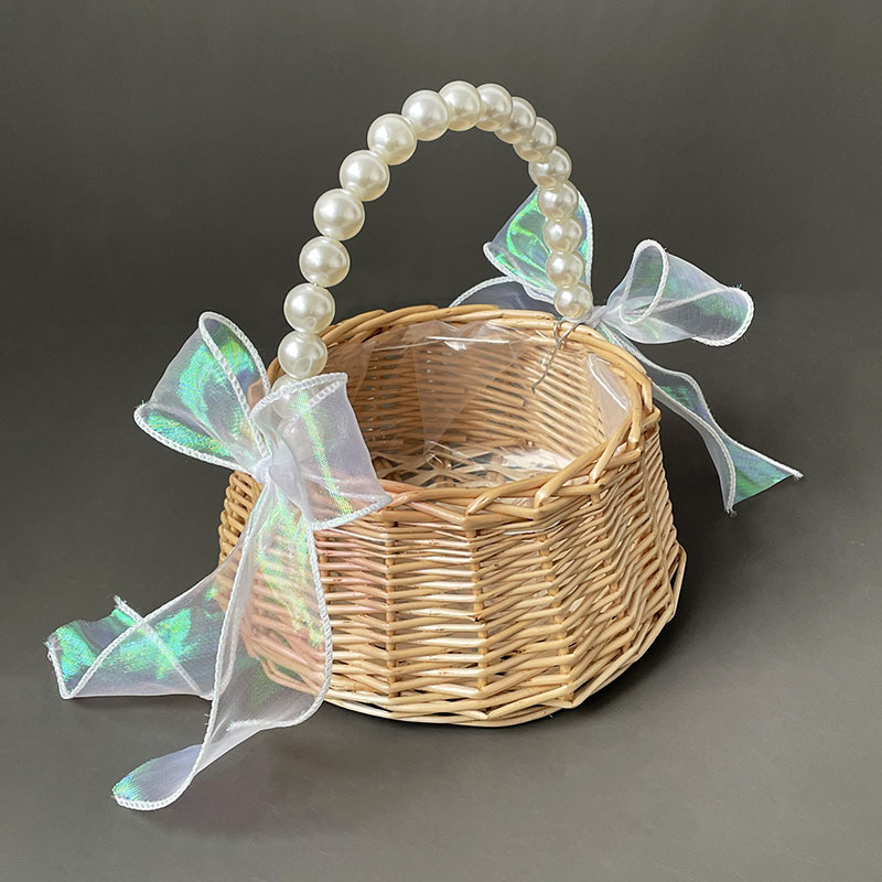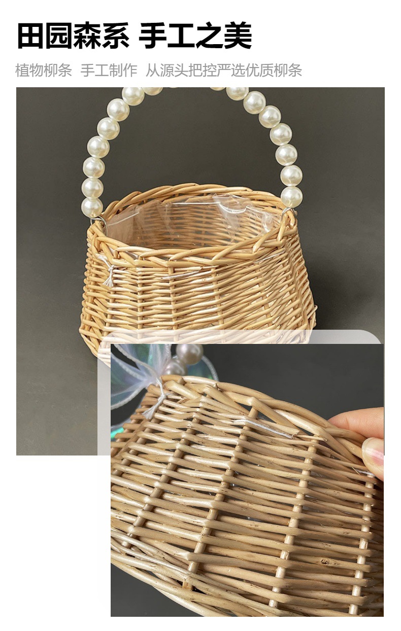 En stock Cesta tejida de mano de perla cesta de regalo de mano bolsa ins estilo dama de honor bambú ratán tejido arreglo floral cesta al por mayor