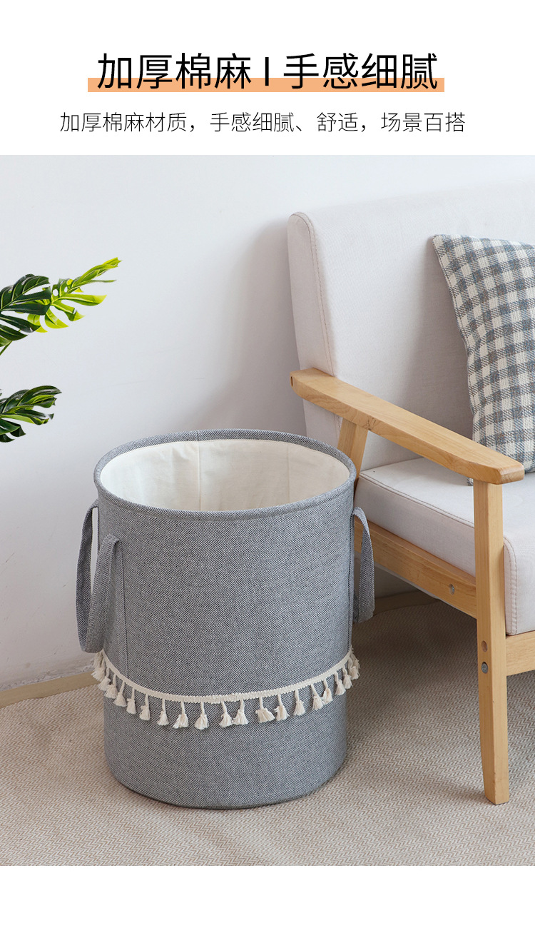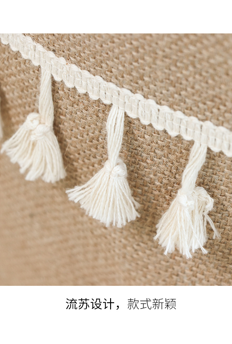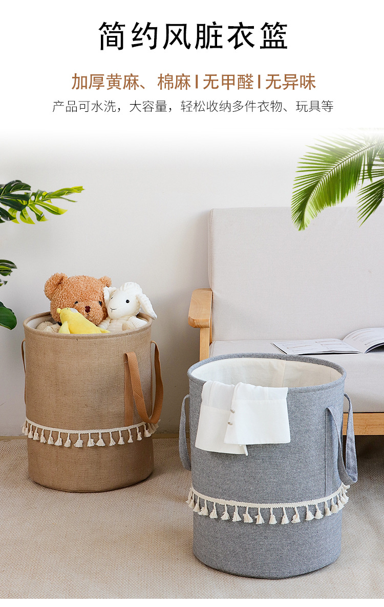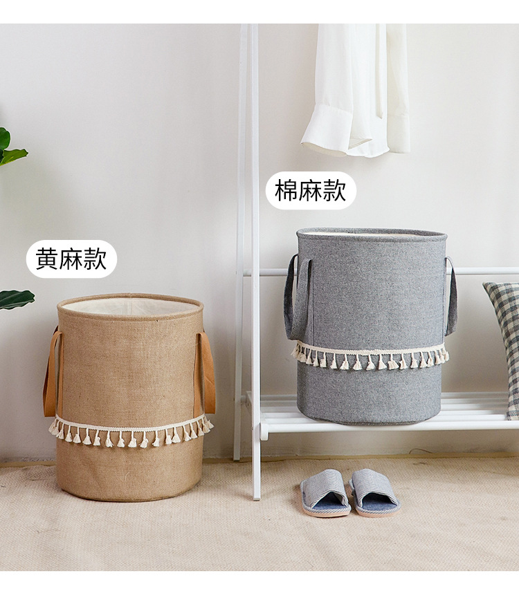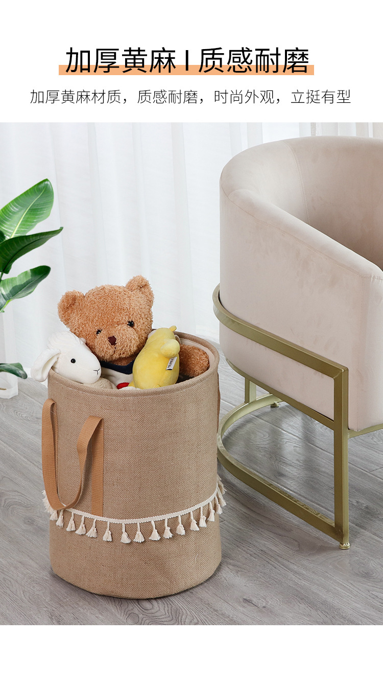 Fábrica de suministro transfronterizo de yute algodón Lino tela Cubo de almacenamiento de juguete plegable cesta de almacenamiento de artículos diversos entrega de estilo borla