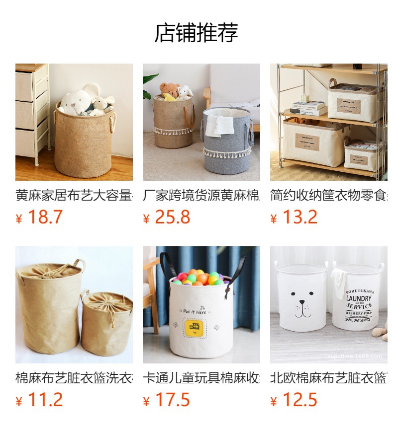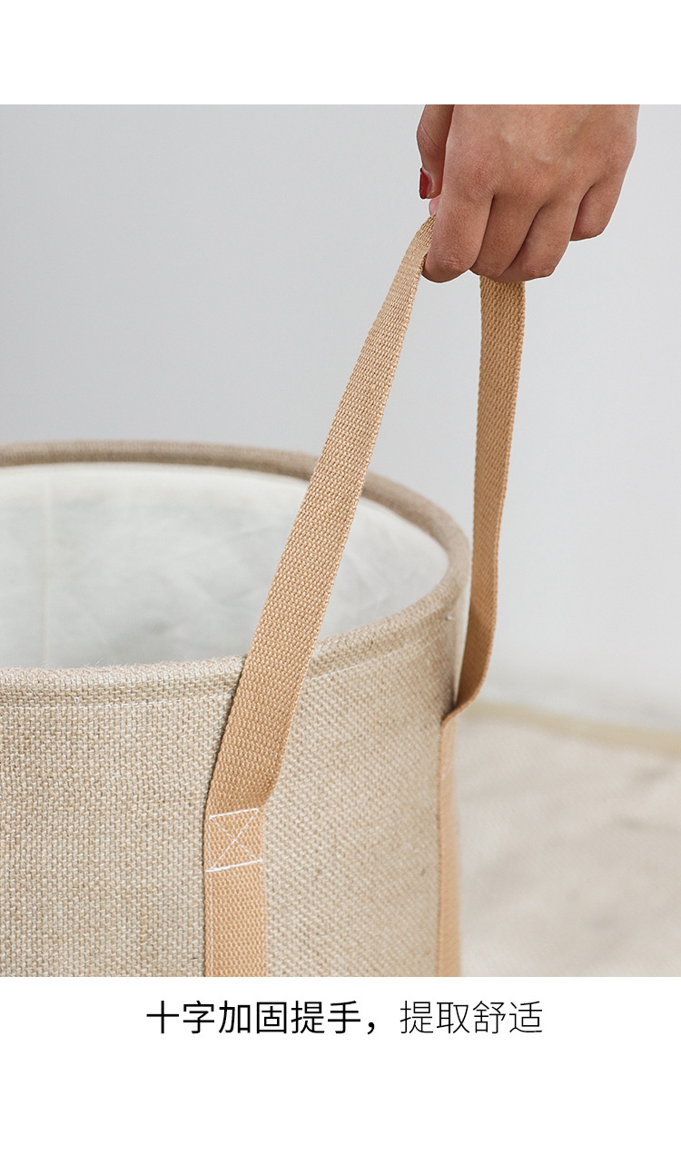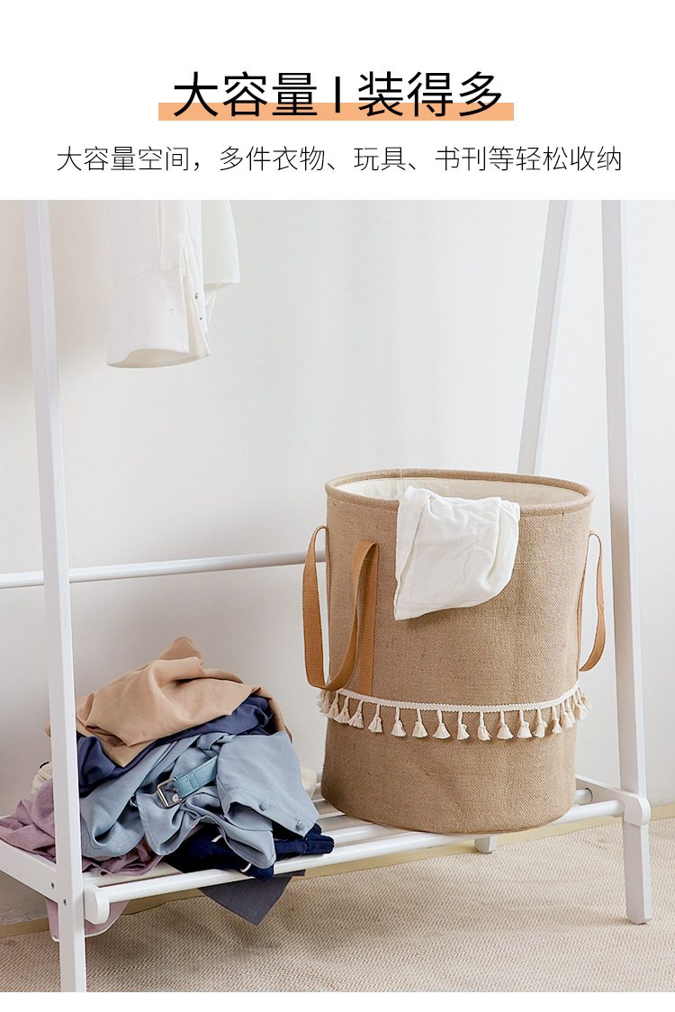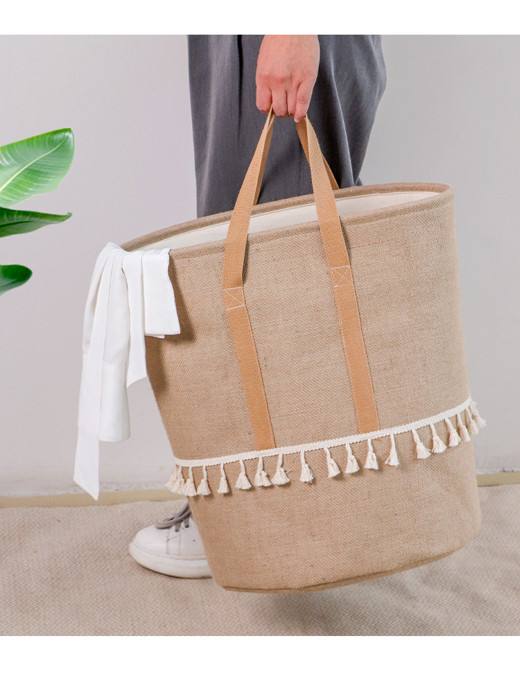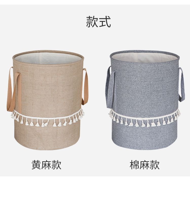 Fábrica de suministro transfronterizo de yute algodón Lino tela Cubo de almacenamiento de juguete plegable cesta de almacenamiento de artículos diversos entrega de estilo borla
