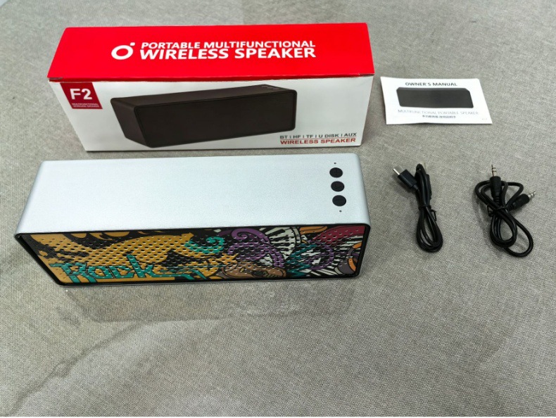 En stock F2 creativo mini tarjeta de audio inalámbrica graffiti pintado pesado subwoofer nuevo altavoz Bluetooth al por mayor