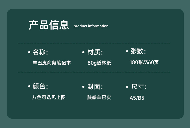 | Especificación | A6(95*175mm)100 hojas,A5 (145*210 mm) 100 hojas,A5 (145*210 mm) 180 hojas,B5 (175*250mm) 180 hojas |