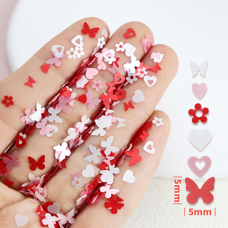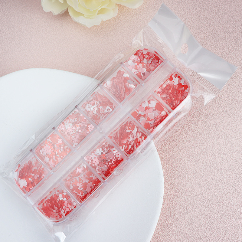 Día de San Valentín 12 cuadros en caja perlado amor accesorios de uñas rosa mariposa blanca flor uñas lentejuelas decoración de colores